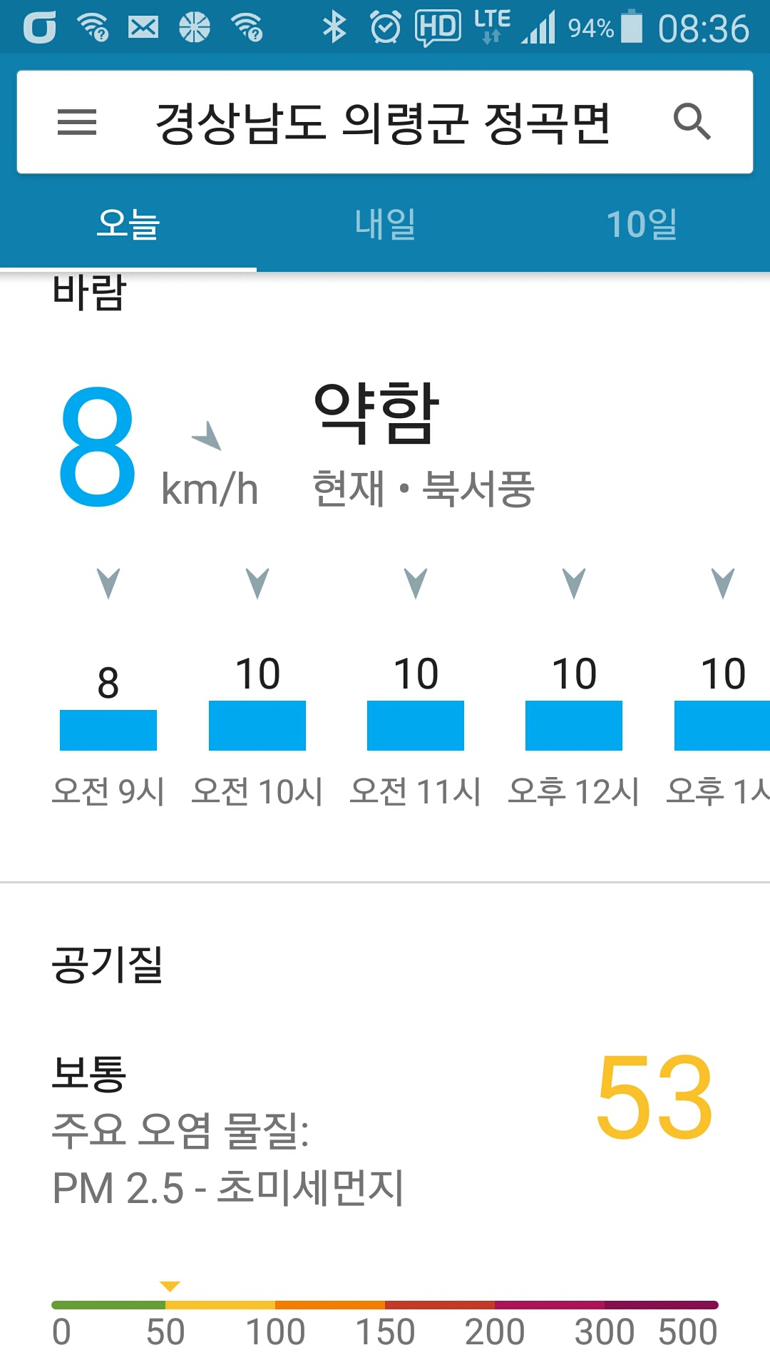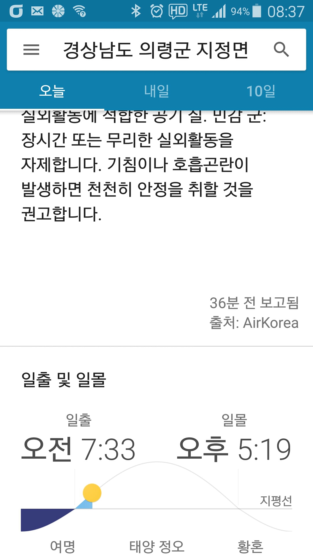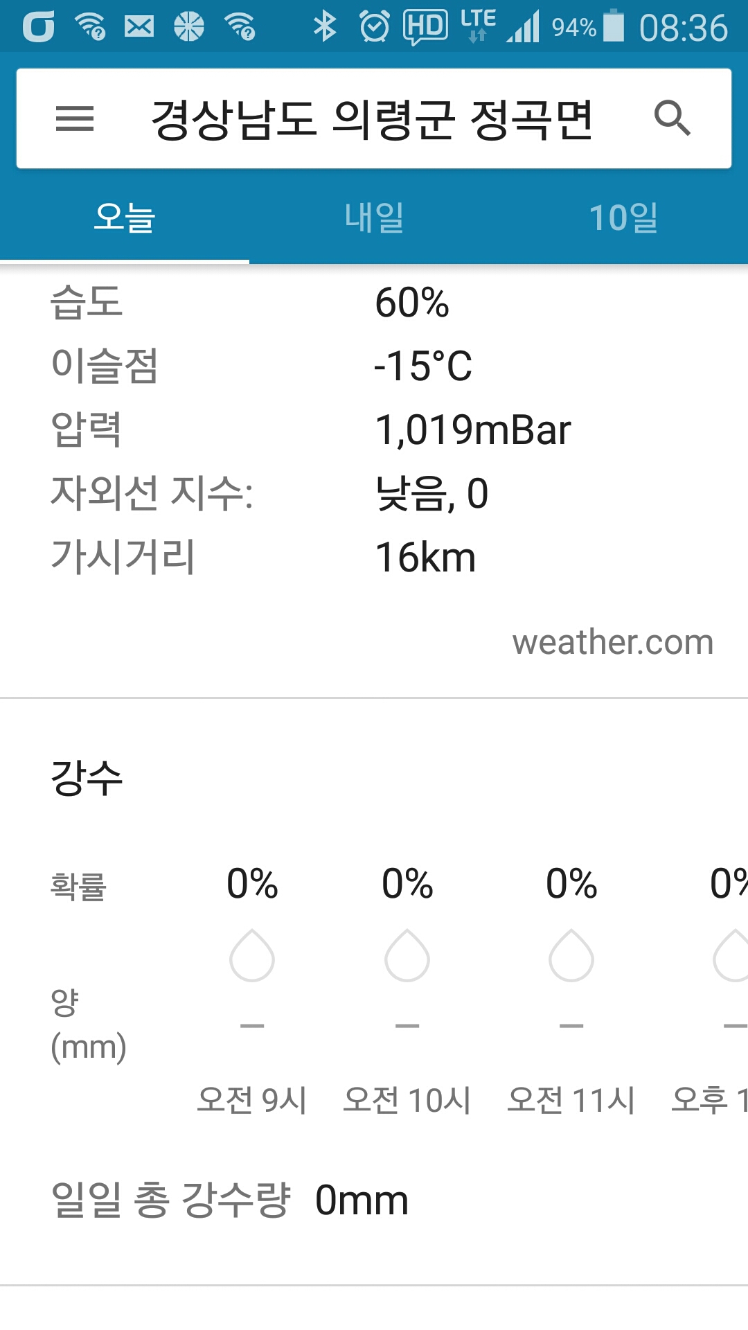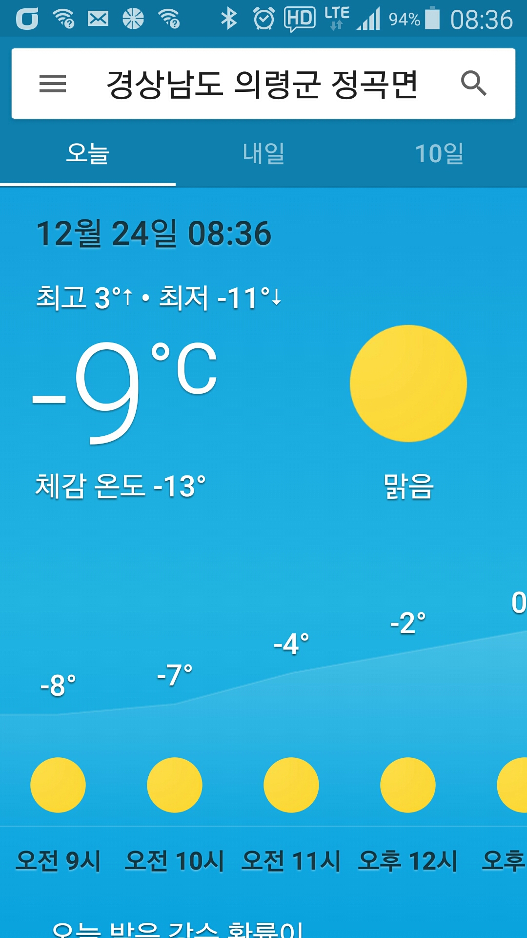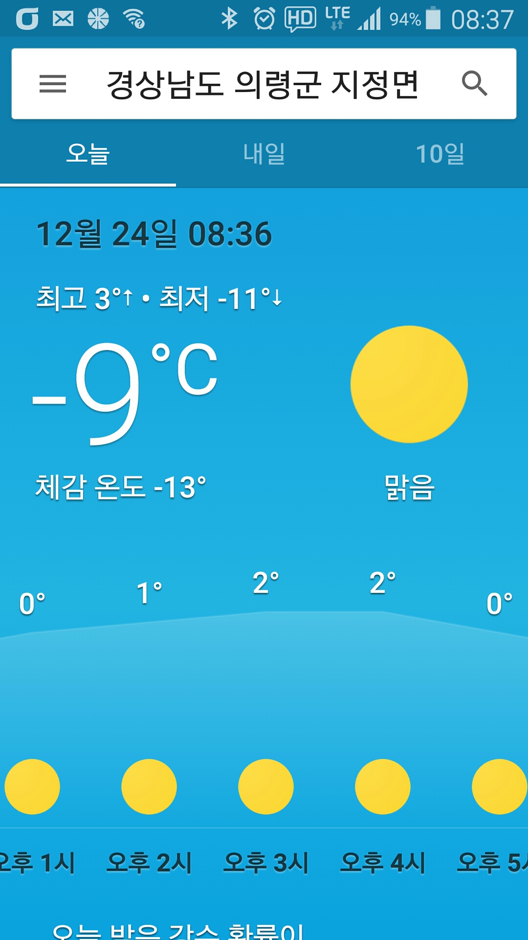- 기상 : -9˚ ~ 2˚, 습도 60%, 바람 8~10(약함), 공기질 53(보통), 일몰 17시19분