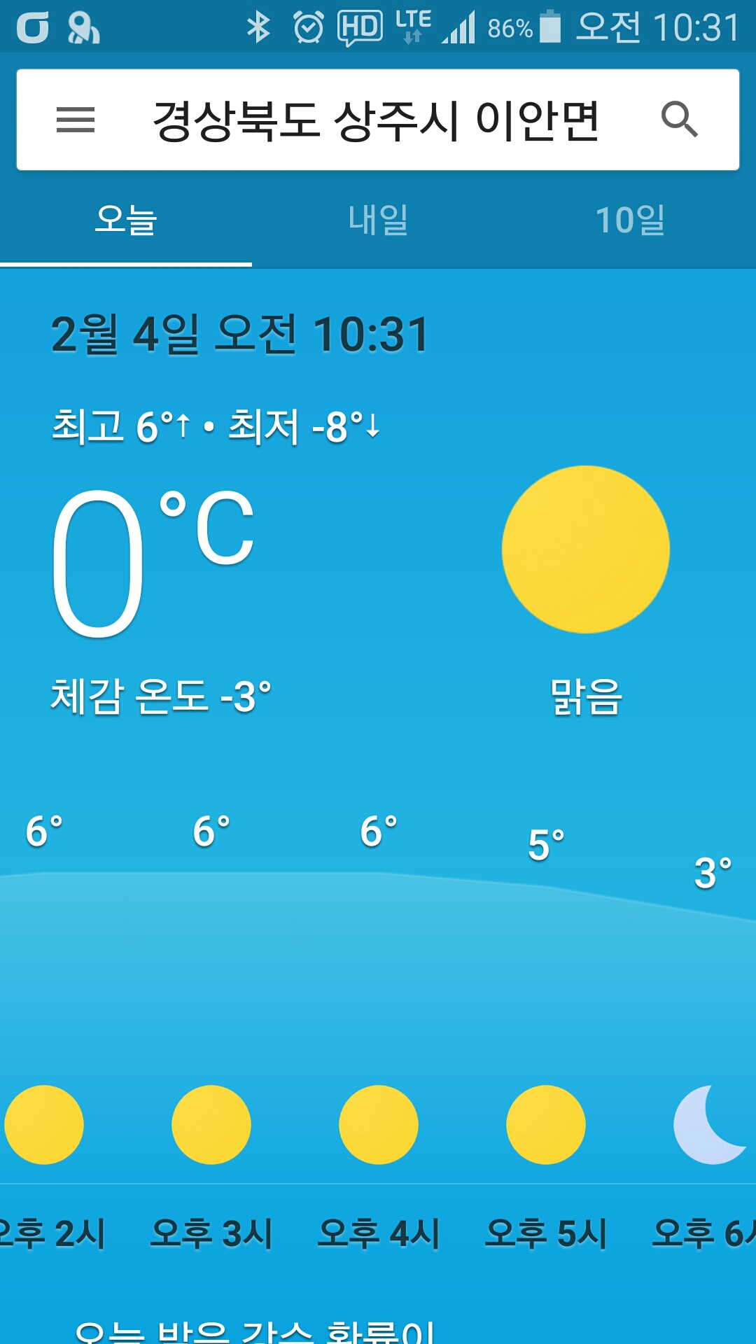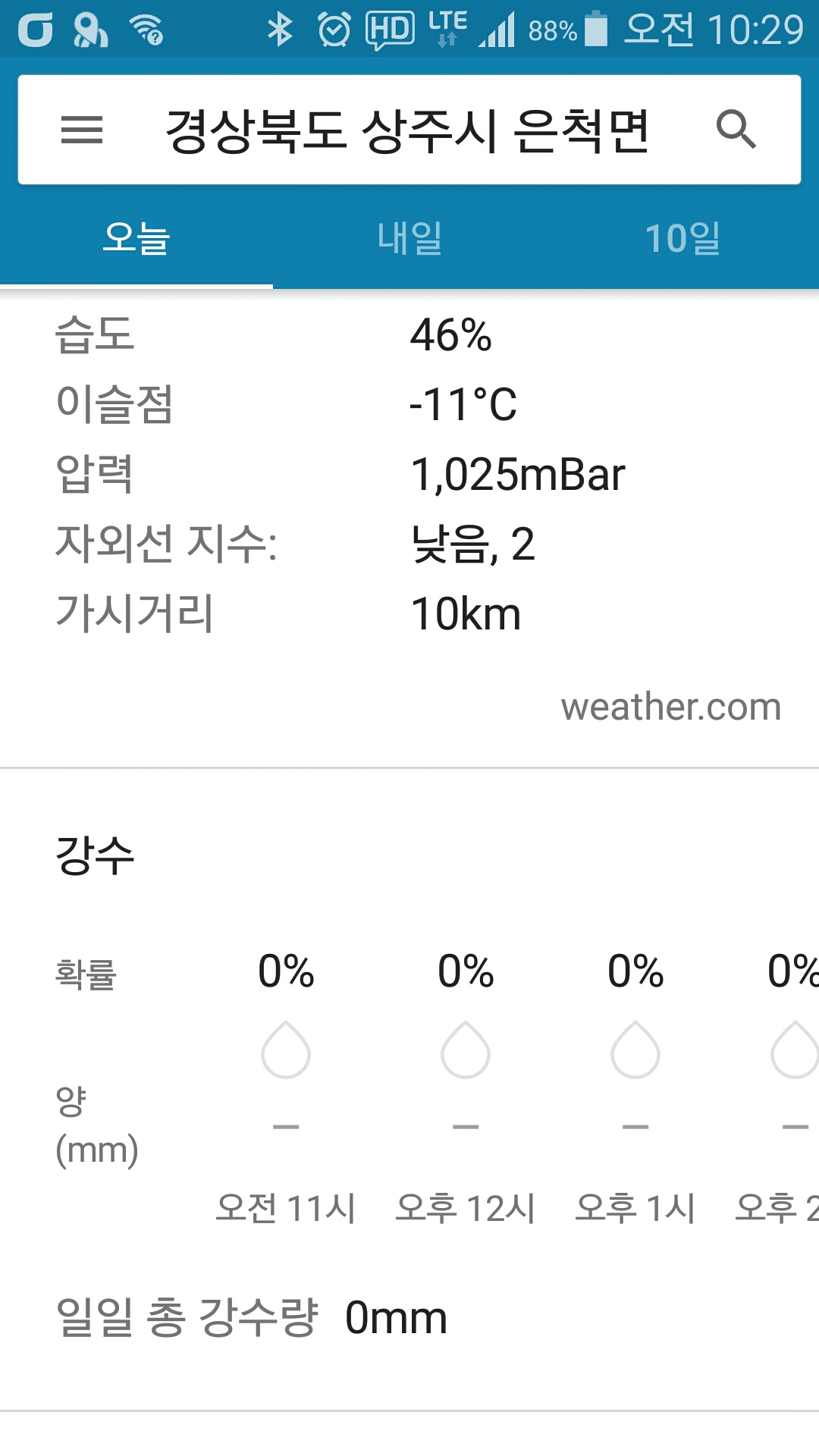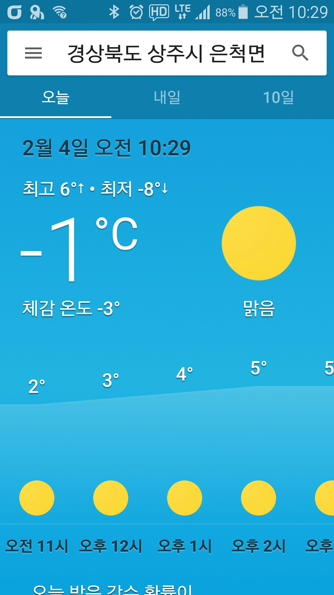 - 기상 : -1˚ ~ 6˚, 습도 46%, 바람 8~14(약함), 공기질 72(보통), 일몰 17시56분