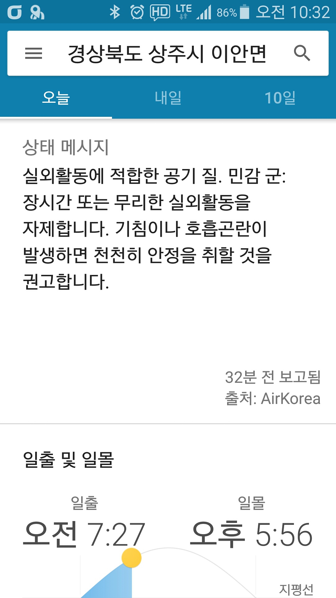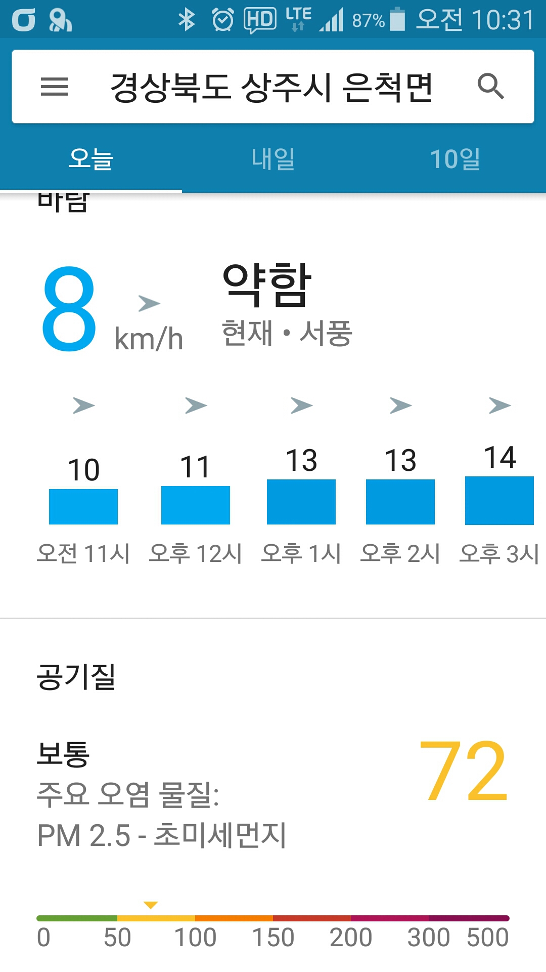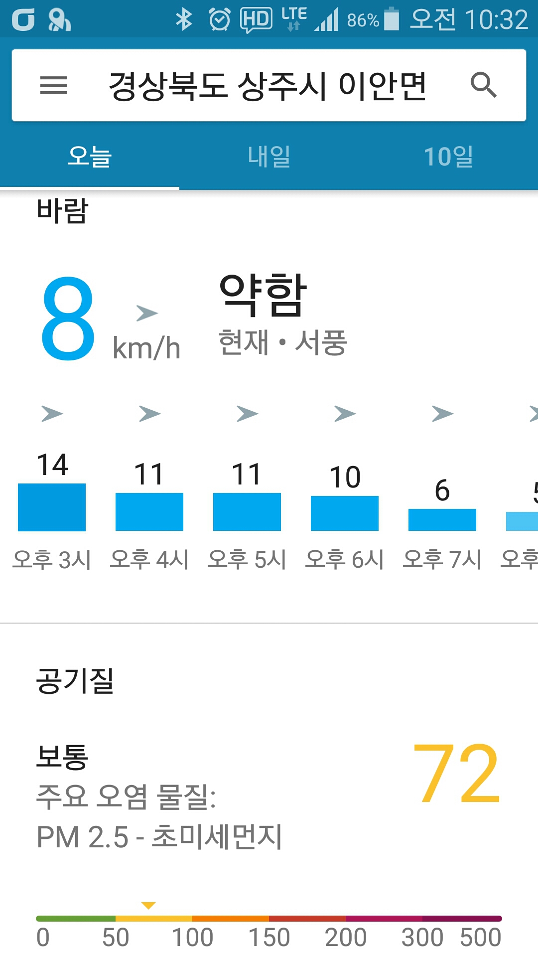 - 기상 : -1˚ ~ 6˚, 습도 46%, 바람 8~14(약함), 공기질 72(보통), 일몰 17시56분