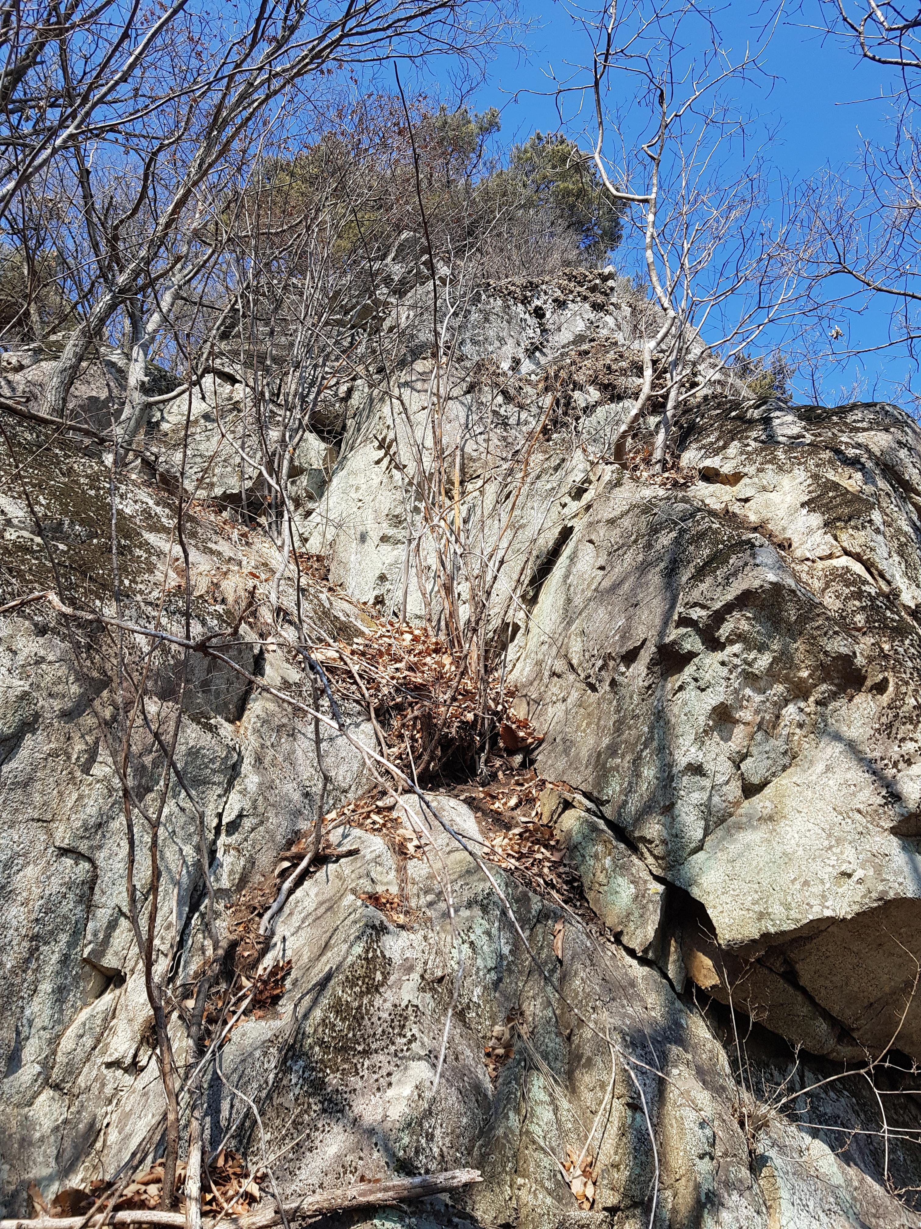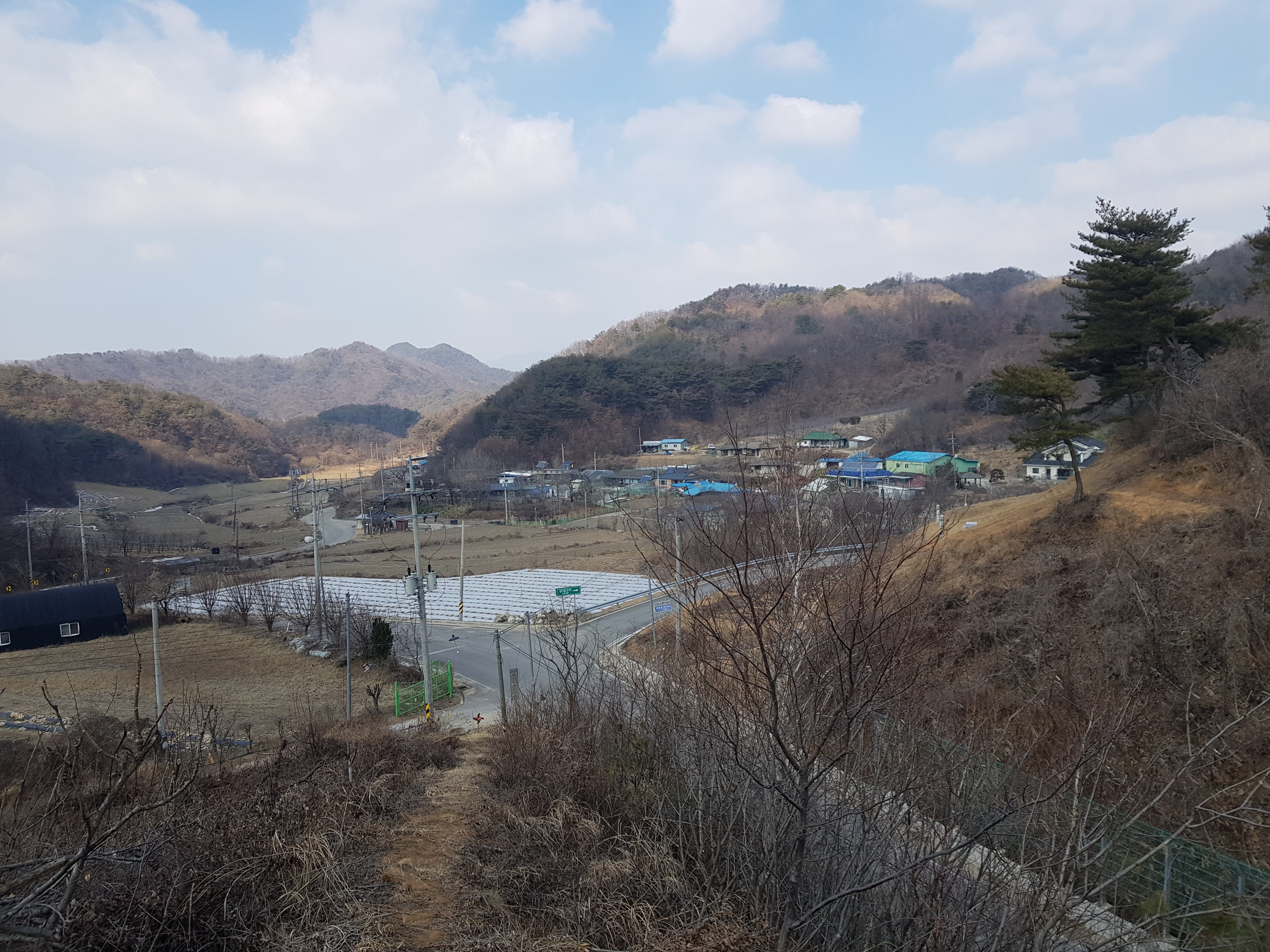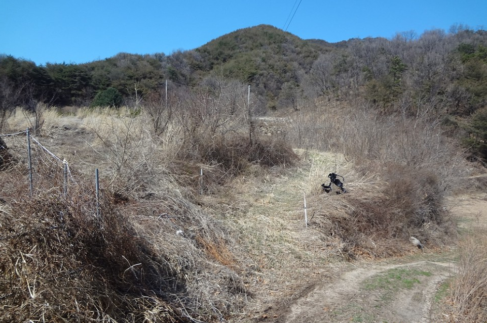 12:21 개인사유지內인것 같습니다. 그냥 나대지이고 좌측으로 과수원 돌담이 맥길인것 같은데 생략하고 질러가는데 누군가 소리 칩니다. 과수원에서 영감님이 길이 없다며 등산로 안내판을 못봤냐며 혼내네요. 미안하다하는데 계속 잔소리 합니다. 걍 무시하고 내 갈길 갑니다. 잠시후 개소리가 들립니다. 영감님 열받았다고 개푼건 아니죠.. 정상적인 작약산 등산로는 갈티재에서 마을길을 따라 있습니다