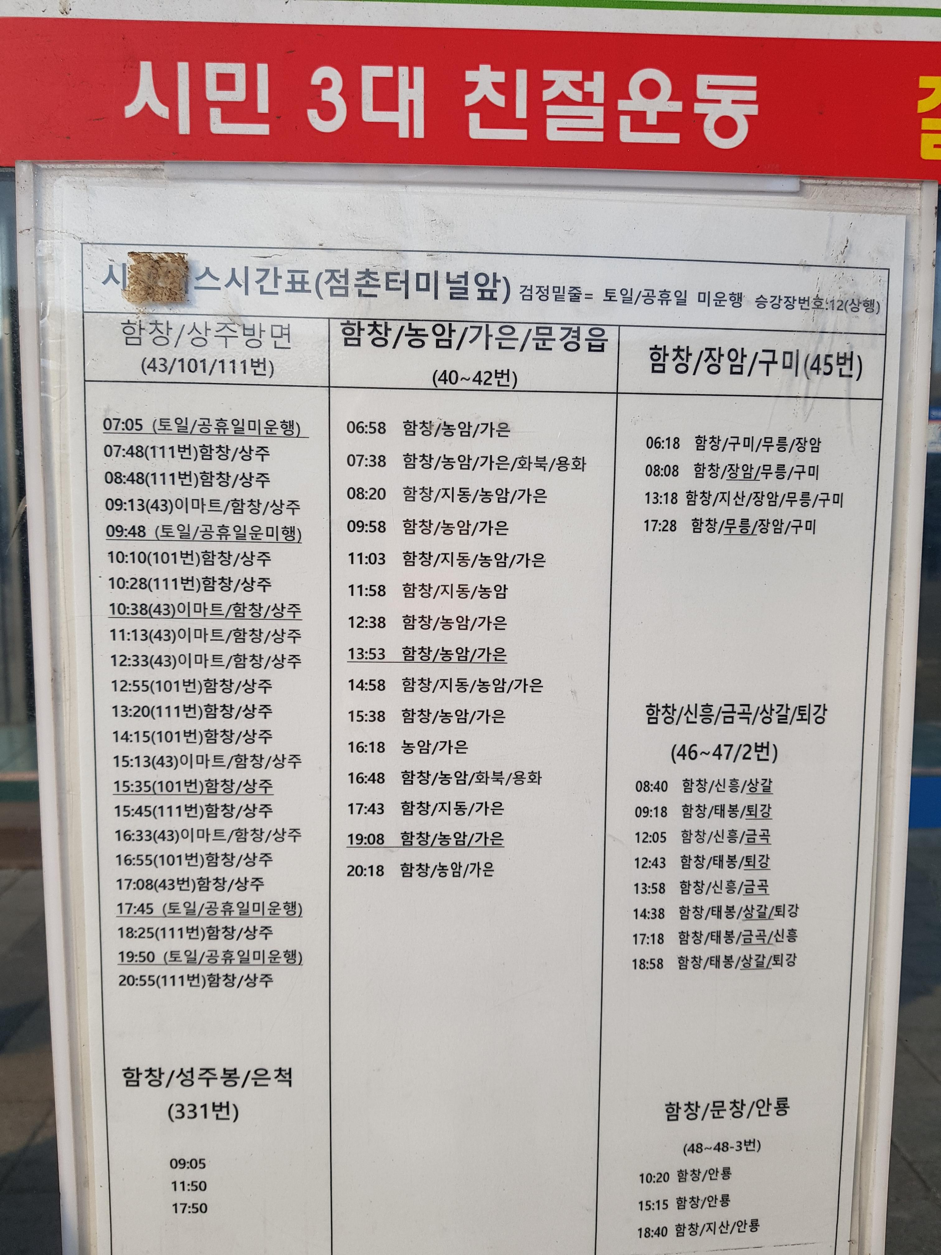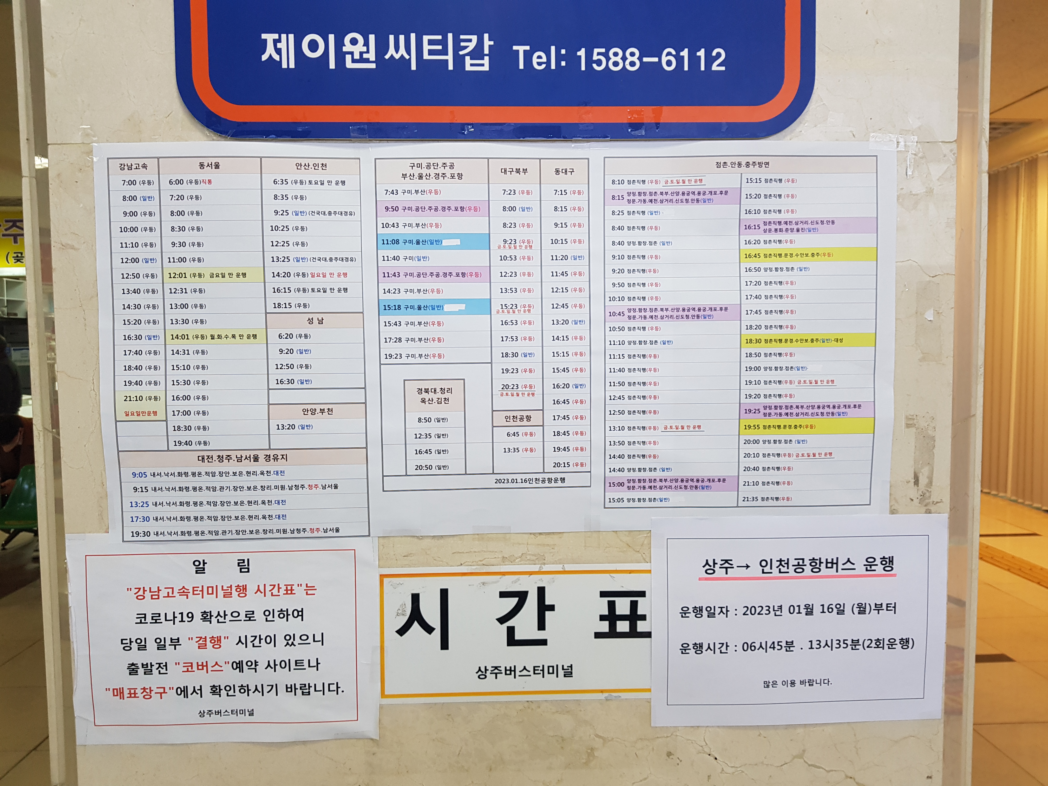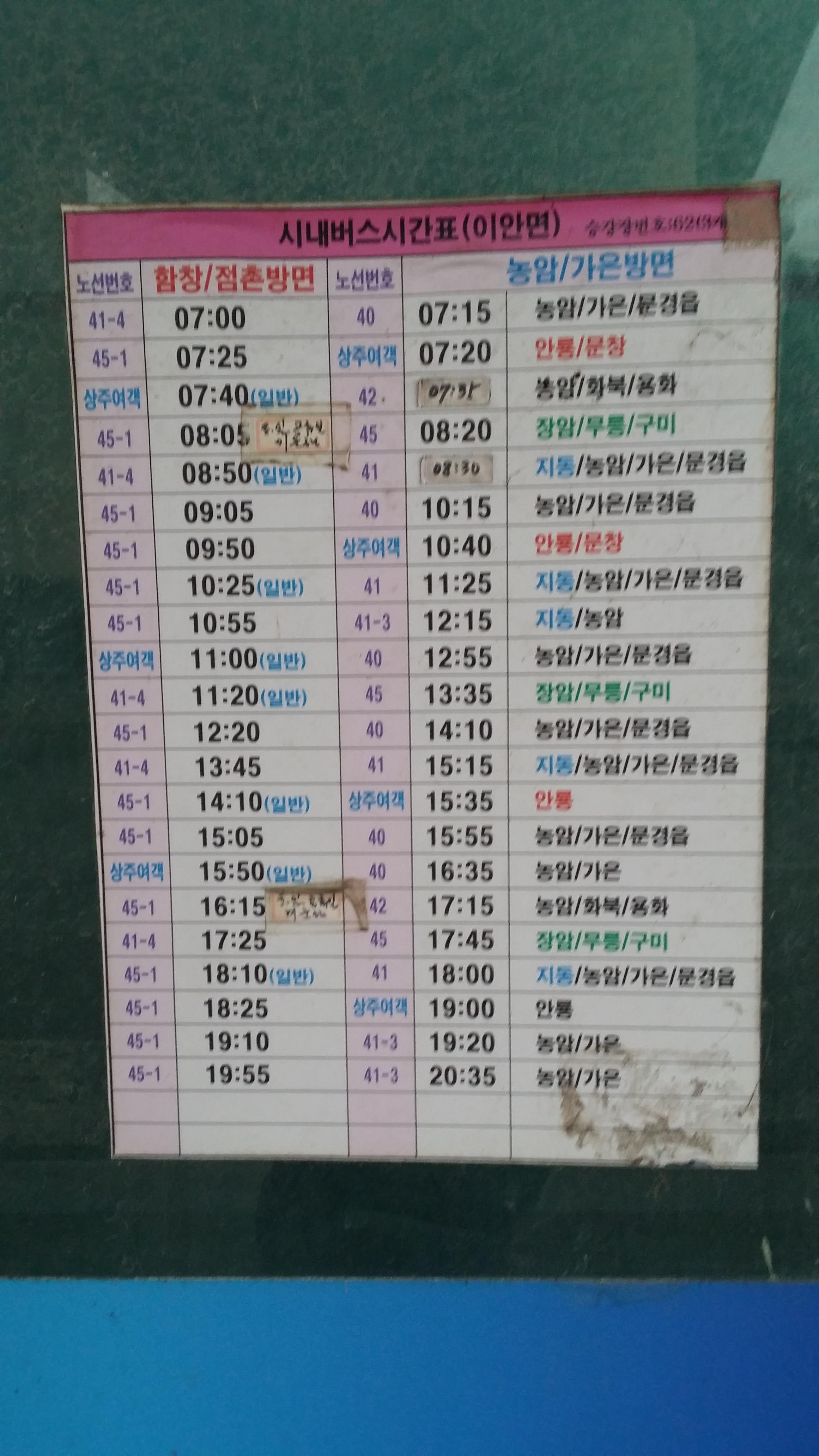 상주터미널을 경유하여 점촌으로 향하는데, 여유있게 도착하여 상주터미널 운행시간표를 찍는다
