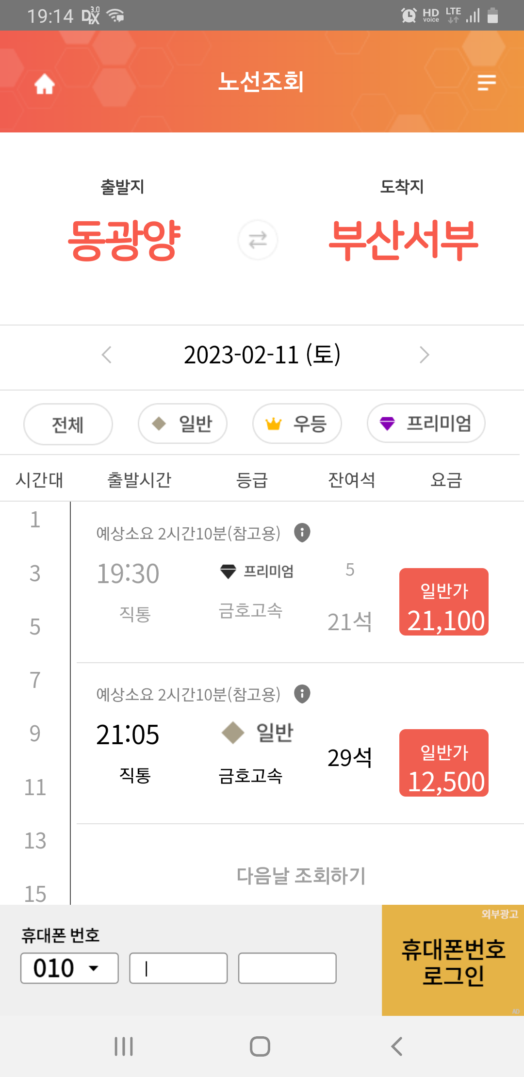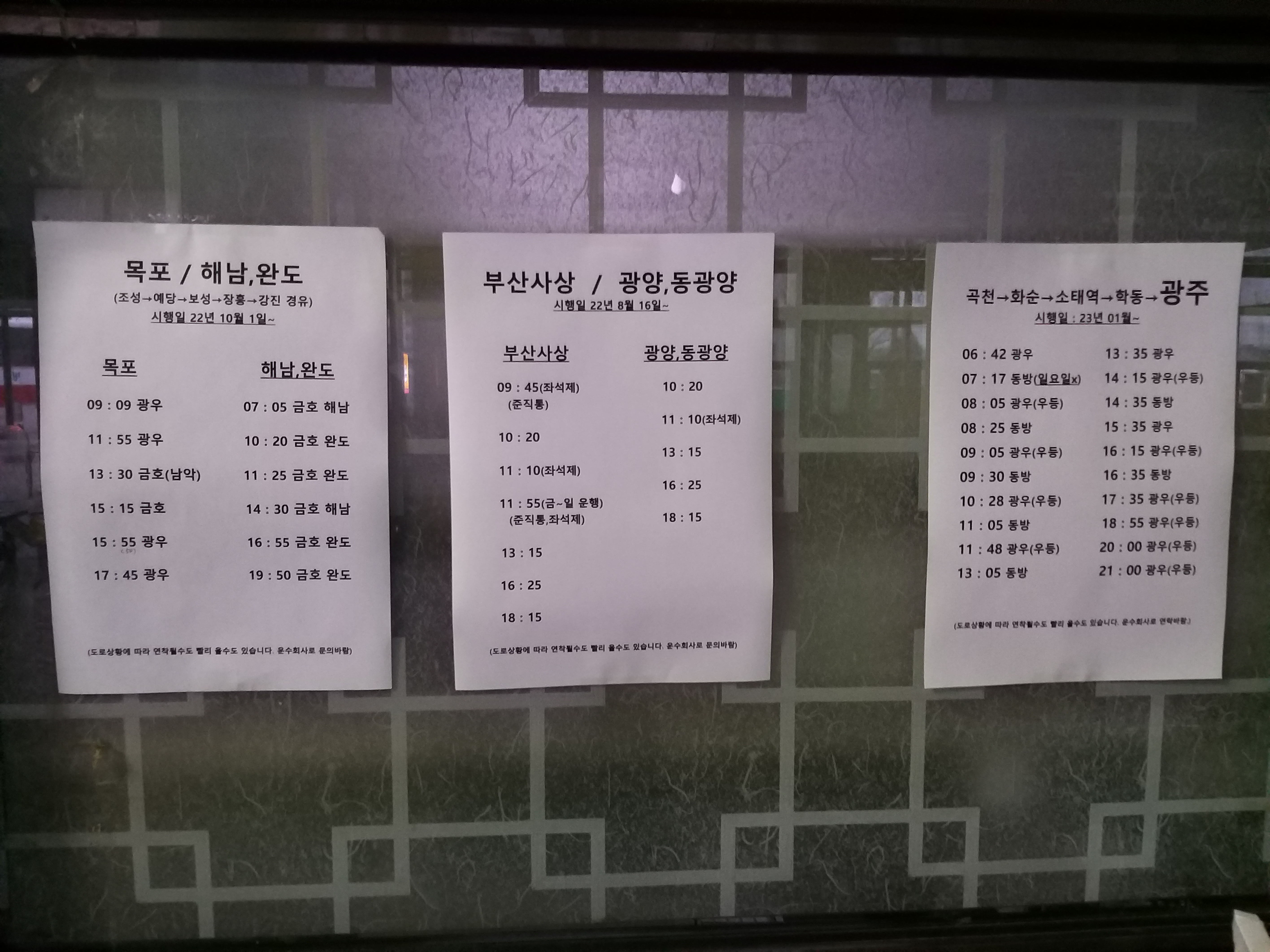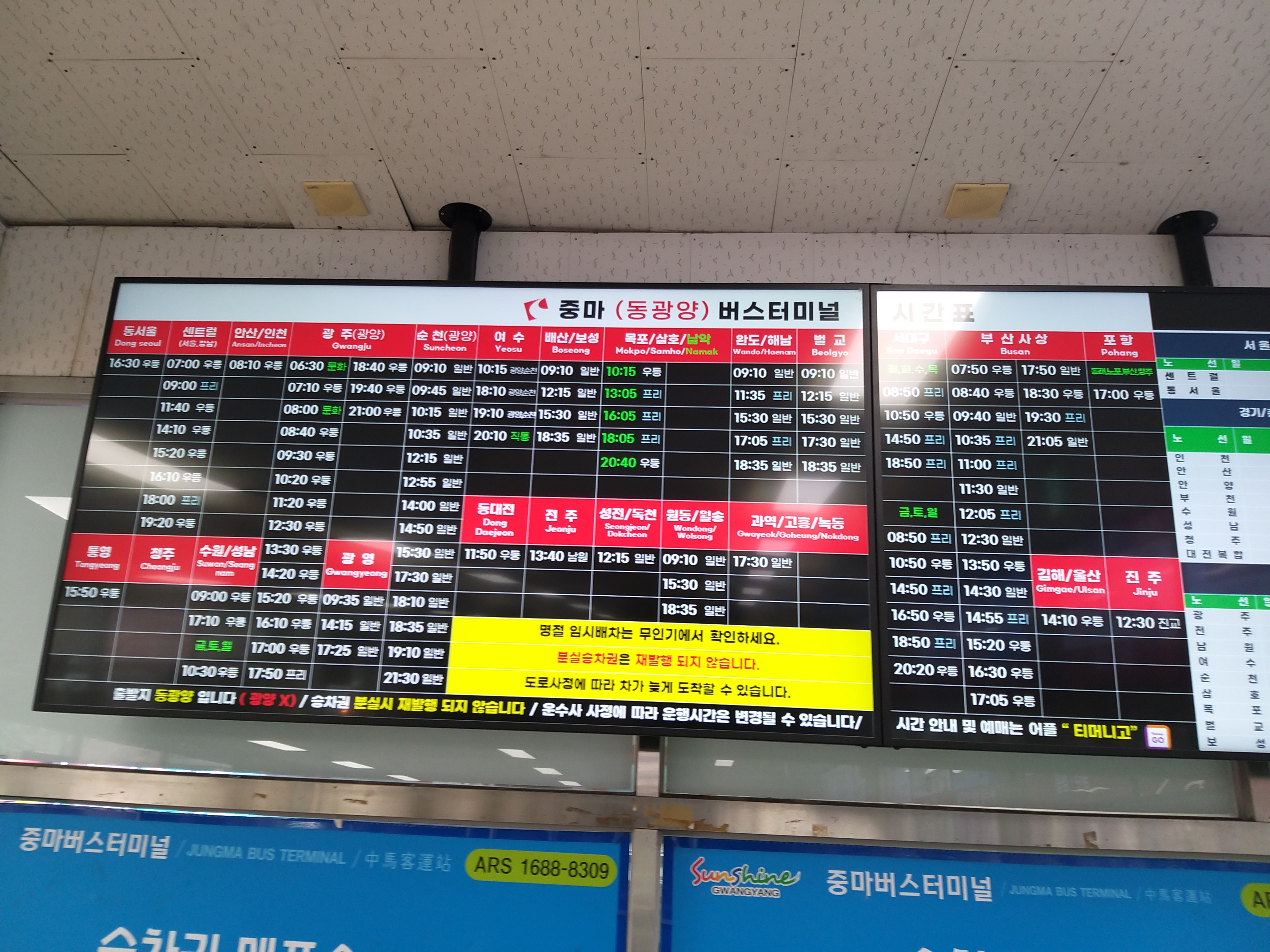어 이버스가 광양, 동광양터미널을 경유하는데 터미널에 비치된 시간표엔 없는 유령? 버스다. 이놈 때문인가 10분전에 출발하는 프리미엄 버스는 거의 만석인데, 동 버스는 헐렁하다