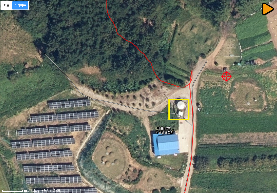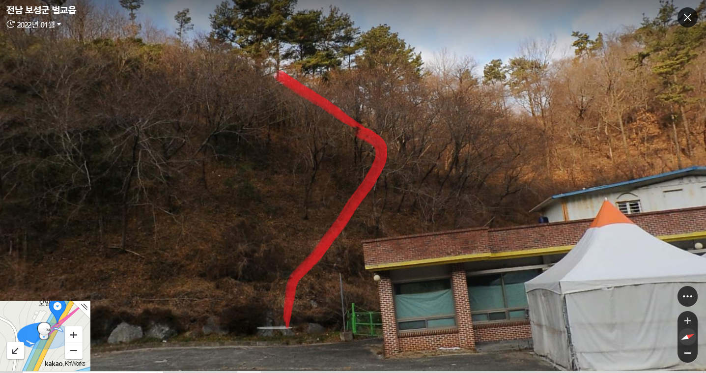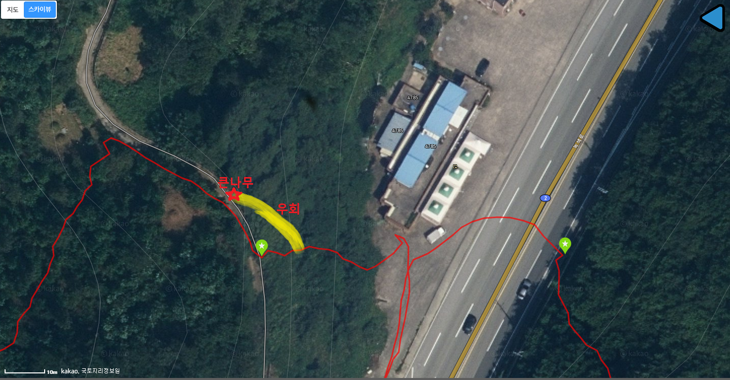 노란 굵은선 따라 우회하는게 맞는데, 역방향으로 하산시 도로 따라 내려서다 큰나무가 보이면 진입하면 된다