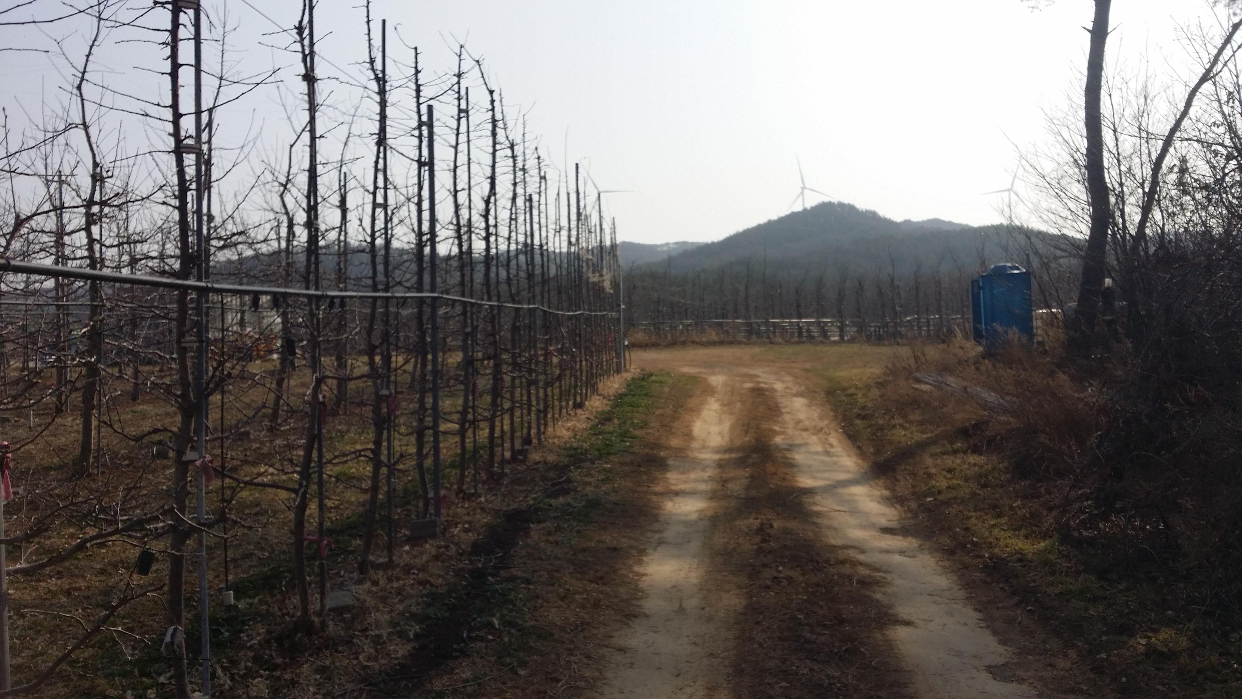 09:44 원고개에서 밭 울타리를 2군데 월담하고, 사과밭을 가로지른다. 수확기엔 가장자리를 따라 우회해야 할듯