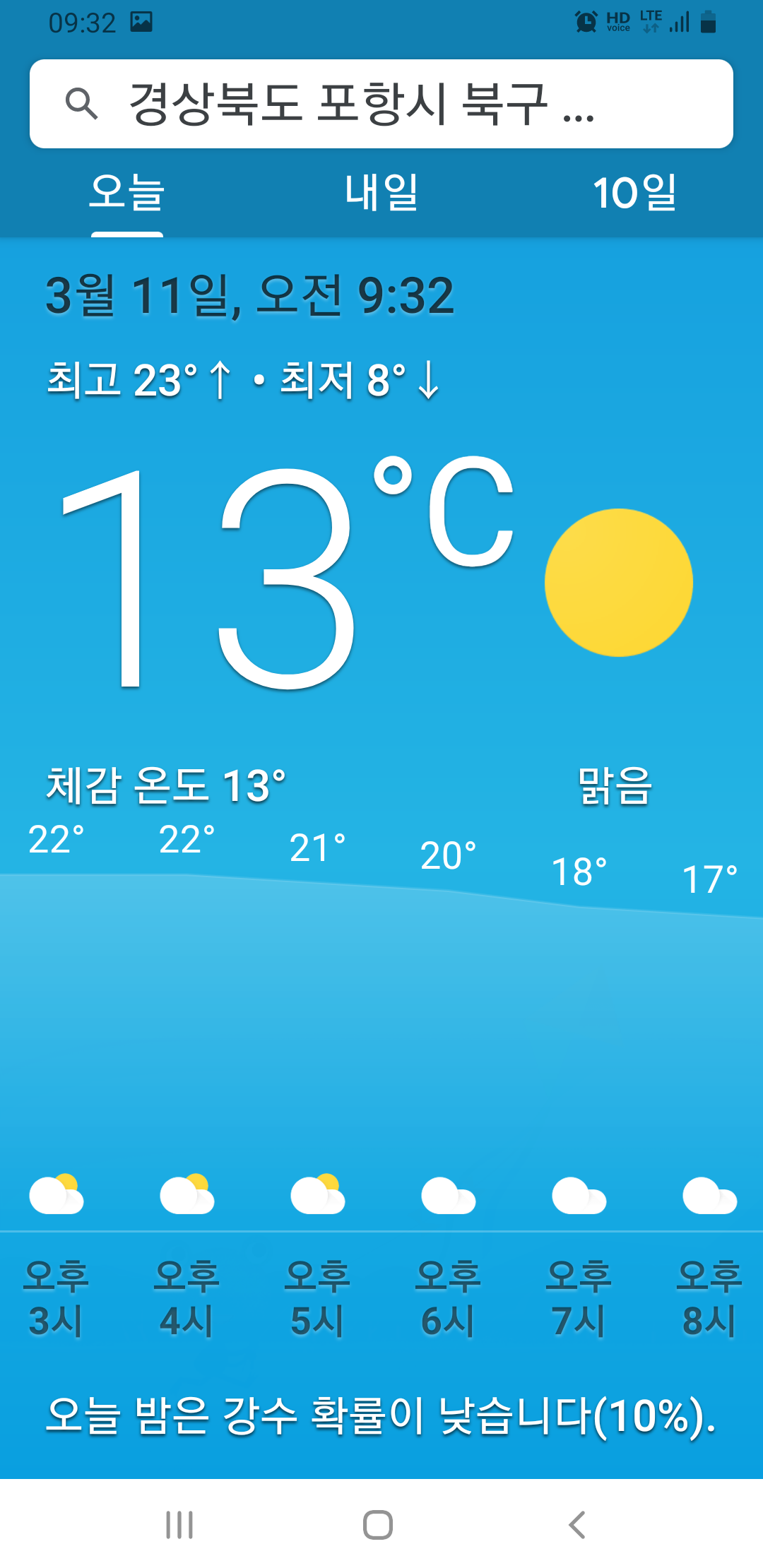 - 기상 : 13˚ ~ 25˚, 습도 63%, 바람 8~11(약함), 공기질 115(민감군에 해로움), 일몰 18시26분