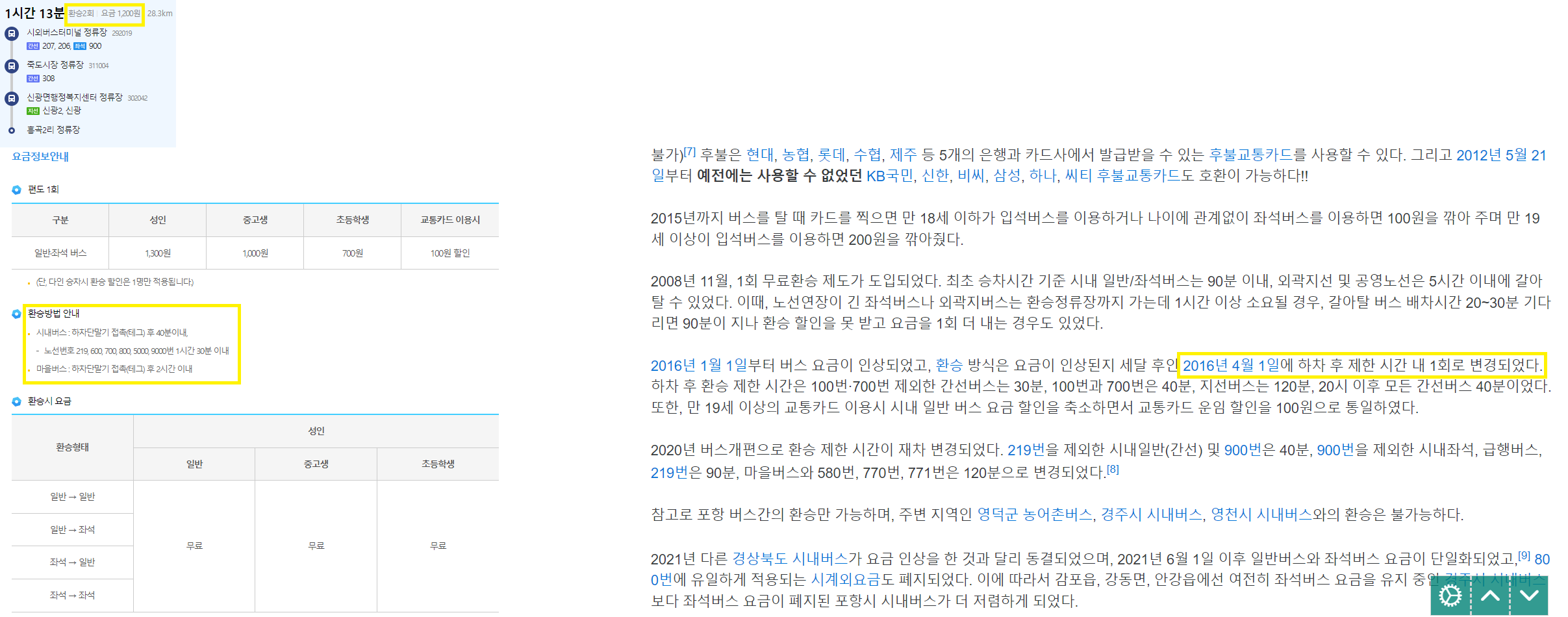 포항 시내버스 환승은 몇회까지 가능 할까? 다음 포탈은 2회도 가능하다 했는데, 포항시 홈피는 이바구도 없고, 1회만 가능 한것 같다. 신광 마을버스를 태그하니 요금이 찍혔다(카드사 교통카드 이용 현황엔 요놈이 아직 안올라와서 확인 불가)