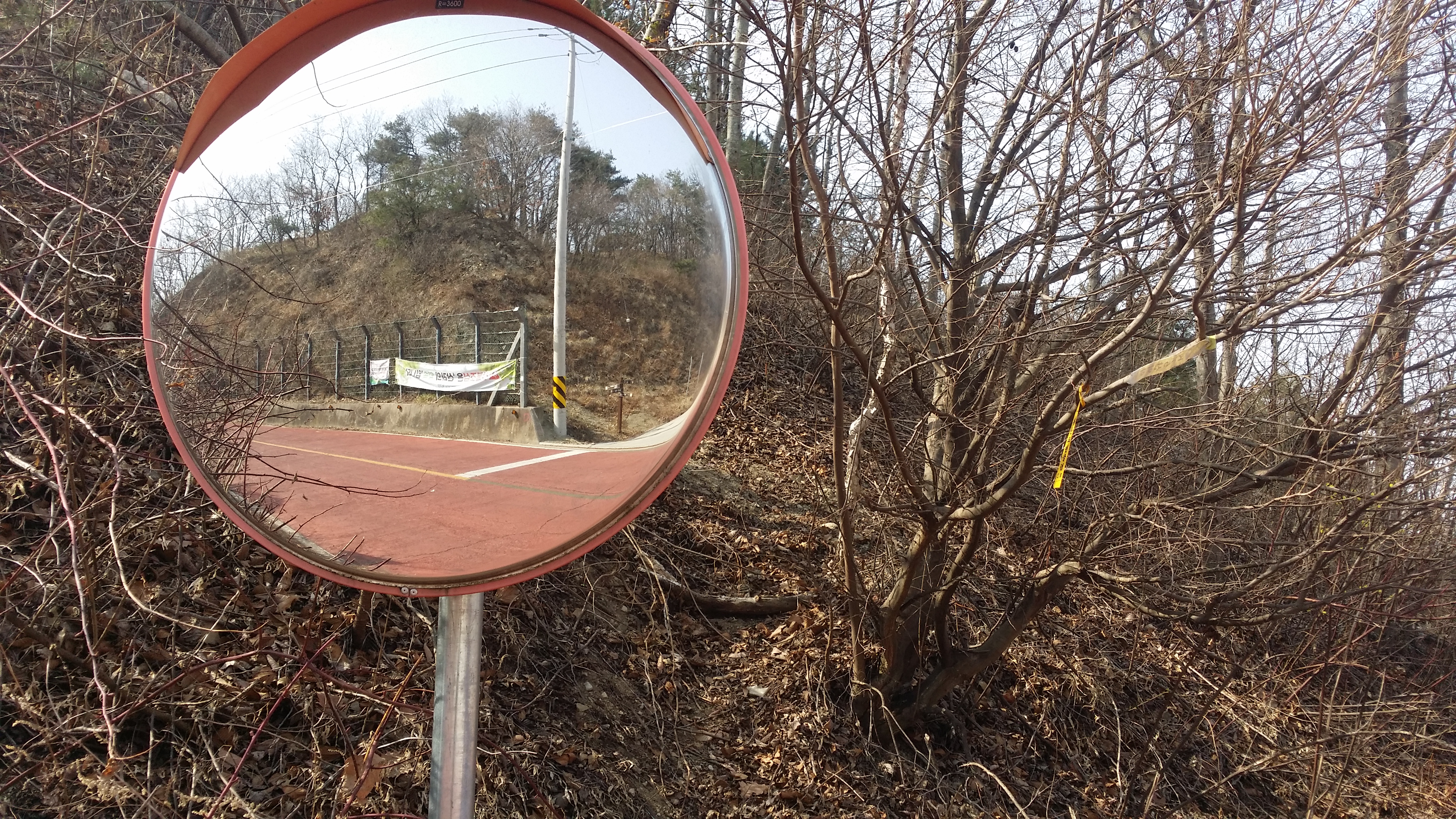 옹벽이 높아 반사경을 잡고 올라선다