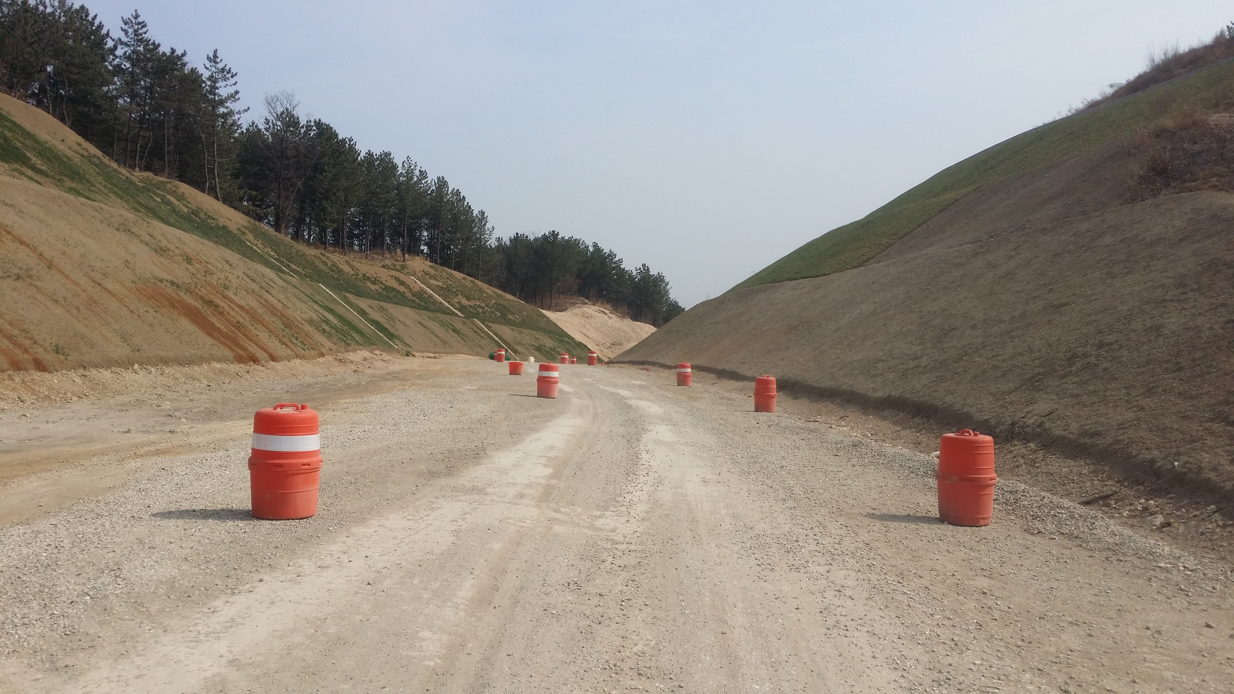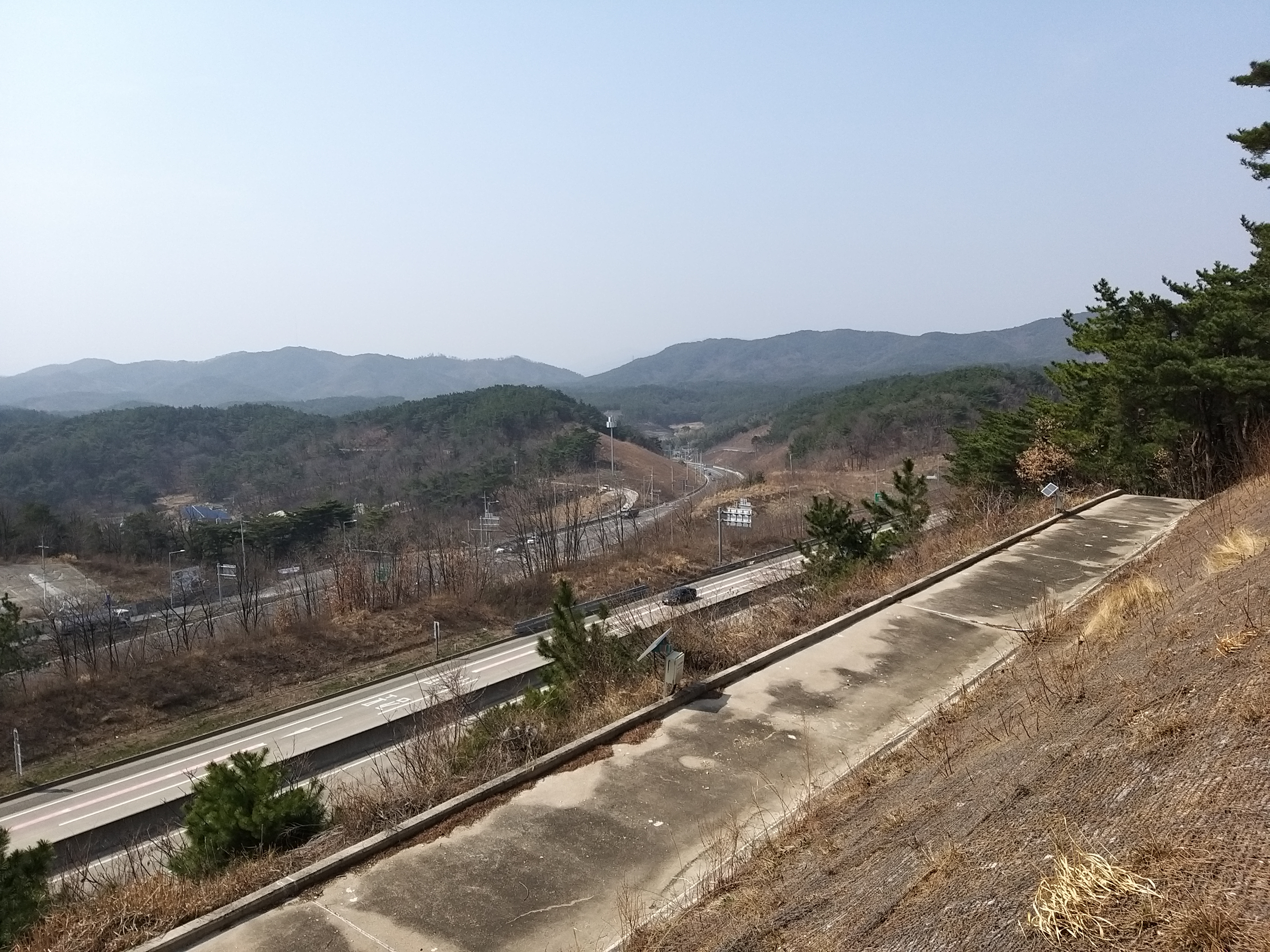 14:19 소티재 / 이곳 또한 차량 통행이 빈번하다. 절개지에서 좌측으로 내려섰다. 우측으로 내려서 700m 이동하면 횡단보도가 있는데, 위험하지만 쉬운 방법을 택한다. 차량 이동이 많고 중앙분리대 위로 철망이 더 얹혀져 있어 분리대 위에서 기다린다는게 본인도 그렇지만 운전사도 놀랄것 같아 양쪽 흐름이 완전히 끊기길 기다려야 하는데