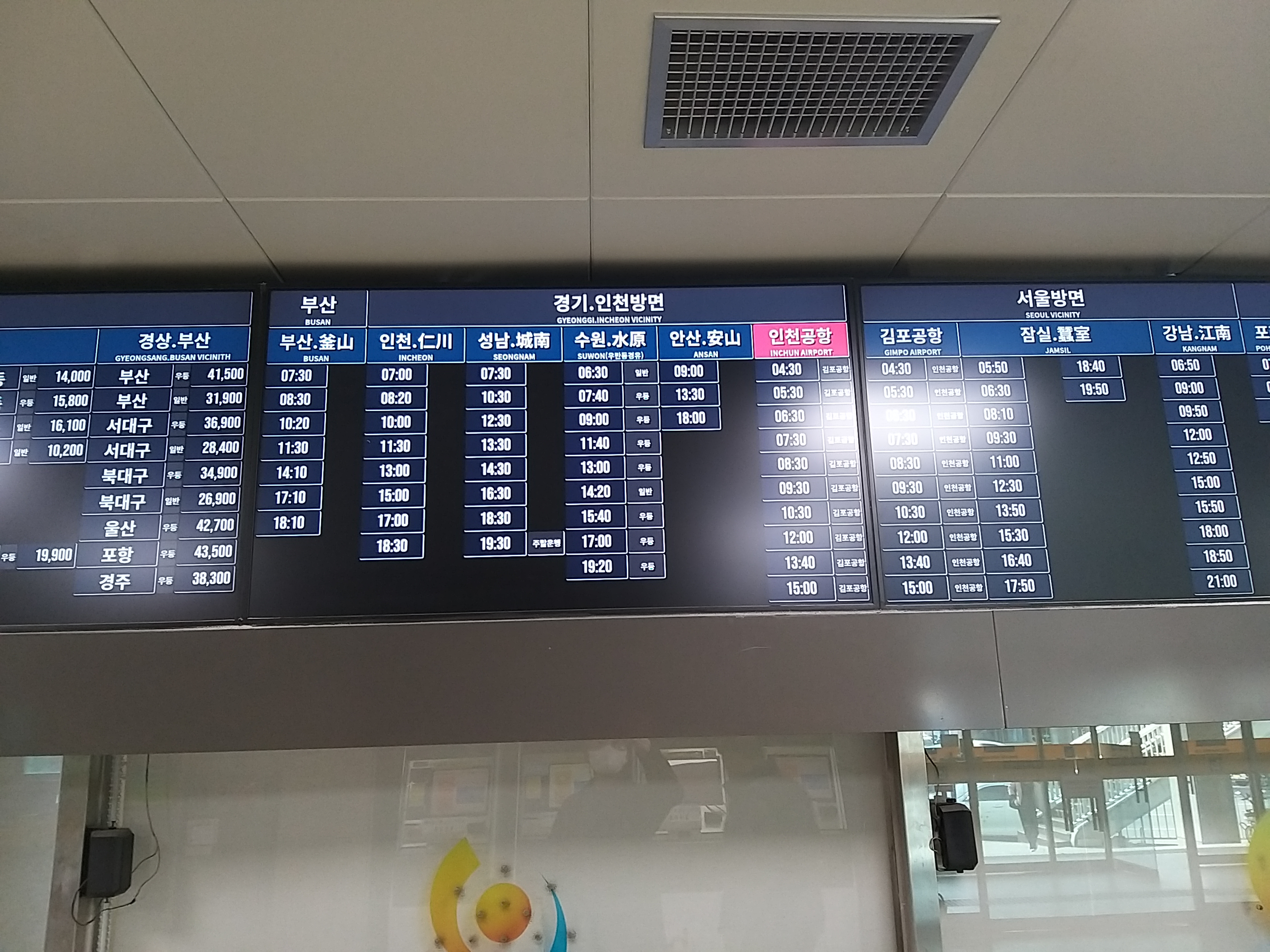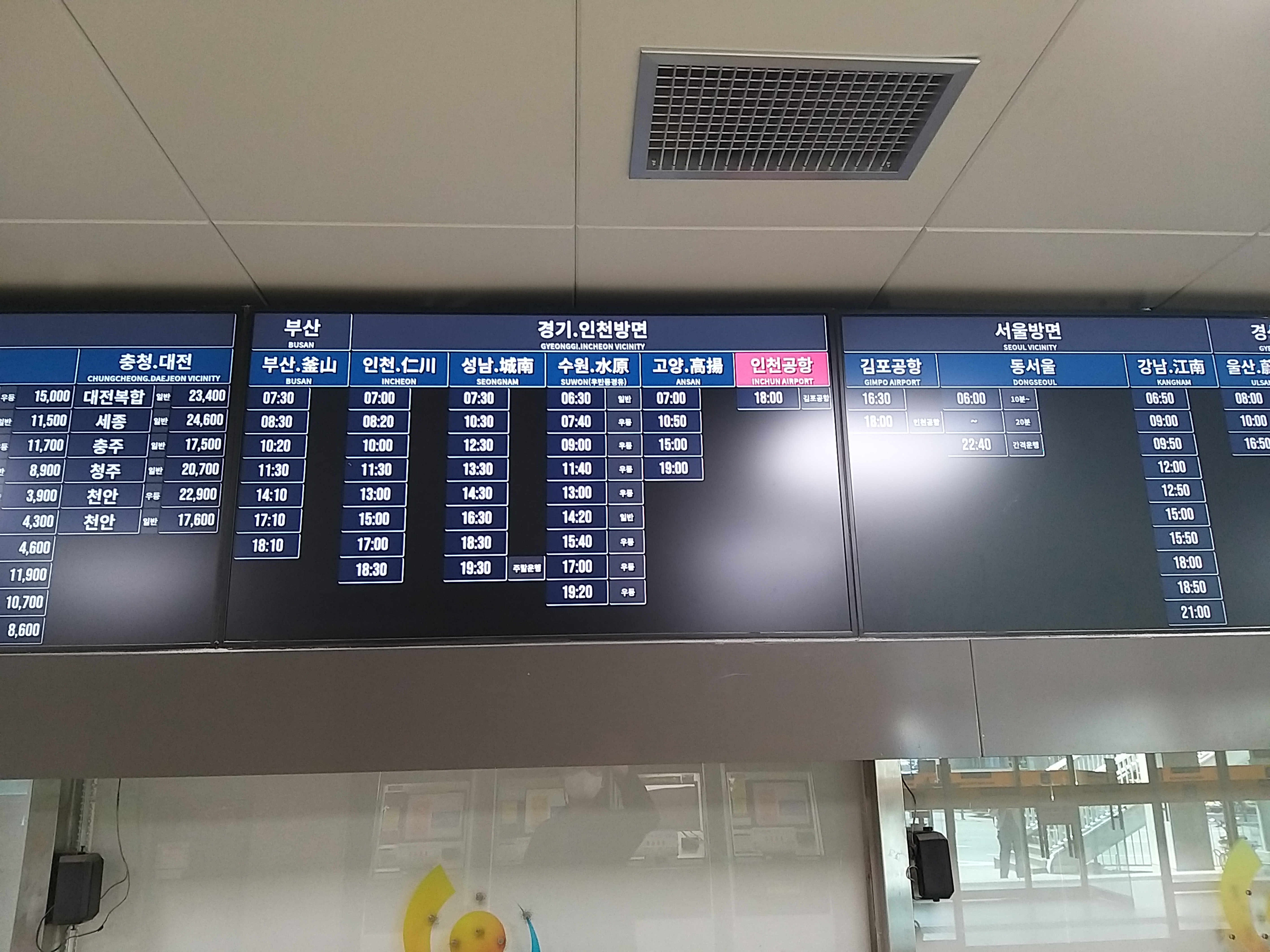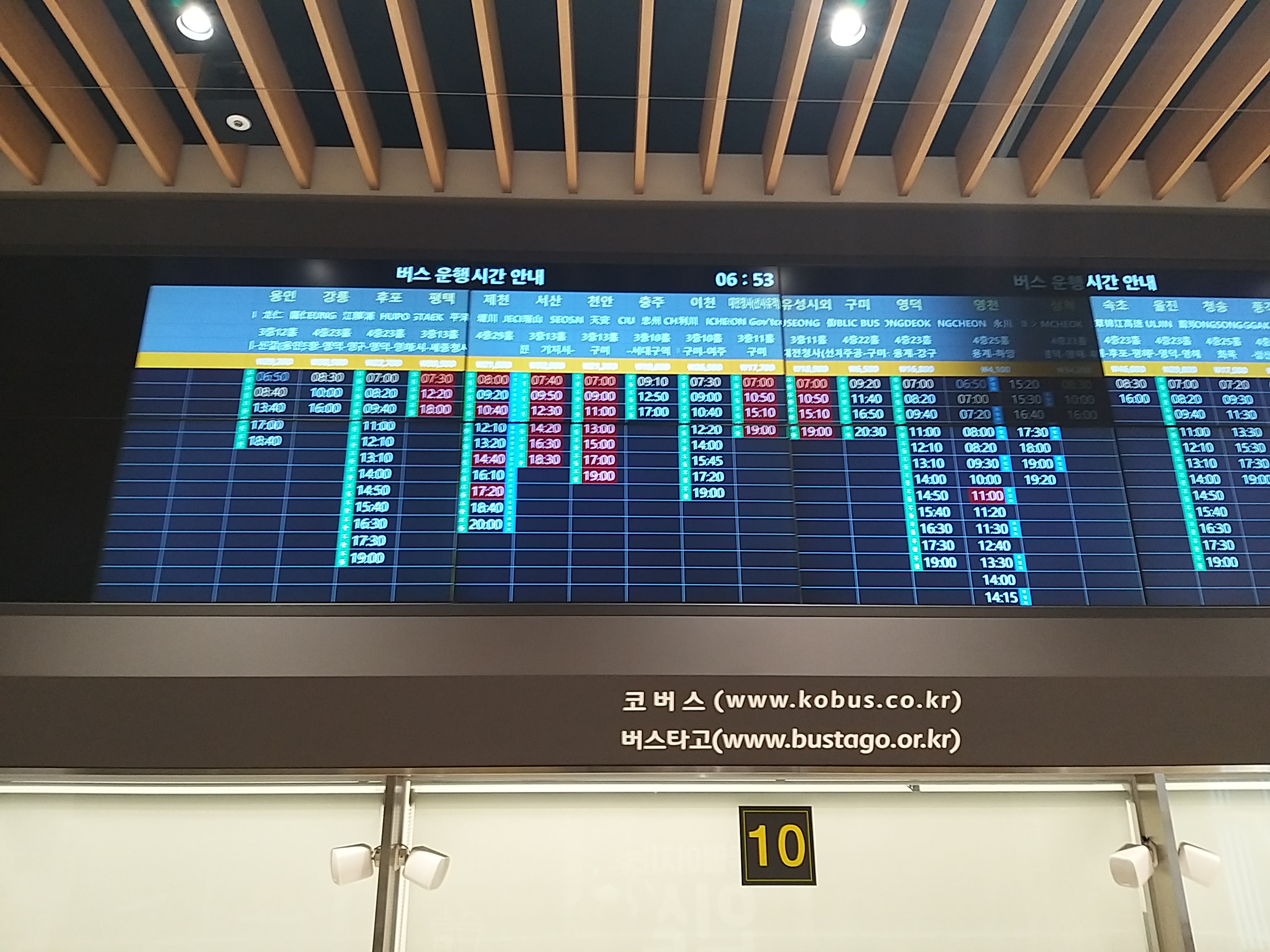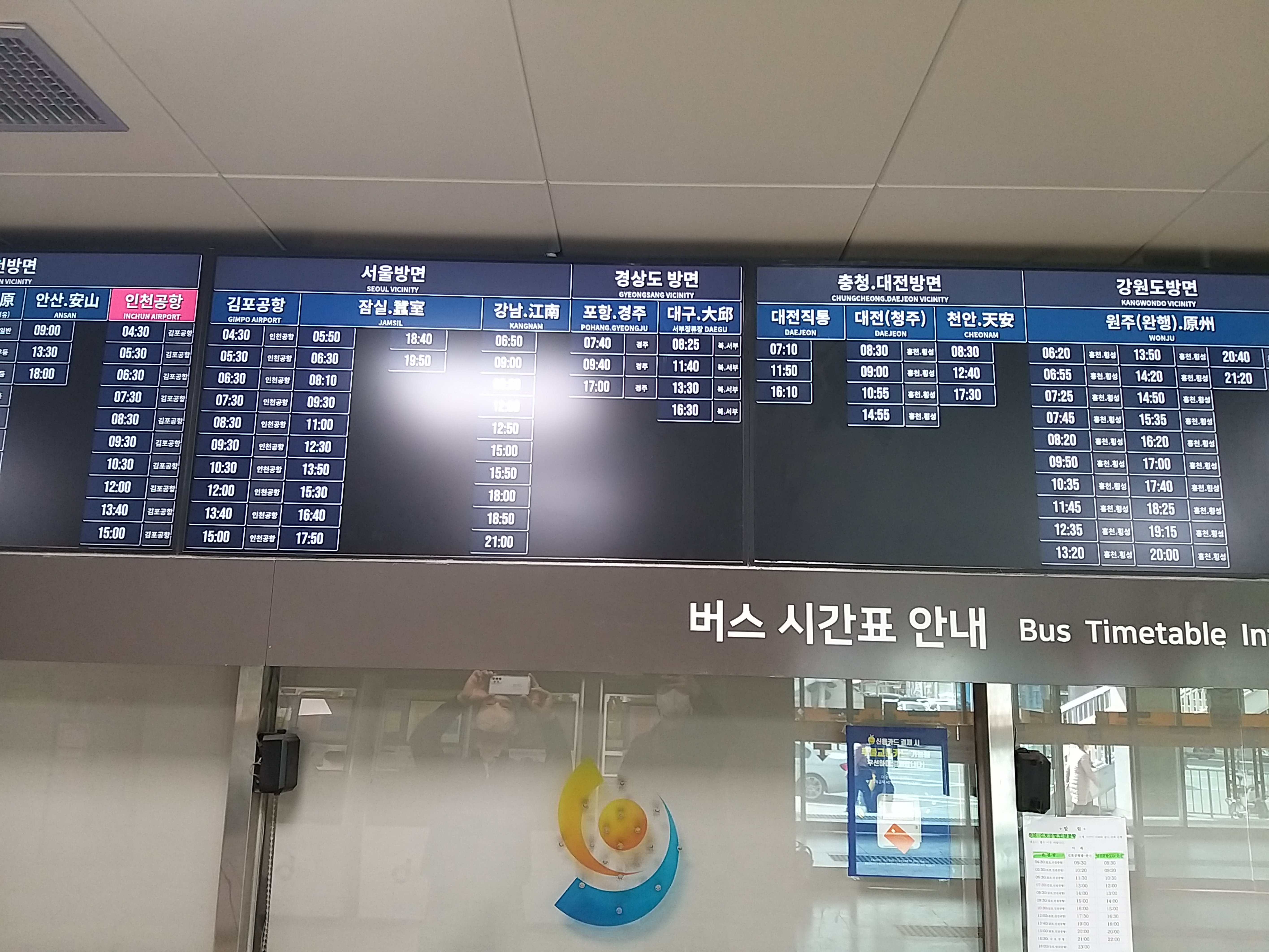 한가지 착각한게 있었다. 지금껏 시외버스와 고속버스 터미널이 공용시설만 이용했기에 춘천도 당연하다 생각했다가 한건 건졌다. 만약 환승 연계시간이 촉박 했다면 망했겠다. 시간표가 한화면에 다 못뿌려준 이유와 빛 반사로 여러장 찍었다.