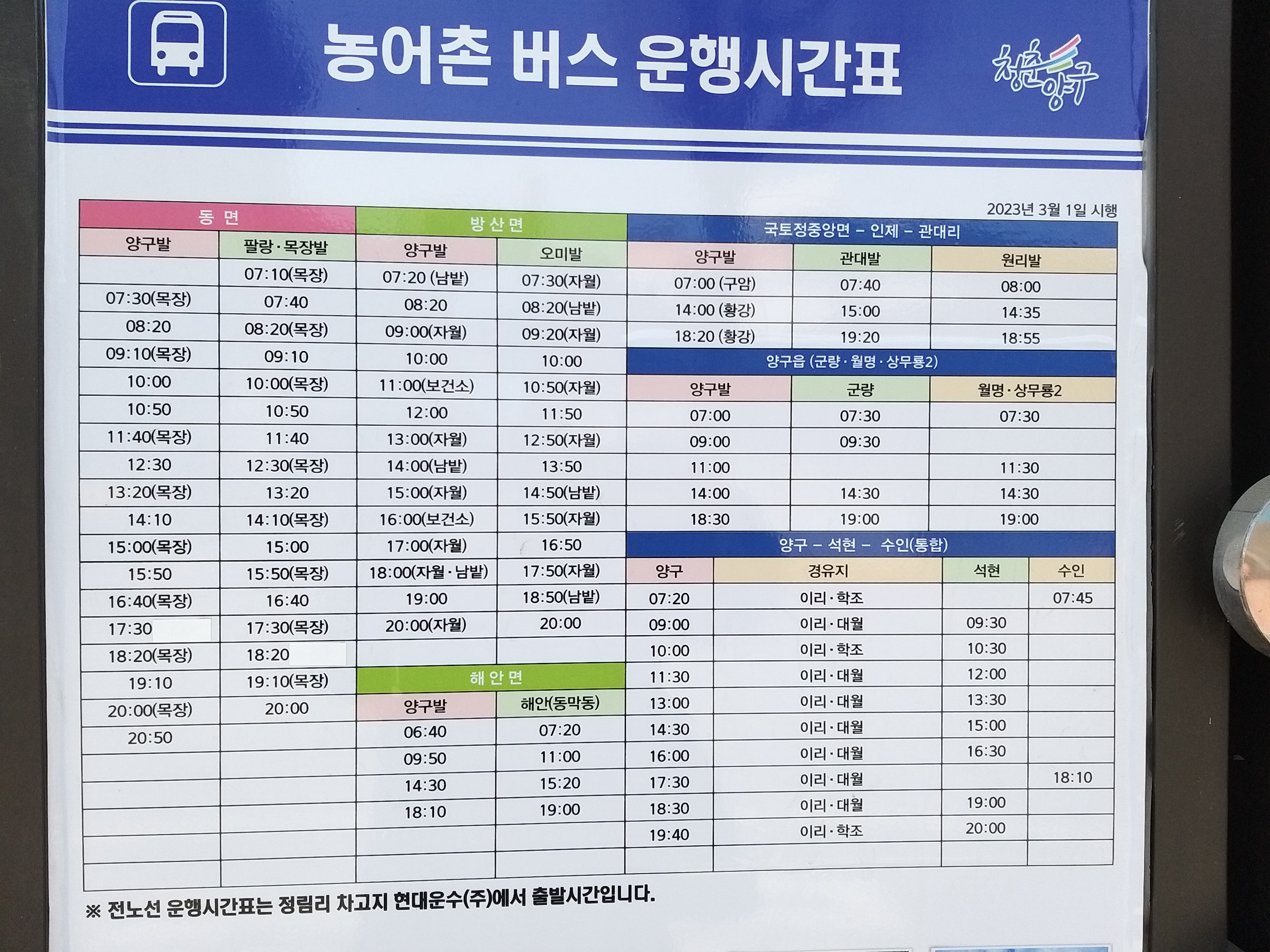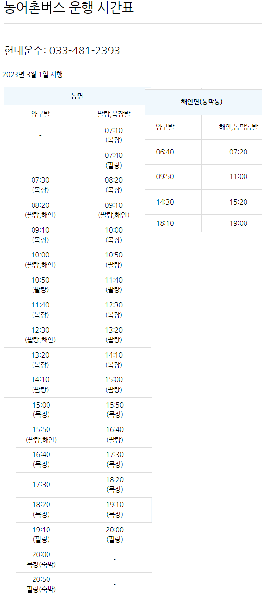 23-03-01부로 버스 시간이 개편되었다.(양구홈피와 버스 정류소에 부착된 버스 시간표 사양이 상이하다) 예전엔 동면 방면으로 해안가는 노선이 없었다. 동면과 해안방면은 승차지가 다르다. 내가 타야할 12시30분 차량이 팔랑,해안을 가기에 어디서 타야할지 헷갈려 현대운수에 문의하니 동면방면 가는버스는 국토정중앙면(舊 남면)으로 운행한다하여 터미널 건너편 정류소에서 버스를 기다린다. 참고로 동면 방면의 팔랑,해안 노선은 팔랑에서 환승한다네. 12시35분 와야할 버스가 안온다. 스케쥴상 산행후 금악리에서 막차 시간보다 10분 늦게 도착 예상이라 1분,1초가 아까운데 12시39분 되어서 온다.(도솔지맥 및 뒷날 차고지에서 터미널에 도착한 버스 시간이 5분임을 확인) 늦게 도착했으면 좀 빨리 달려야 할텐데. 공사 차량뒤를 졸졸 따라간다. 날머리에서 택시 탈 각오를 했다. 이친구 가관인건 농협에 차를 세우고 개인 볼일을 봐야 겠단다. 와 미치겠네. 안된다 소리는 못하고 팔랑에 12시55분에 도착해야 하는데, 빨리 볼일 보고 가자니. 미안한지 다시 시동을 켜고 진행한다