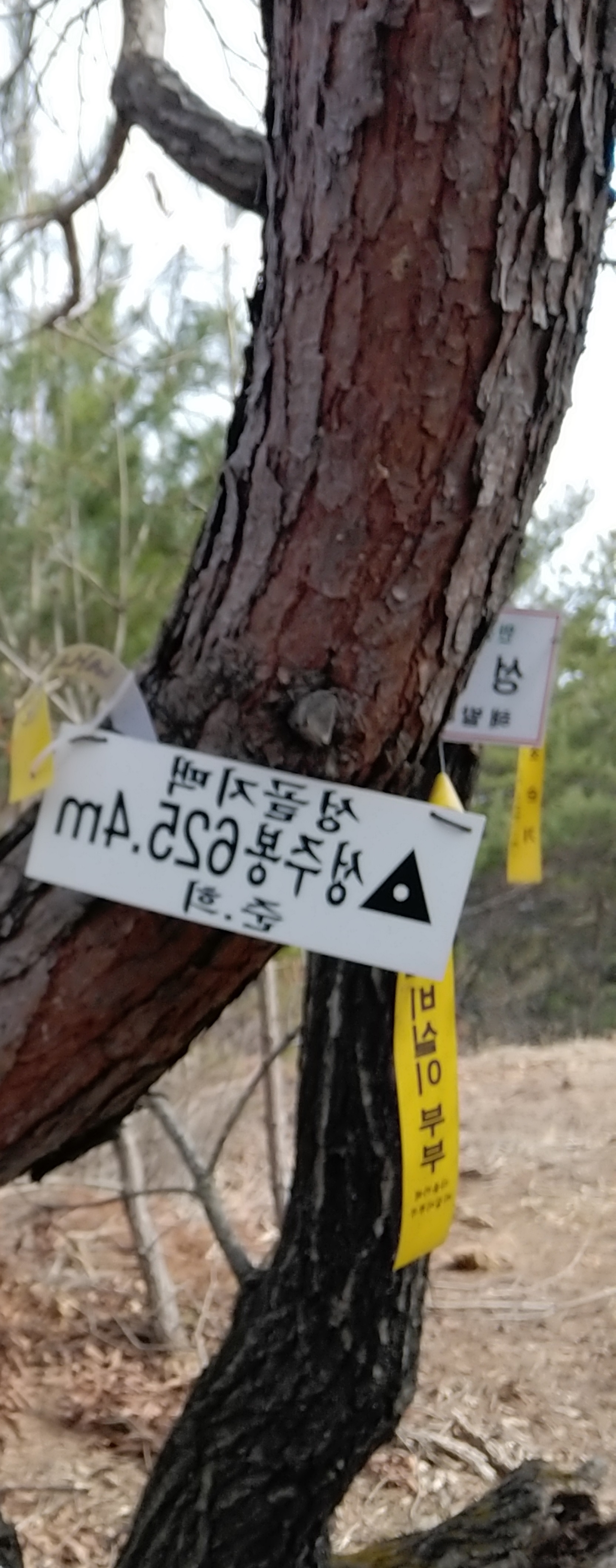 12:15 성주봉(△/625.4m) / 급작 스럽게 좌측으로 꺽는데 낭떠러진데 시그럴들이 있다. 와 심장이 쪼그라든다. 나무에 의지하며 조심 조심 내려선다. 시그럴이 요소 요소에 길을 정확히 안내 하는데, 암릉 절벽에서 어디로 내려서야 할지 갈등을 느꼈다. 바로 타고 내릴려니 안되겠고 우측으로 우회한것 같아 진입했는데, 베낭을 메고 건너기엔 자신이 없다. 다시 좌측으로 진행하니 제일 안전하네