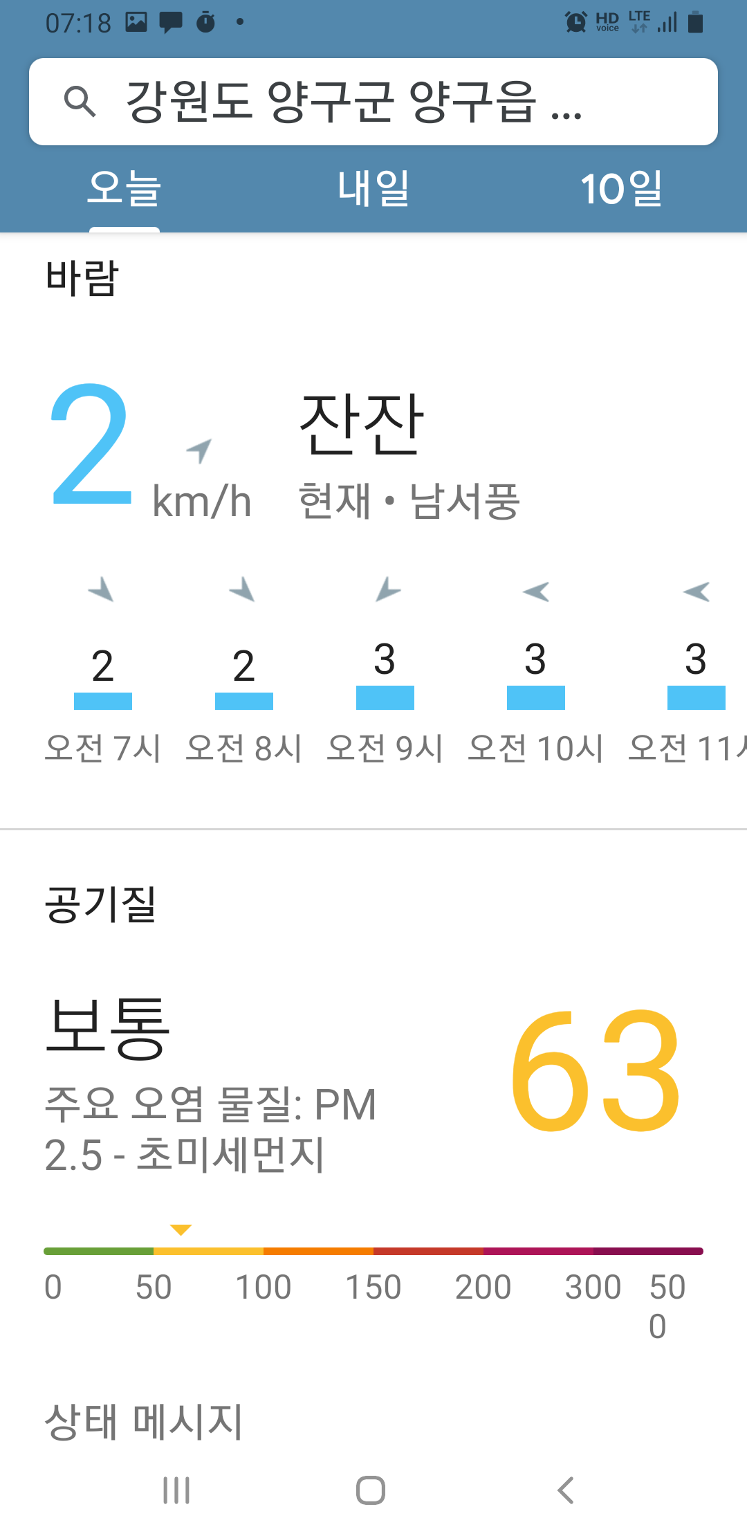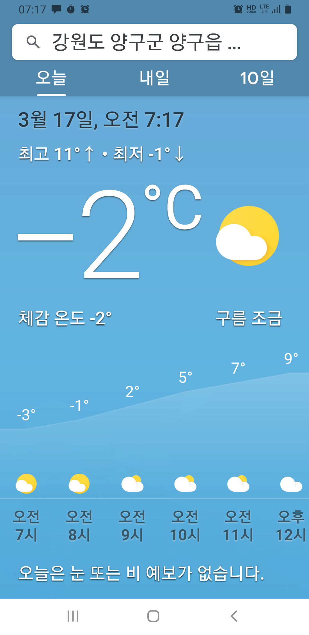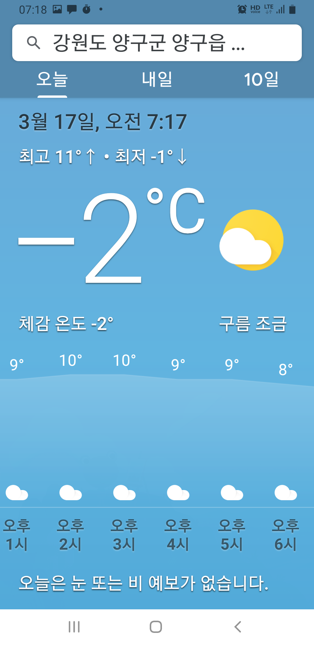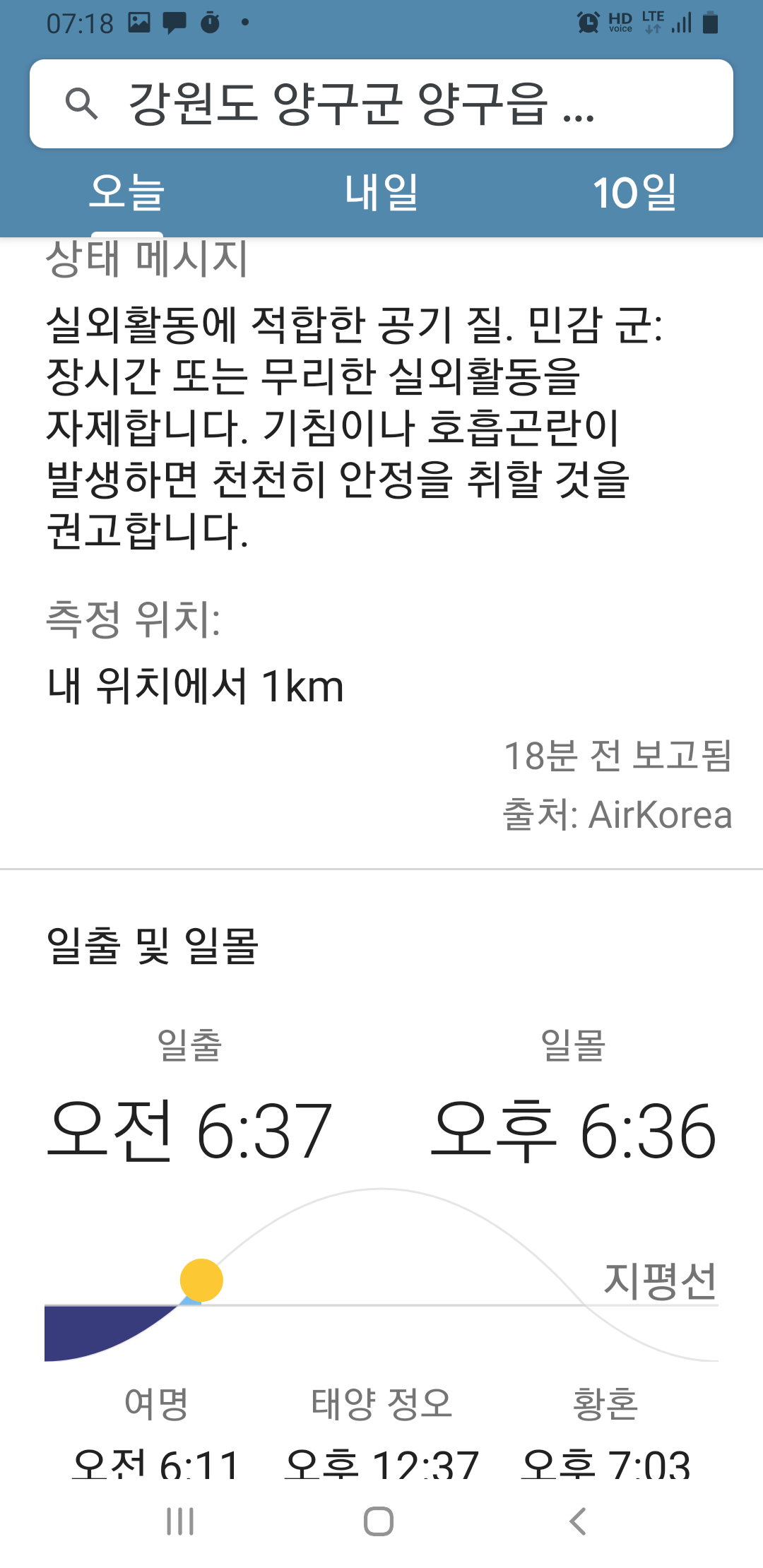 - 기상 : -2˚ ~ 10˚, 습도 53%, 바람 2~3(잔잔), 공기질 63(보통), 일몰 18시36분