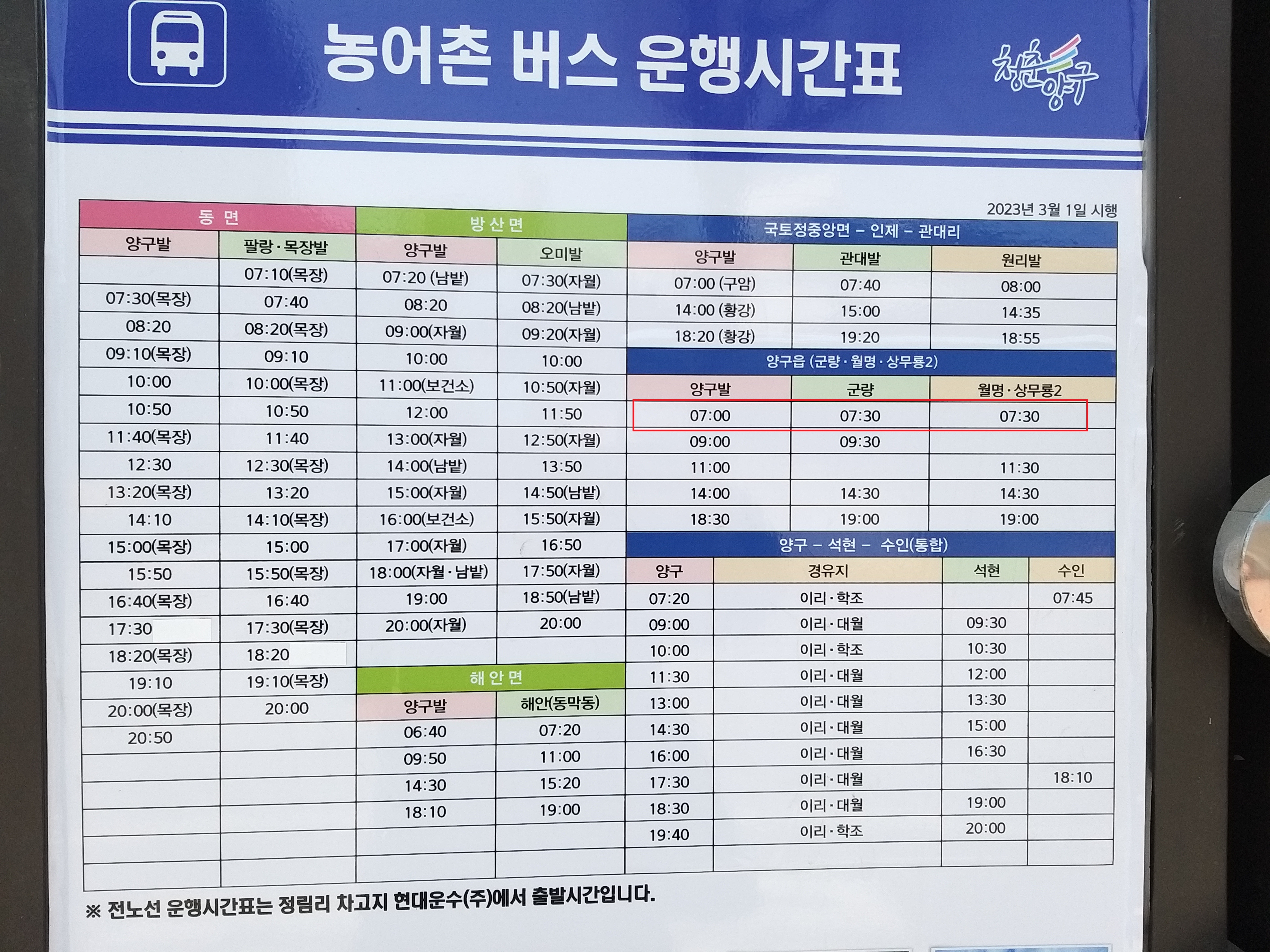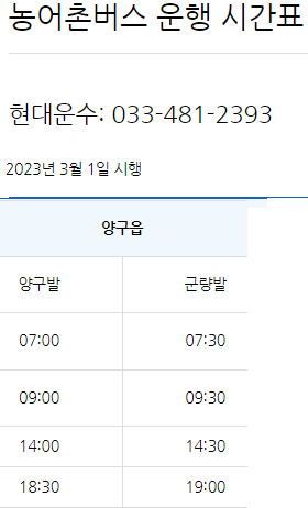 양구 홈피에서 우측 상단에 있는 상무룡2리 시간표를 즉 같은 시간에 군량과 상무룡2리로 각각 운행한다느걸