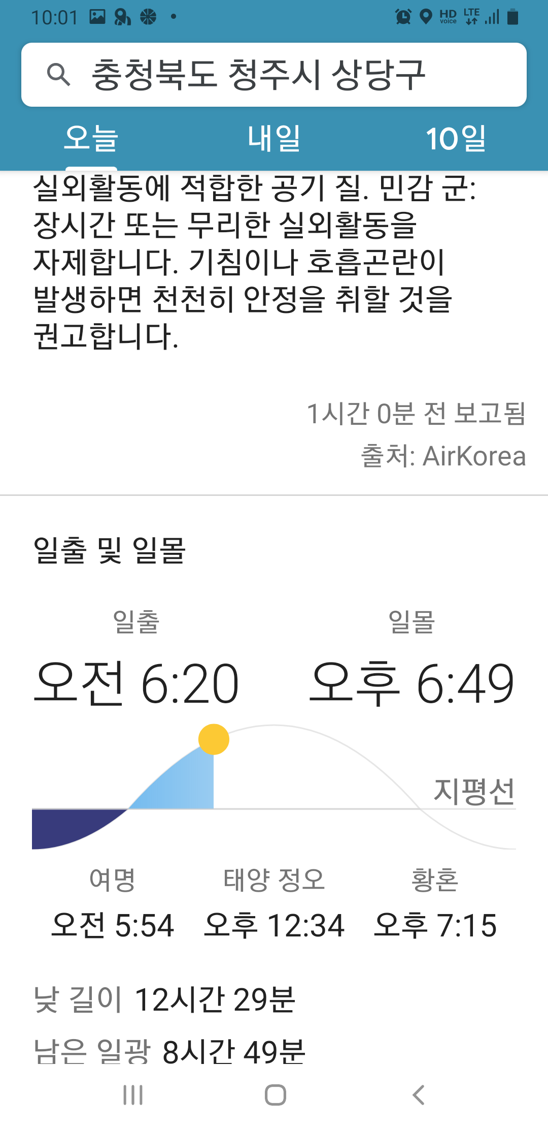 - 기상 : 14˚ ~ 21˚, 습도 33%, 바람 3~11(잔잔), 공기질 99(보통), 일몰 18시49분