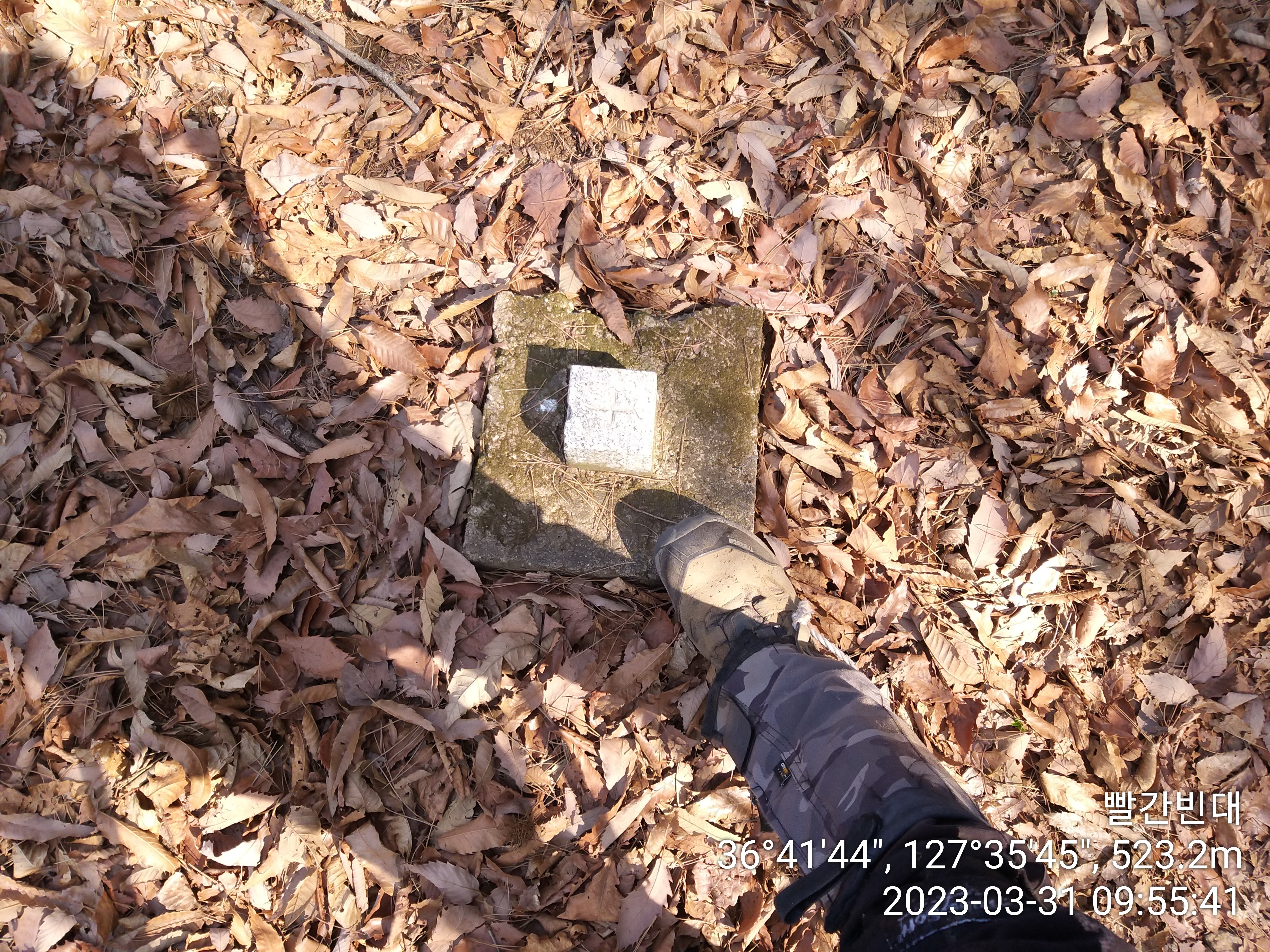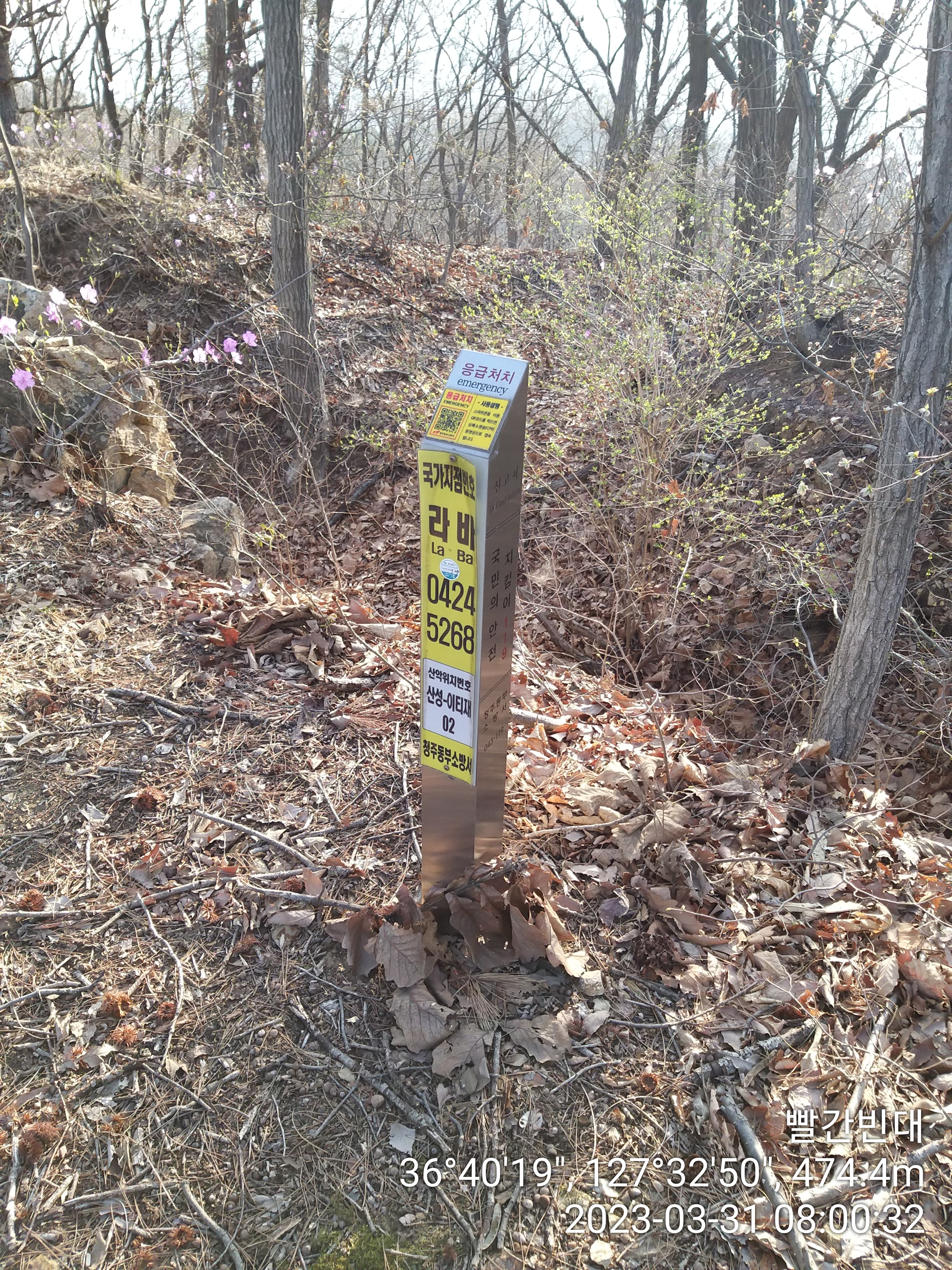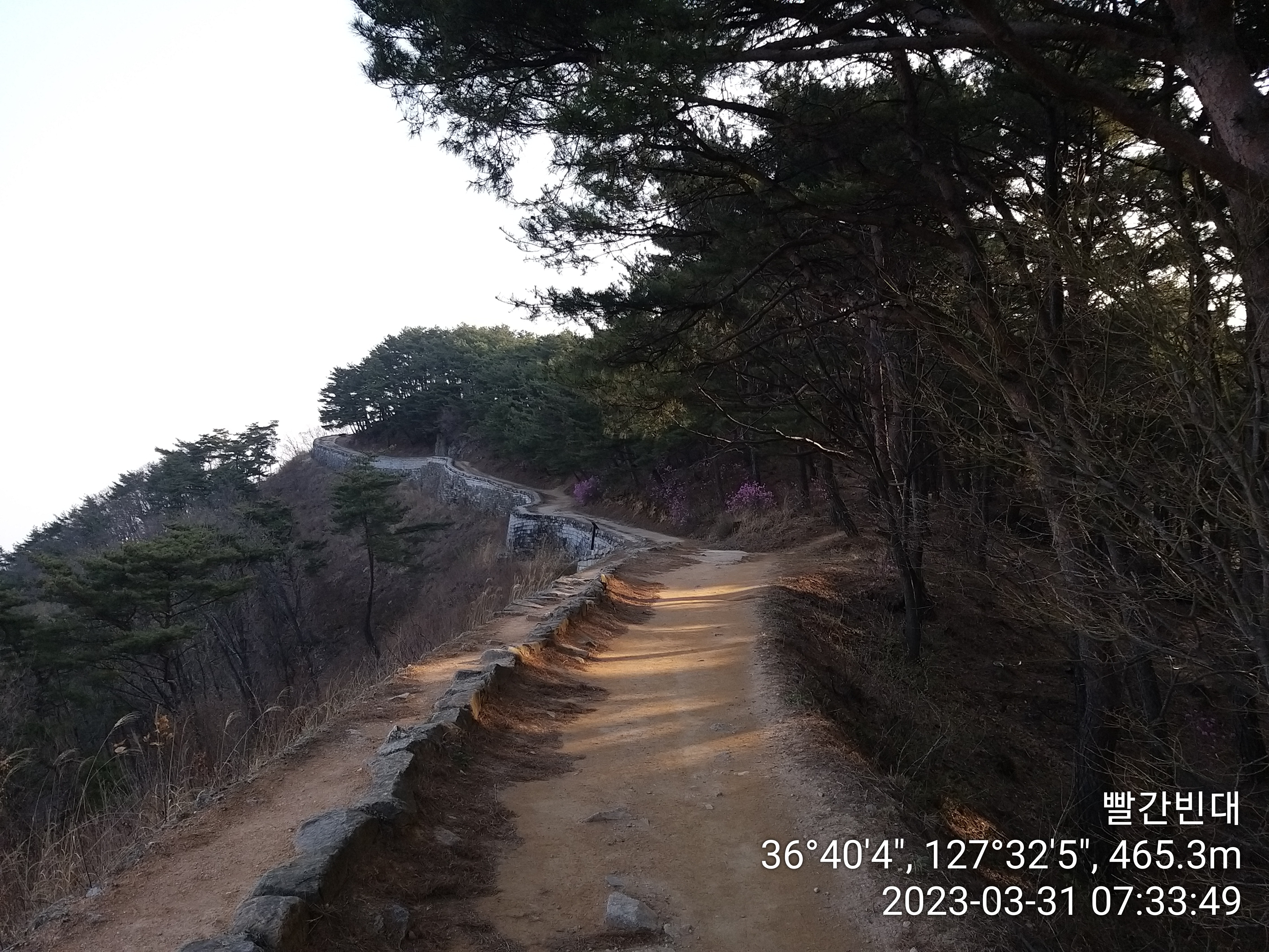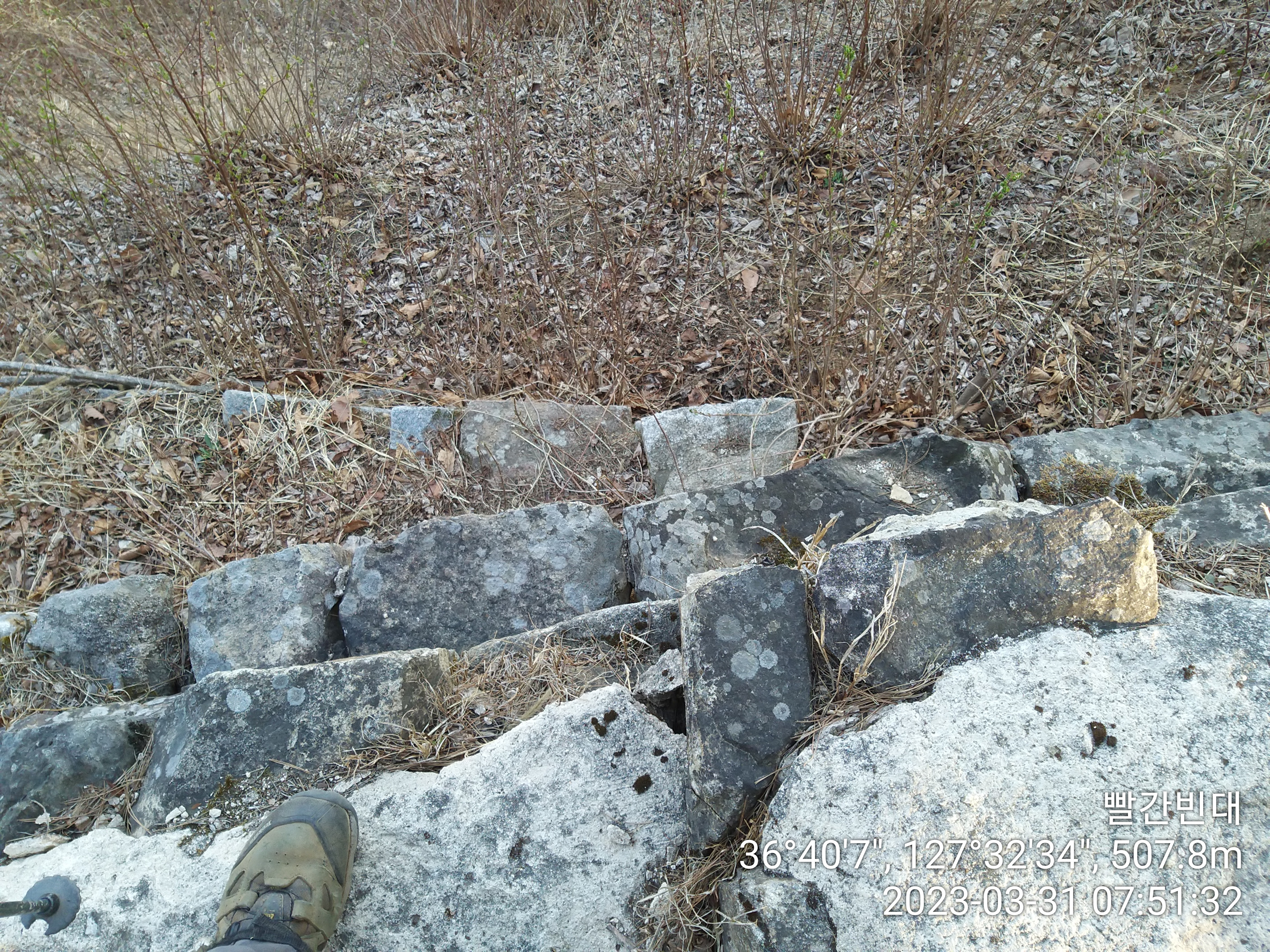 07:00~07:03 진드기 기피제를 뿌리고 산당산성 옛길 구조물 우측으로 산쟁이들이 지나 다닌 등로가 있다