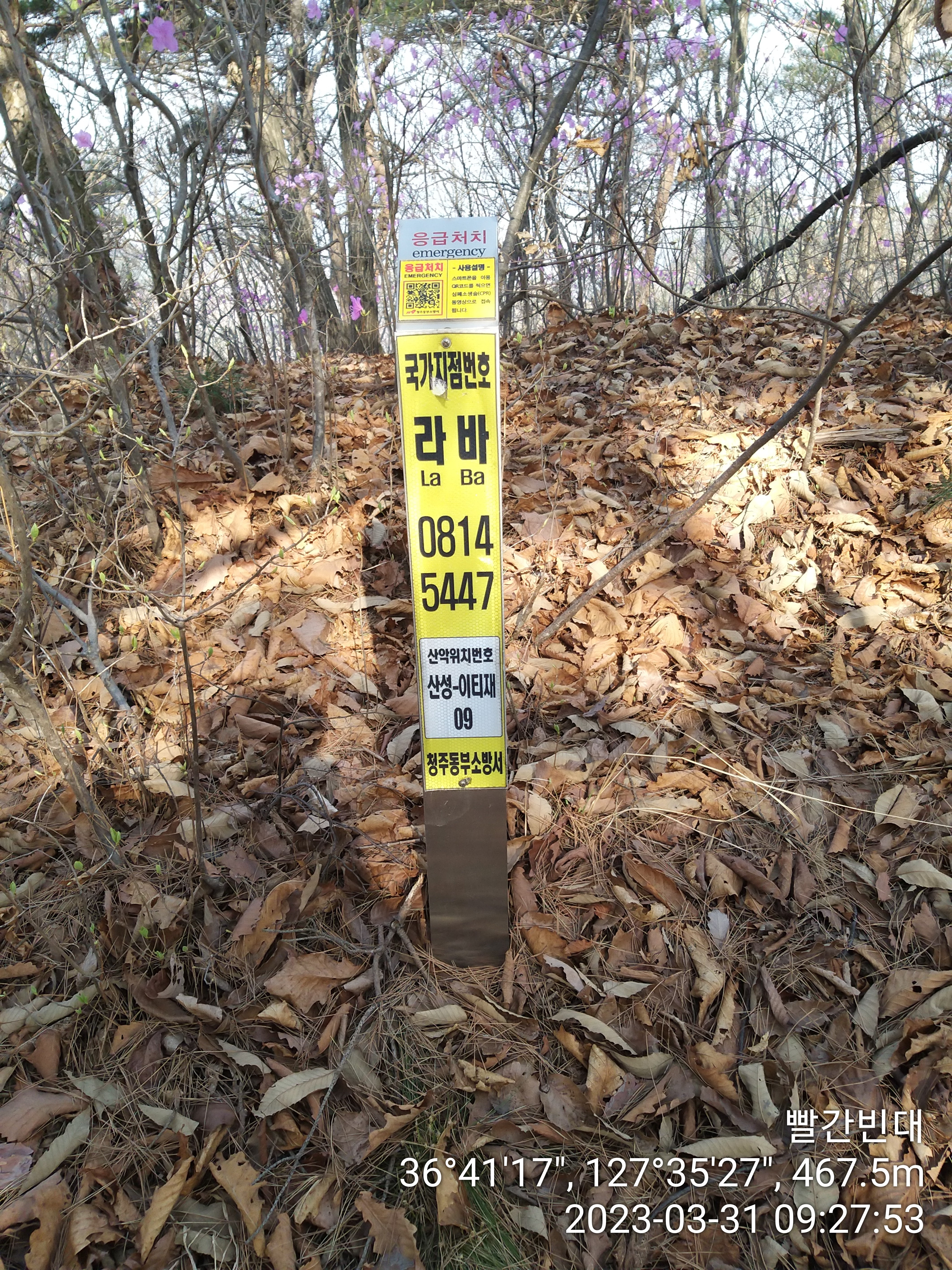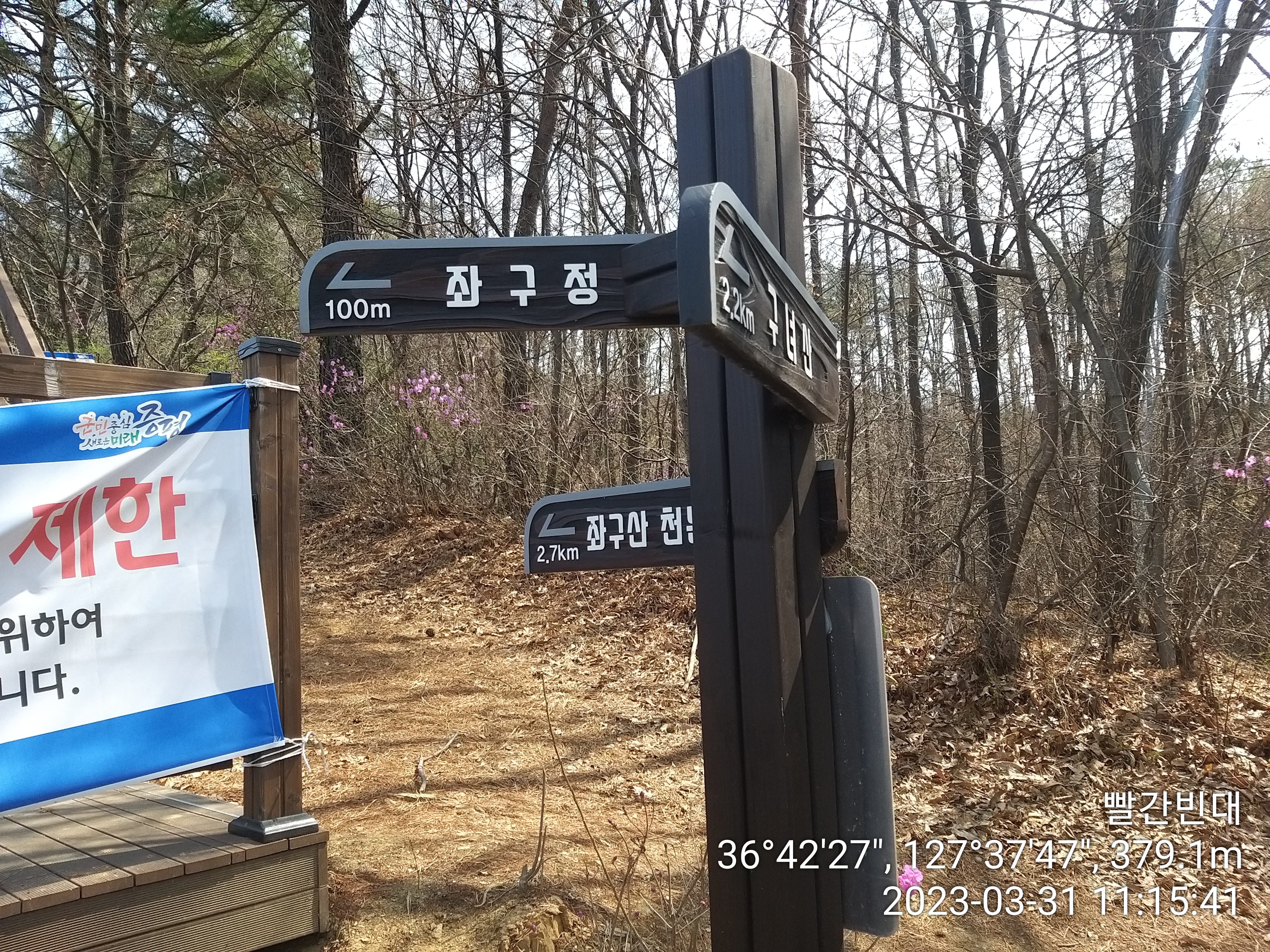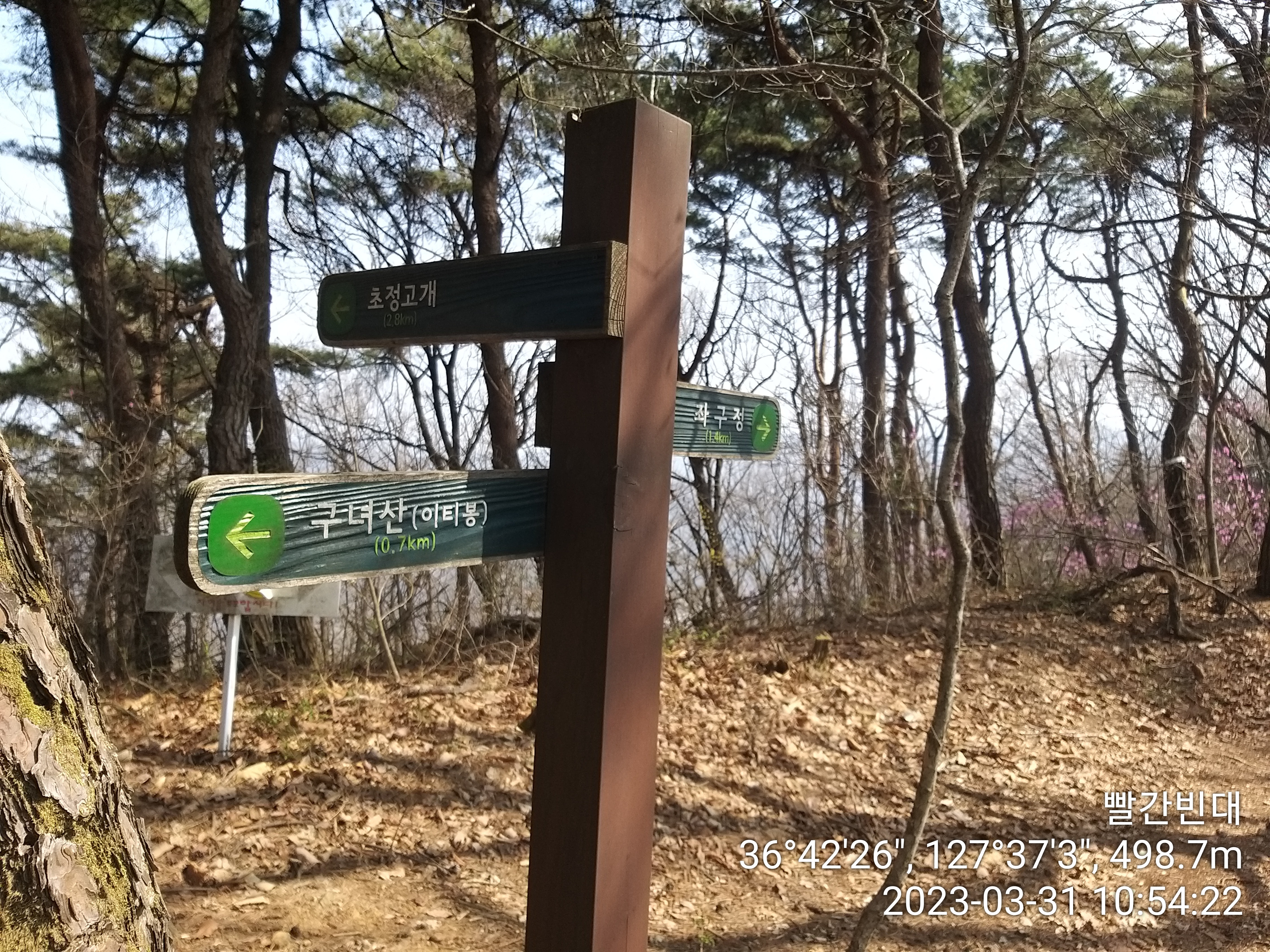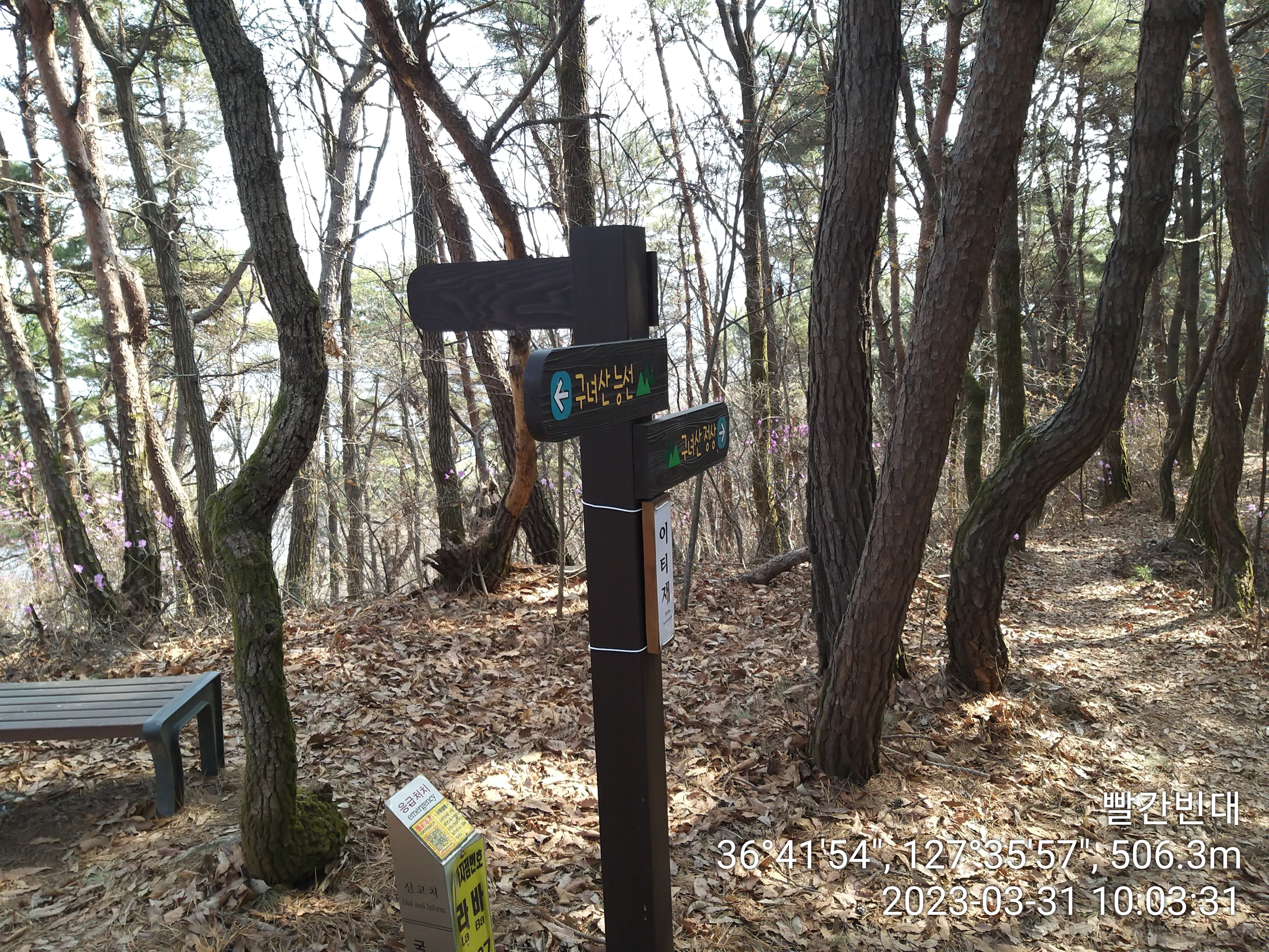 약수터 바로 옆에 구녀산 오르는 등산로 이정표가 있다. 오늘 구간엔 한남금북 정맥 마루금이 사유지를 지나는곳이 몇군데 있던데 등산객 때문에 훼손 되었다고 폐쇄된곳이 있던데, 여기도 언제까지 갈지. 참고로 이티재에서 왼쪽으로 도로따라 조금 내려서면 구녀산 오르는 등산로가 또 있더라