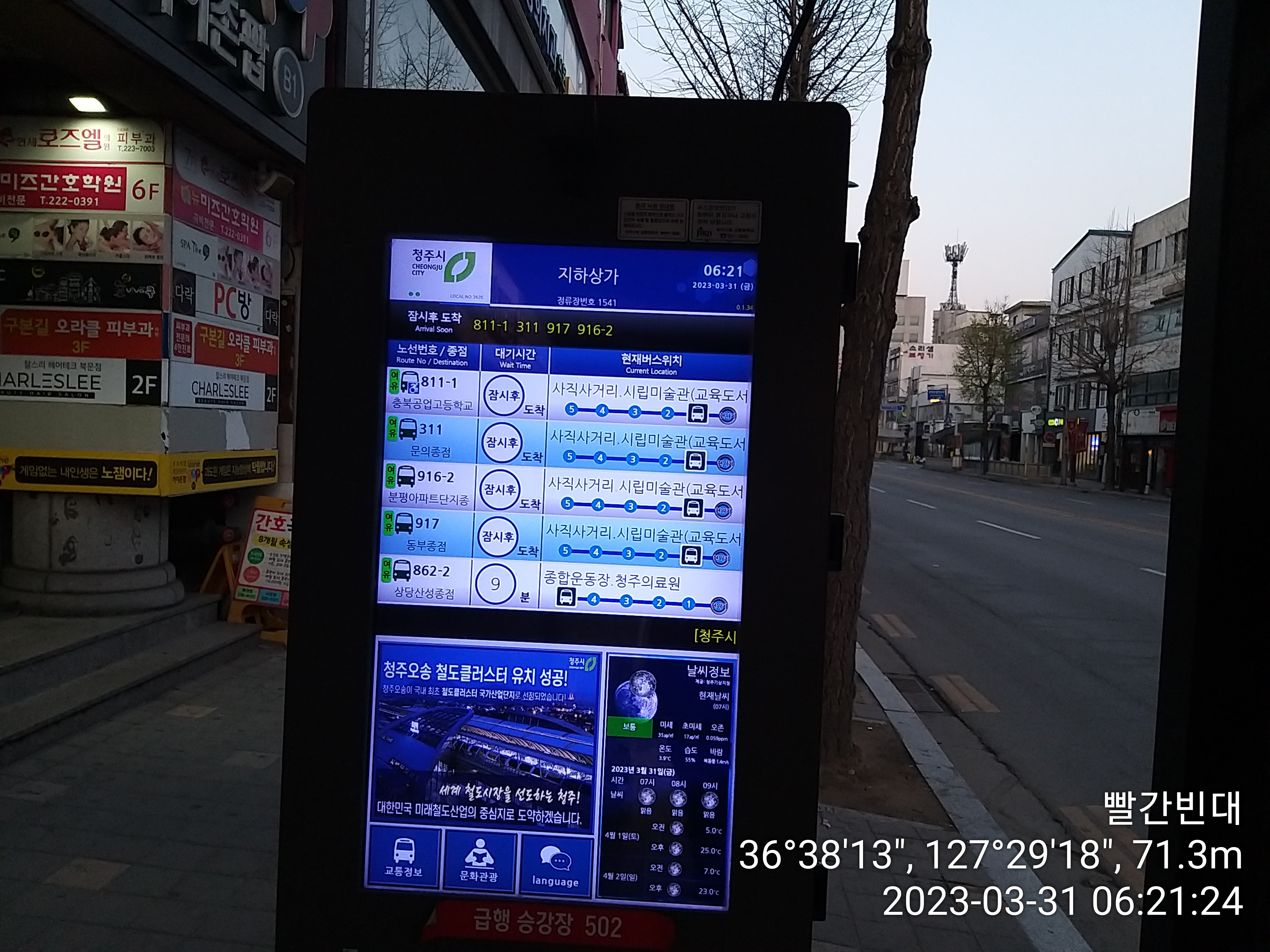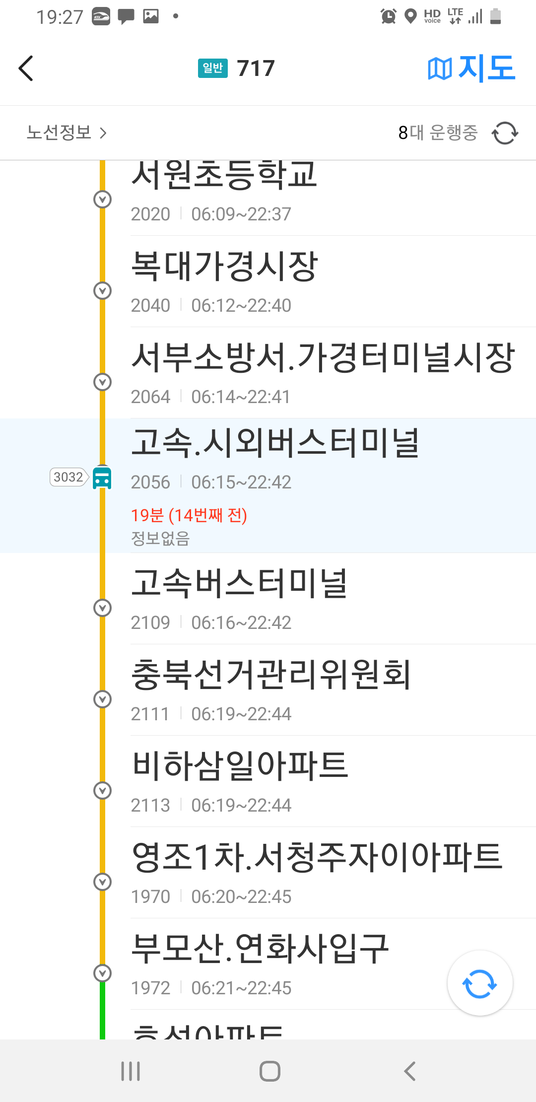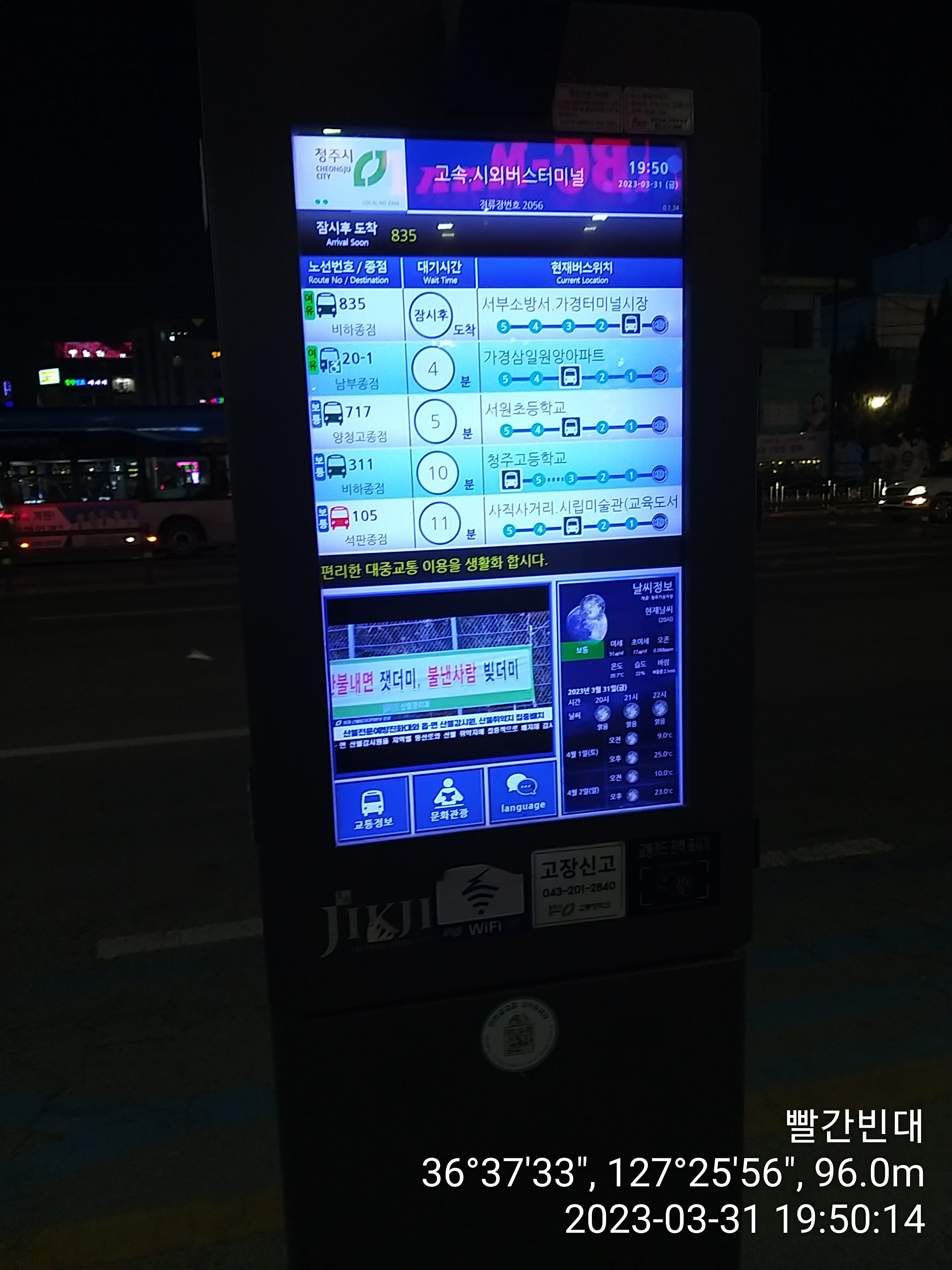 이제부터는 청주 시내버스와의 전쟁이다. 1만원 아낄려다 피말리네. 까딱하다간 택시까지 탈판이다. 다행히 19시39분 터미널에 도착예정인 717번 버스도 시내 정체로 늦어지고 있다