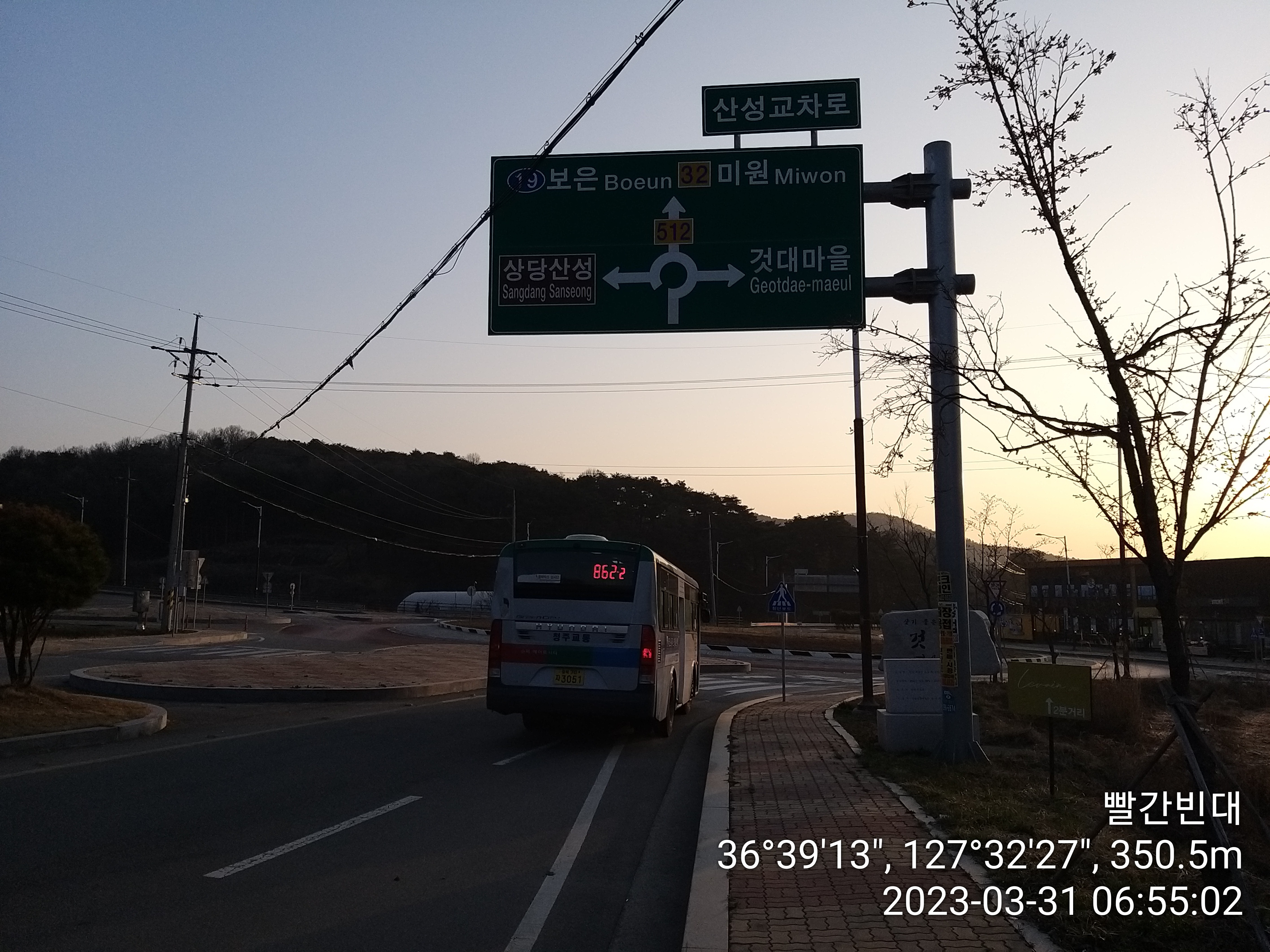 17:50 모래재 / 아 나에게 이런 행운이 아니 불운이 모래재 계단을 내려선다. 지척에 34번국도가 있어 괴산에서 증평으로가는 농어촌버스가 다니는길은 차량 통행이 없다. 모래재 인증샷을 날리려는데, 기계음 소리가 들리며 커버길에 버스 시그럴이 먼저 보인다. 아 버스다. 인증샷이고 뭐고 냅다 달린다. 버스가 지나간다 손을 흔들었지 세워주세요. 기사님이 봤는지. 정류소가 아닌데 급하게 멈춘다. 연신 고맙다고 인사를 드리고 탈출 시나리오 2번을 진행하기 위해 고속버스 차편을 예약 완료. 시외버스 터미널에서 하차하는데 오늘의 행운은 여기까지