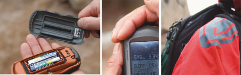 - ▲ 오레곤 300의 경우 AA건전지 2개를 넣는다. / 다양한 산행정보를 알려주는 트립컴퓨터 화면. / 배낭 끈 상단에 거치해야 수신이 잘된다.