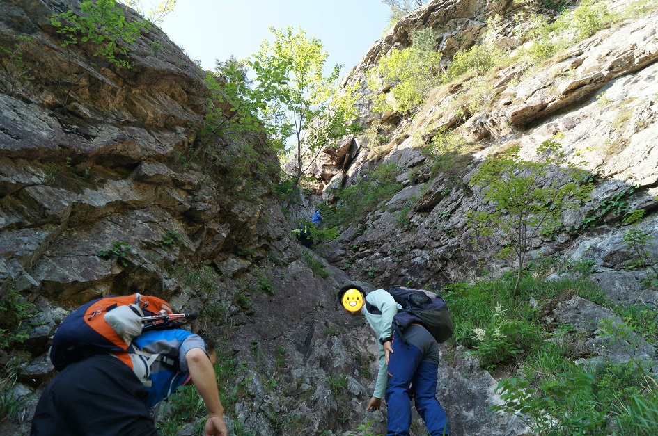 곧바로 연결된 마지막 로프 구간을 통과 했습니다. 아무 생각없이 선행자의 뒤꽁무니만 따라가지 마십시요. 그들도 길을 잘못 들수 있으니 너무 믿지 말고 이제 위험구간은 없는데 앞서가던 여자분이 SOS를 외칩니다. 선행하던 남자분들 따라 갔는데 갑자기 어디로 가야할지 몰라 그들에게 묻습니다. "위험하니까 오지마세요" 남자분들은 무사히 탈출했는데 여자분은 오도가도 못하고 산행 대장이 로프로 구해줄때까지 기다려야 합니다. 마지막 로프구간을 지나면 오른쪽으로 리본이 있는데 이걸 못보고 낭떠러지 따라 바위길로 들어섰다가 낭패를 당했습니다. 나중에 폭포상단 전망대에서 점심을 먹고 쉬는데 이 여자분 올라오던데 설마 그곳에서 35분동안 고립된건 아니겠지요