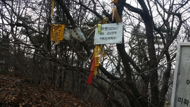 10:31 작봉산(△ / 419.6m)10:53 399.9봉 / 매실음료 500ml를 비웠다. 초반부터 달달한 음료로 피로를 달랜다 . 베낭의 무게도 한결 가벼워 졌고11:17 392.7봉11:33 화산 춘산리 갈림11:42 357.8봉12:01 까치봉(456.1m)12:06 까치봉에서 401.2봉 가는길이 급내리막길이다12:13 401.2봉 / 예상 진행 시간을 얼쭈 맞추었는데, 몸이 피곤해서인지 밥은 안댕기고 달달한 음료만 땡긴다. 수시로 캔디, 쵸코렛, 계란등으로 배를 채운다.12:22 나즈막한 봉우리 2개를 지나 다시 급비탈을 만난다12:39 말목재 / 옥녀봉 직전 봉우리까지 계속된 오름길이지만 완만하여 살만하다누군지 모르겠지만 등로 주변의 나뭇가지를 정리하여 주어 고맙네. 한결 오르기가 수월타13:16 힘들게 올라 섰는데 무명봉이다. 말목재까진 논산에서 이정표를 세웠고 여기서 부터는 이정표가 다른게 완주군에서 세운것 같은데 분명 옥녀봉이란 푯말이 없는데13:19 능선을 내려서니 종전에 올라선 봉우리를 옥녀봉이라 하네. 헌데 지리원, 산림청, 양대포털 싸이트엔 다음 봉우리가 옥녀봉 인디. 야들 도대체 돈받고 뭐하는건지