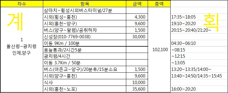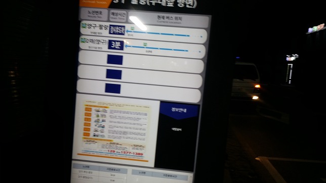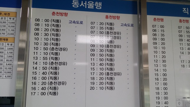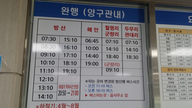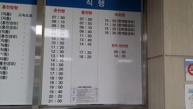 택시를 기다리는데 15시15분경 관대리에서 양구행 완행버스가 지나간다. 한템포 늦추었다면 택시비 세이버 가능했는데, 성급했나. 참고로 양구택시 호출번호는 010-5377-5230, 010-2775-1678, 010-8743-8945등이 있다. 또하나 택시 호출시 인근 남면시외버스 정류소를 목적지를 하더라도 양구에서 이동하는 비용을 지불해야 한다. 양구터미널까진 약 20분 소요된다. 어차피 남면에 가나 양구에 가나 똑같은 비용을 지불해야하고 양구군 홈피에 올라온 버스 시간표가 변동이 발생하여 시간적 여유가 많다. 남면엔 쉴만한 공간도 없어 읍내로 이동하는게 맞다. 일단 홍천행 표를 끊고 사우나로 이동한다선지해장국으로 배 채우고17시20분 홍천행 버스에 오른다. 택시 기사님 말에 의하면 최근에 변동 사항이 발생 했다는데 양구군 홈피는 3월8일자 자료가 올라와 있다. 오늘의 운세는 억수로 좋음에서 시간이 흐르며 나쁨으로 바뀌어 가고 있다. 이유는 홍천 경유 동서울행 시외버스 기사 때문이다. 기가 막혀서