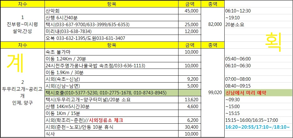 ㅇ 특이점 : 미시령에서 속초 탈출시 용대리 콜 또는 고성군 콜을 부르면 되고 속초 택시는 불러도 안옵니다. 속초터미널까지 약 25천원 예상