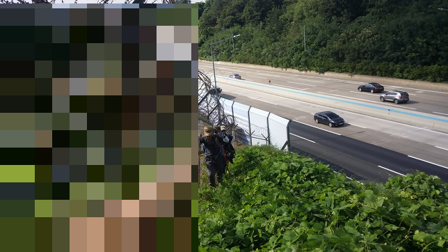 - 고속도로 갓길을 걷다(약 4분) 펜스가 끝나는 지점에서 바로 철조망으로 올라서야 하는데 평행선을 그으며 걷다 되돌아서 적당한 지점에서 칡넝굴을 잡고 올라선다.