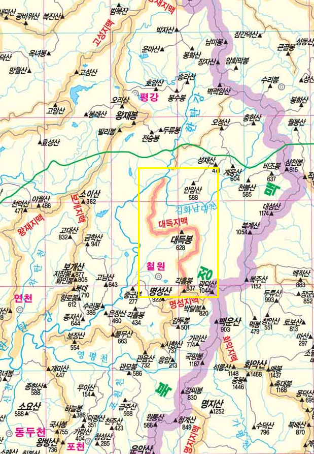 대득지맥(大得枝脈)은 한북정맥의 광덕산(1049.2m)에서 서쪽으로 분기한 명성지맥鳴聲枝脈)이 836.8봉에서 서북쪽으로 재분기해서 철원군 갈말읍과 서면의 경계를 따라 대득봉(大得峰 628m)을 지나 철원군 갈말읍 토성리(하토동)의 한탄강과 김화남대천 합수점에서 그 맥을 다하는 도상거리 32.2km인 산줄기 이다.