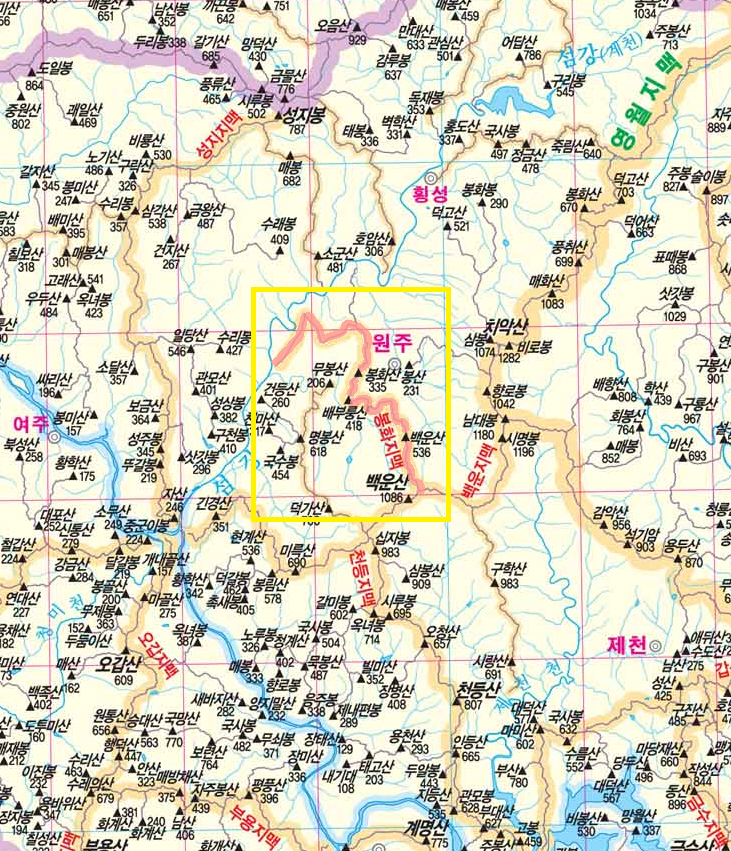치악산 남대봉(1180m)에서 원주시 부론면 정산리로 이어지는 백운지맥이 백운산(1086.1m) 직전의 군부대가 있는 봉우리(강원도 원주시 판부면 신촌리 와 충청북도 제천시 백운면 운학리의 경계점)에서 북서쪽으로 가지를 쳐 백운산(535.5m), 배부릉산(417.5m), 봉화산(334.8m), 영산(324m)을 지나 강원도 원주시 지정면 간현리 섬강으로 이어지는 도상거리 36.8km의 산줄기를 봉화지맥(鳳華枝脈)이라 하며 이 산줄기의 서쪽과 남쪽에는 백운천,매지천 등이 섬강으로 흐르며 동쪽과 북쪽에는 봉천,원주천 등이 섬강으로 흘러간다.