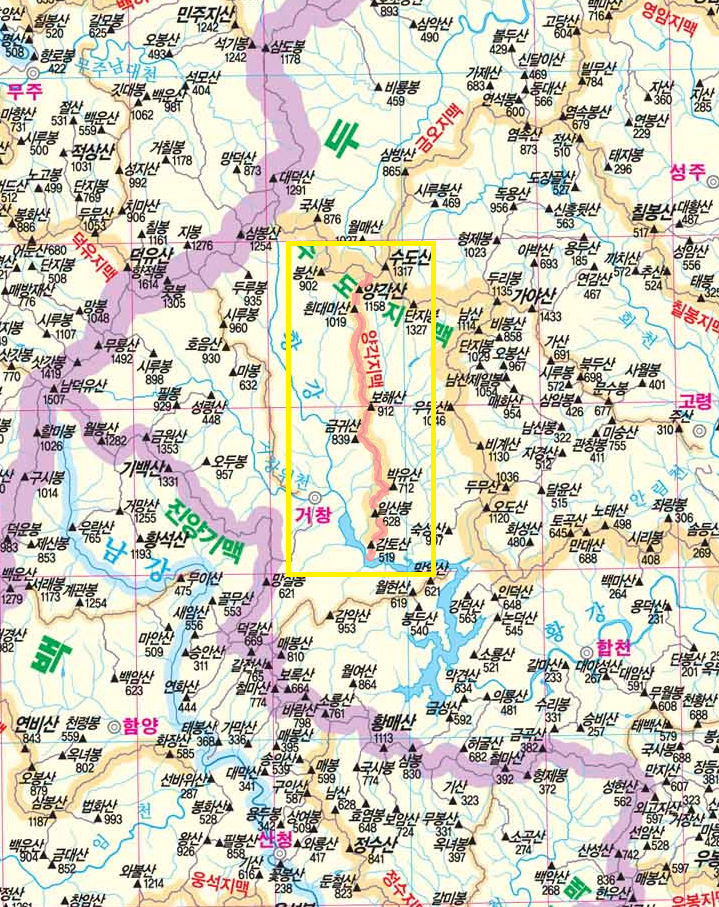 백두대간 대덕산(1290.7m) 부근에서 남쪽으로 분기한 수도지맥이 16.6km를 내려가 1236.5봉에서(우두령에서 3.9km, 수도산에서 1.8km 지점) 남쪽으로 가지를 쳐 東으론 가천천(加川천), 西로는 계수천(溪水川)을 가르며 양각산(1157.5m), 흰대미산(1018.5m) , 보해산(911.5m), 일산봉(625.6m), 감토산(518.6m)을 일구고 황강에 빠지는 도상거리 31km되는 산줄기를 양각지맥(兩角枝脈)이라 칭한다