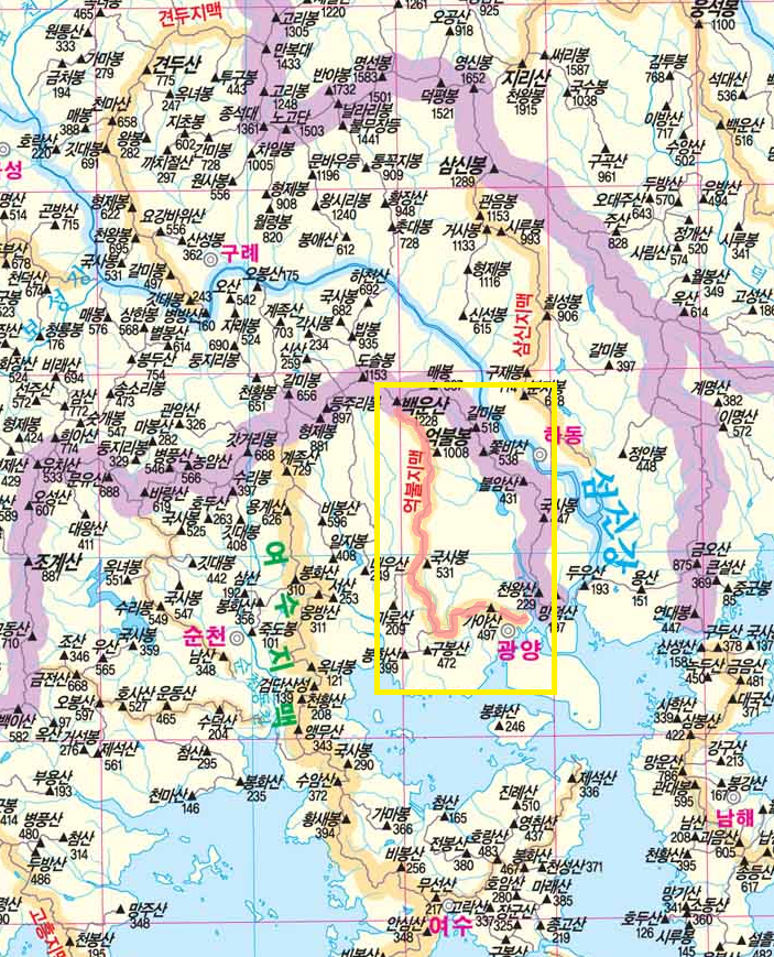 억불지맥 (億佛枝脈)은 호남정맥의 백운산(白雲山.1222.2m)에서 남쪽으로 분기하여 광양동천과 수어천을 가르며 억불봉(1007.5m), 가야산(496.9m)을 지나 수어천하구인 광양하수종말처리장앞에서 호남정맥과 태인도를 마주보며 끝나는 도상거리 30.5km되는 산줄기로 수어천의 좌측 분수령이 된다.
