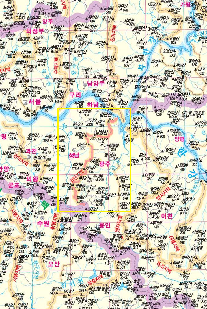 법화산(383.2m), 불곡산(335.4m), 영장산(414.2m), 검단산(536.4m), 청량산(497.1m), 남한산(522m), 검단산(658.4m)을 거처 산곡천과 한강이 합수하는 팔당대교에서(하남시 창우동) 그 맥을 다하는 45Km 산줄기를 말한다