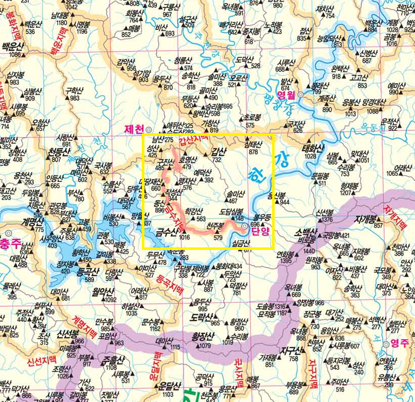 금수지맥(錦繡枝脈)은 영월지맥에서 분기한 갑산지맥의 호명산(虎鳴山.479.3m)에 인접한 5번국도 건너 295. 1m봉에서 남쪽으로 구진산(484.6m), 마당재산(660.4m), 작성산(844.3m), 동산(895.5m), 금수산(1015.8m), 천주봉(579.2m)을 일구고 단양읍내 도전리 남한강 상진나루에서 그맥을 다하는 도상거리 35.3km되는 산줄기를 말하는데 분기점에서 약 1.6km는 5탄약창 군부대안이라 통과할 수 없다.