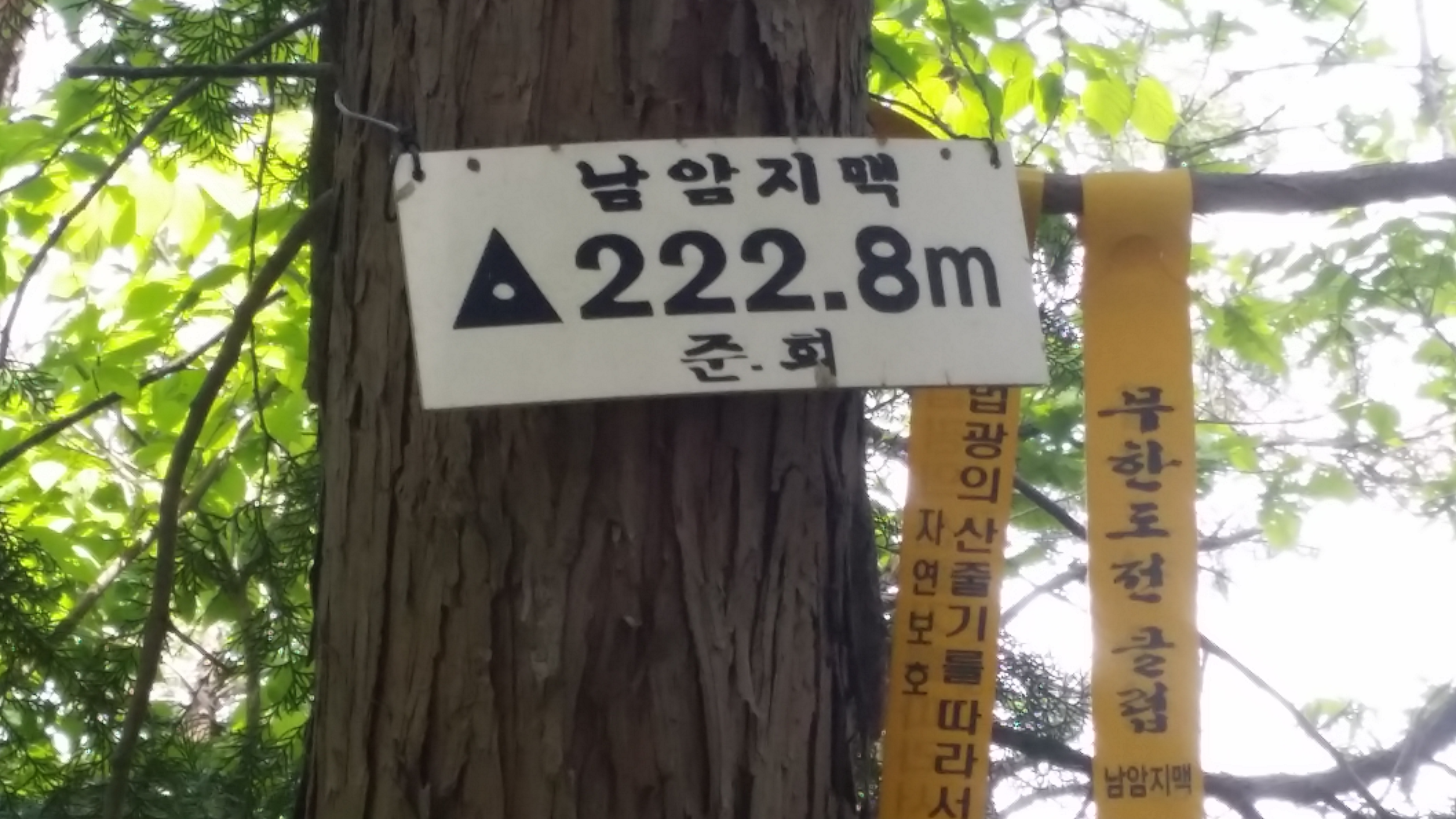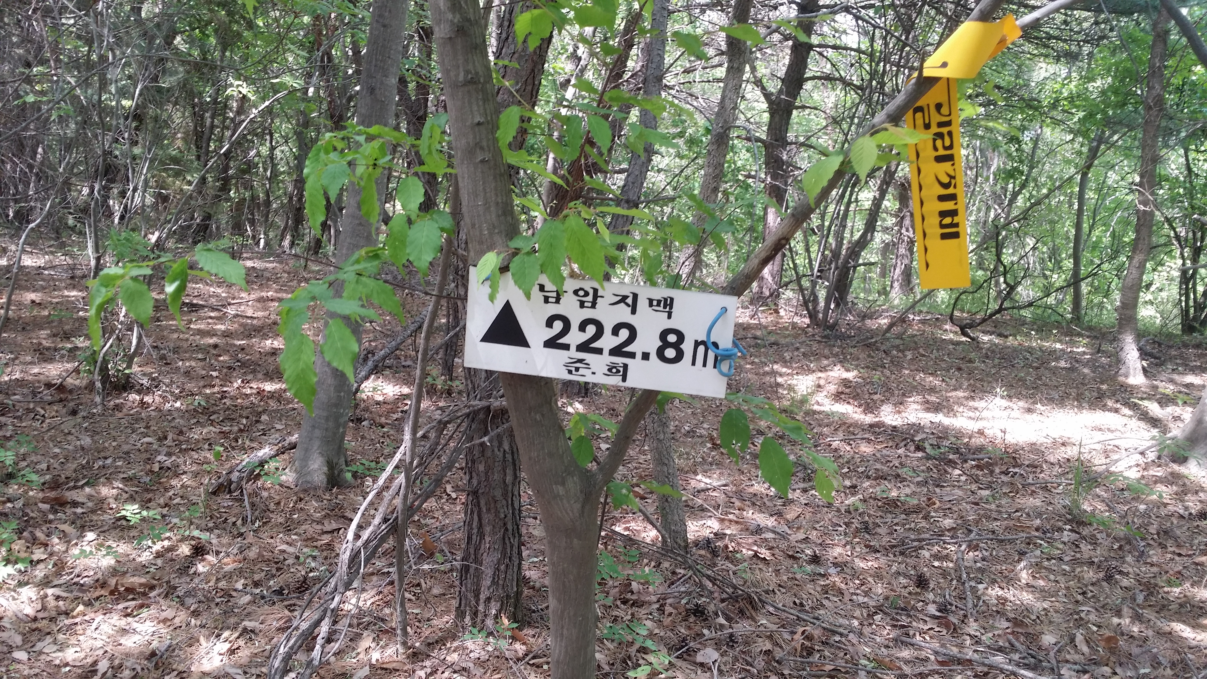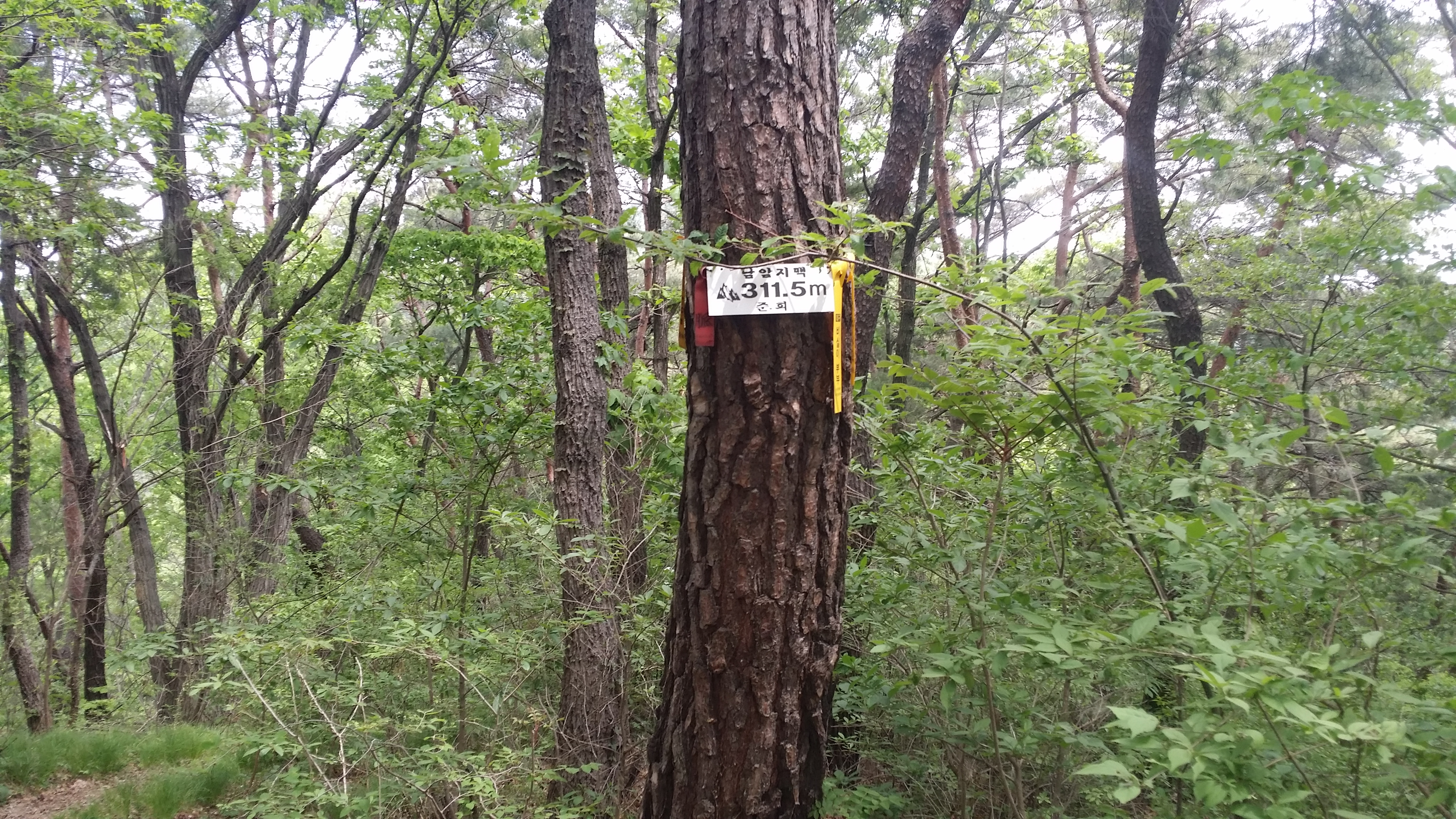 12:54 222.8봉(△)13:02 마루금은 직진인데 우측으로 등로가 형성되어 있다직진해보니 절개지다13:05 주원목재 정문앞으로 내려선다13:08 민우농원을 진입한다13:12 전방 좌측에 가옥 및 승용차 그리고 아낙네가 텃밭에서 김을메고 있다. 우회 루트가 없다. 난감하지만 부딪혀 보기로 한다. 미안하다며 지나가니 별다른 제재가 없다13:25 311.5봉