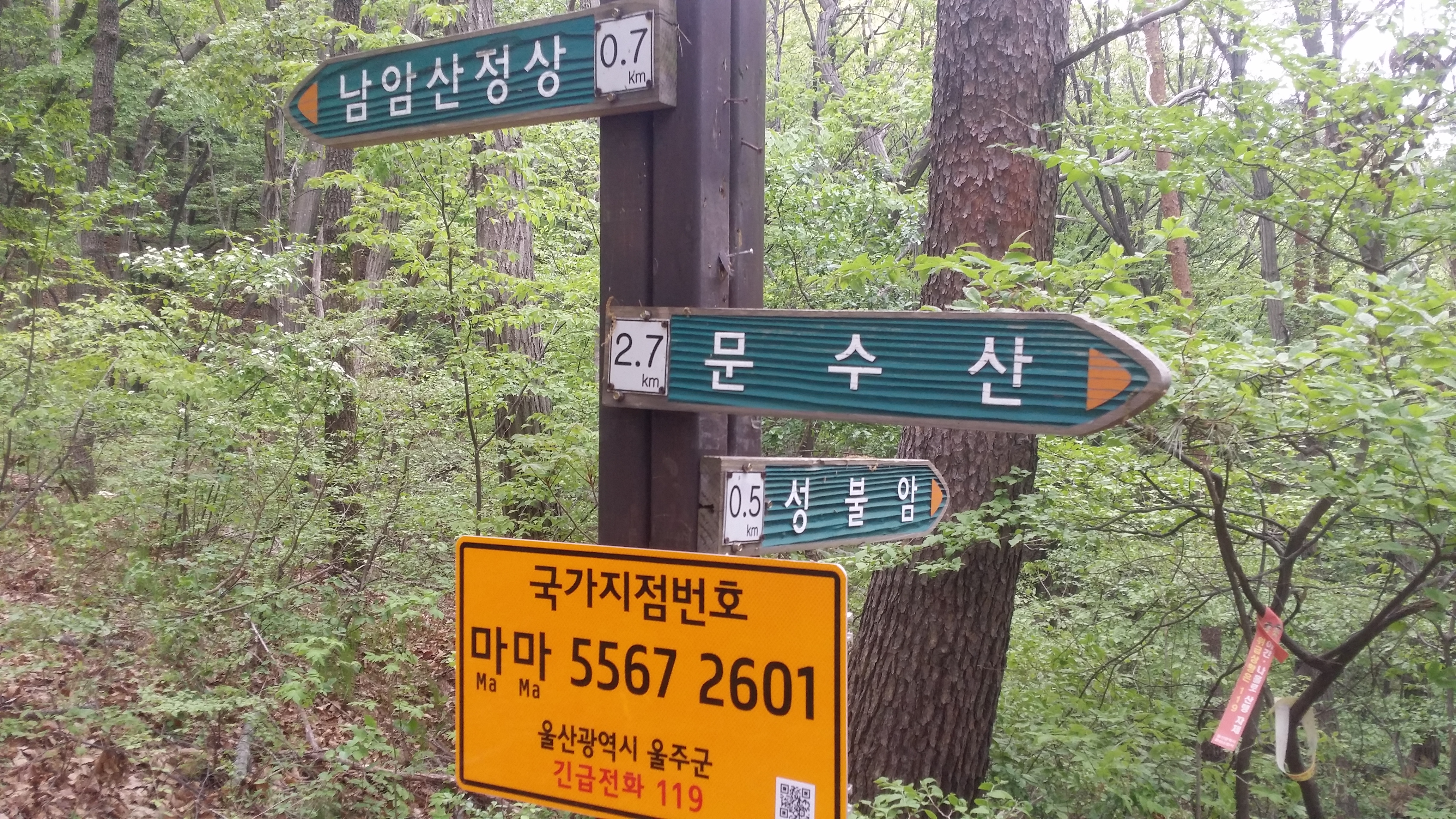 14:03~14:21 남암산(544.4m) 또 밥먹고14:23 문수경기장, 무거동(마지막 관문 문수산)14:33 성불암 갈림길14:43 291.8봉14:48 문수산 오름길이 만만치 않아 보인다14:55 주차장 및 매점15:29 문수산(600.2m)15:39 약수터 갈림길15:48 안부 / 추억의 아이스케끼16:16 영취산(352.1m)16:30 3갈림길16:31 도야지 놀이터