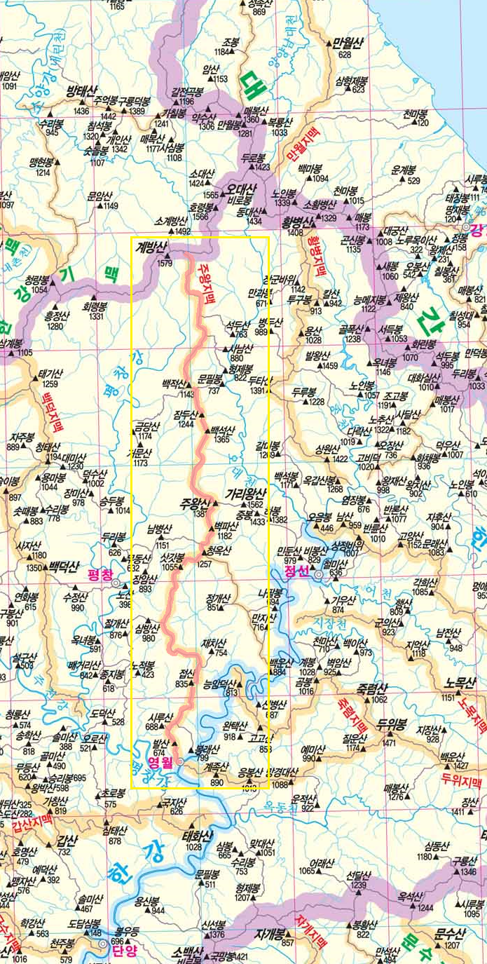 주왕지맥(住王枝脈)은 한강기맥의 계방산(1579.1m)의 동쪽 2.3km[1464.2봉에서 동쪽 210m 지점으로 표고 약 1430m]에서 남쪽으로 가지를 쳐 내려가며 백적산(1142.5m) ,잠두산(1244.1m), 백석산(1364.8m), 주왕산(住王山/1381.4m/2003년 이전엔 中旺山), 청옥산(1257m), 삿갓봉(1054.9m), 접산(835.3m), 발산(674.4m)을 일구고 영월읍 하송리에서 남한강에 발을 담그며 그맥을 다하는 도상거리 80.8km 되는 산줄기다. 이산줄기 동쪽으로 흐르는 물은 오대천이 되어 조양강에 합수하여 동강물이 되고, 서쪽으로 흐른 물은 속사천이 되어 흥정천과 만나서는 평창강이 되고 주천강을 만나서는 서강이란 애칭을 얻고, 동강(한강)과 서강(평창강) 두강은 영월읍 하송리에서 만나 남한강이 되어 충주호로 흘러간다.