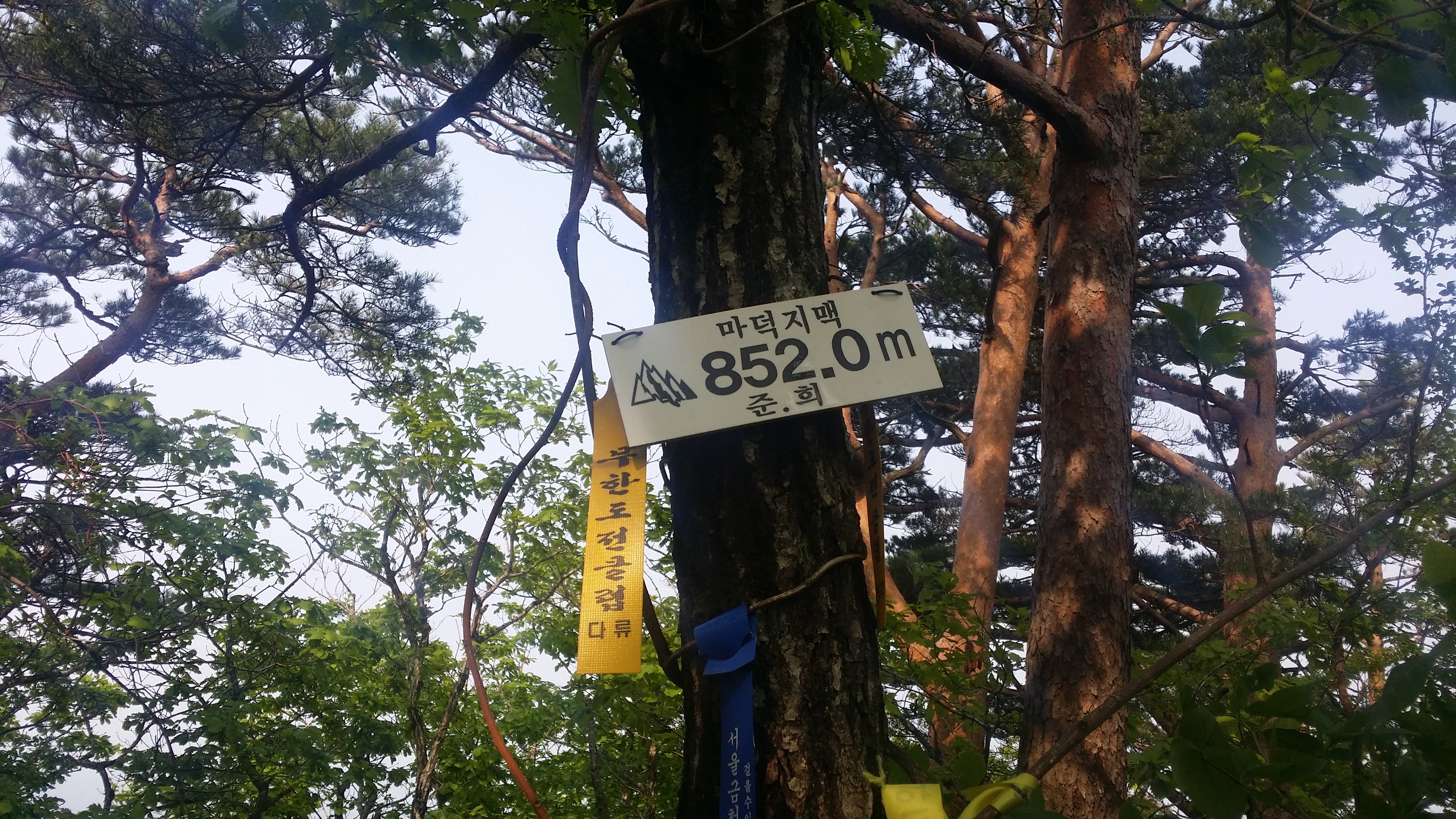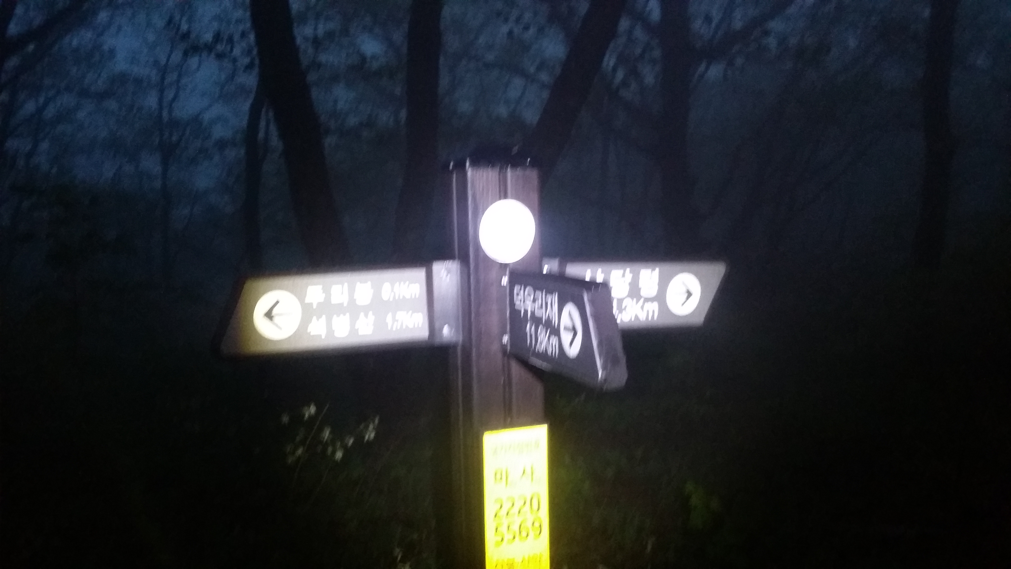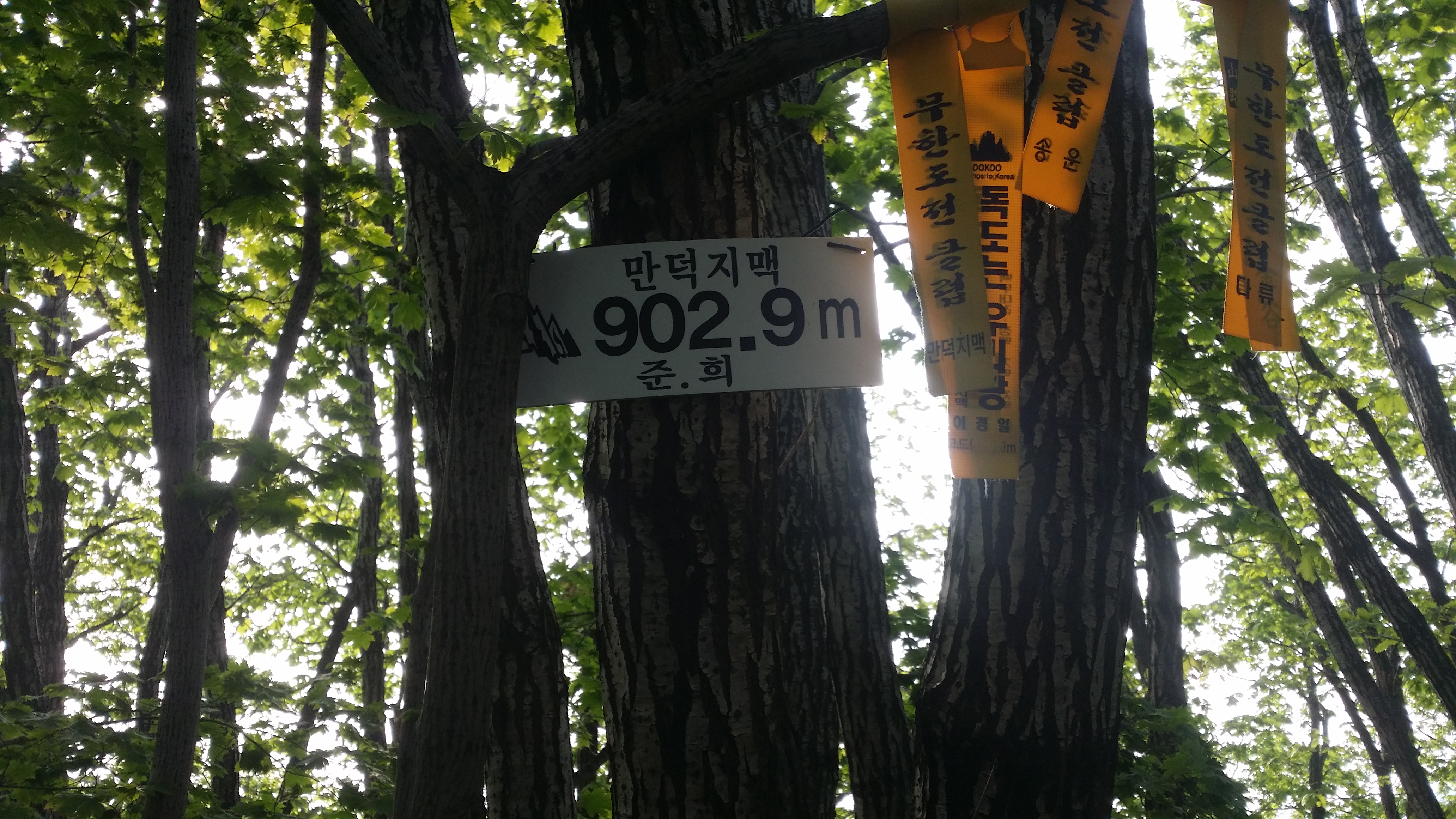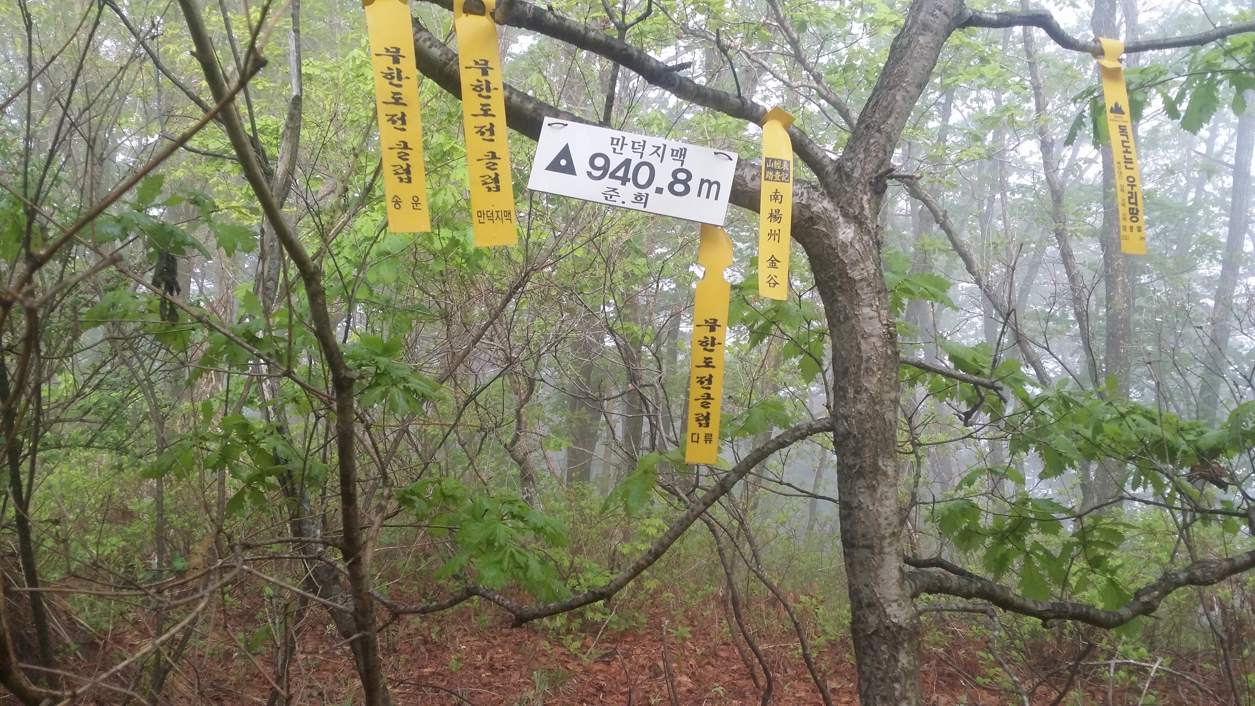 부산 숙등역에서 22시40분 출발하여 구정휴계소(05:56~03:23)에서 카레밥을 먹고 삽답령으로 향한다산행하기에 날씨가 좋습니다. 다행스럽게 강릉 벗어날 시점에 국지적 뇌우가 발생 한다네요03:52 삽당령 / 백두대간 한다고 몇번 들락거려 이제는 낮설지도 않습니다. 예상보다 10분 초과되었네요. 장거리 산행이라 여유시간이 많으면 많을수록 좋는데. 만덕지맥 하기엔 교통편이 뭐해 대간팀에 끼여 와서는 도둑 고양이처럼 사라집니다. 사진찍고 스트레칭하기에는 마음이 급합니다04:10 외고단 갈림길04:17 863.7봉(△)04:54 만덕지맥 분기점 / 두리봉에서 분기하지만 실제 등로는 여기서 부터05:56 두리봉(1033.4m, 만덕지맥 분기점) / 고요한 정적, 몽한적인 안개, 신선한 새벽 공기, 새들의 지저귐속에 걸었더니 기분이 좋다. BACK 대신에 대충 마루금을 잇는다. .05:20 801.3봉05:45 선목치(945.7m)경험에 의하면 렌턴이 필요한 시간은 대략 일출, 일몰 ±30분경 입니다. 즉 오늘 일출이 05:12이었으니 04:42분경쯤 되면 렌턴 없이 산행이 가능하다는 의미죠05:58 임도06:11 만덕봉(△ /1035.3m) 전날내린 비를 머금은 풀잎때문에 등산화에 물이 들어오기 시작합니다. 2년6개월 부지런히 신었는데, 스페어로 돌리고 새로 구입해야할것 같습니다. 이곳까지는 등로 진행하는데 어려움이 없었습니다. 이제부터 970.4봉(칠성산?)까진 등로가 희미합니다 만덕봉에서 마루금 찾는데 애를 먹습니다. 뚜렷한 등로가 제눈엔 안보입디다06:29 919.3봉06:31 등로주의 / 좌로, 내려서는길에 뚜렷한 등로가 안보입니다06:57 940.8봉(△)07:02 문제의 칼날바위 / 사진에선 안보이는데 바위 아래에 작은 소나무 가지가 있고 비실이님 시그럴이 있다. 그 부분에 칼날바위를 오를수 있는 홈이 있다 . 일단 올라서면 자유롭게 이동할수 있을만큼 넓고 안전하다우측으로 내려 서기에는 위험하다 바위위를 10m 이동하면 나무에 의지하여 점핑할수 있는 곳을 찾을수 있다.(지면과의 높이가 230m 정도며 경사도가 약간있어 점핑때 뒤로 넘어지지 않도록/밧줄 처리하면 만사 OK인데) 여기만 내려서면 만사 OK07:21 902.9봉07:38 898.9봉08:08 970.4봉 오름길 등로상태 및 각도가 세다지나온 마루금을 되돌아보고조금 더 이동하니 웬 칠성산? 아무튼 밥먹기에 장소가 직인다 (08:11~08:24) 이곳부터 매봉산 갈림길까진 등로 정비가 되어 있다08:33 법왕사 갈림길08:46 칠성산(△ /953.7m)08:52 법왕사 갈림길08:56 852봉09:04 탑동 갈릴길09:18 매봉산(820.7m)