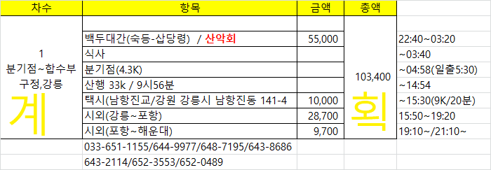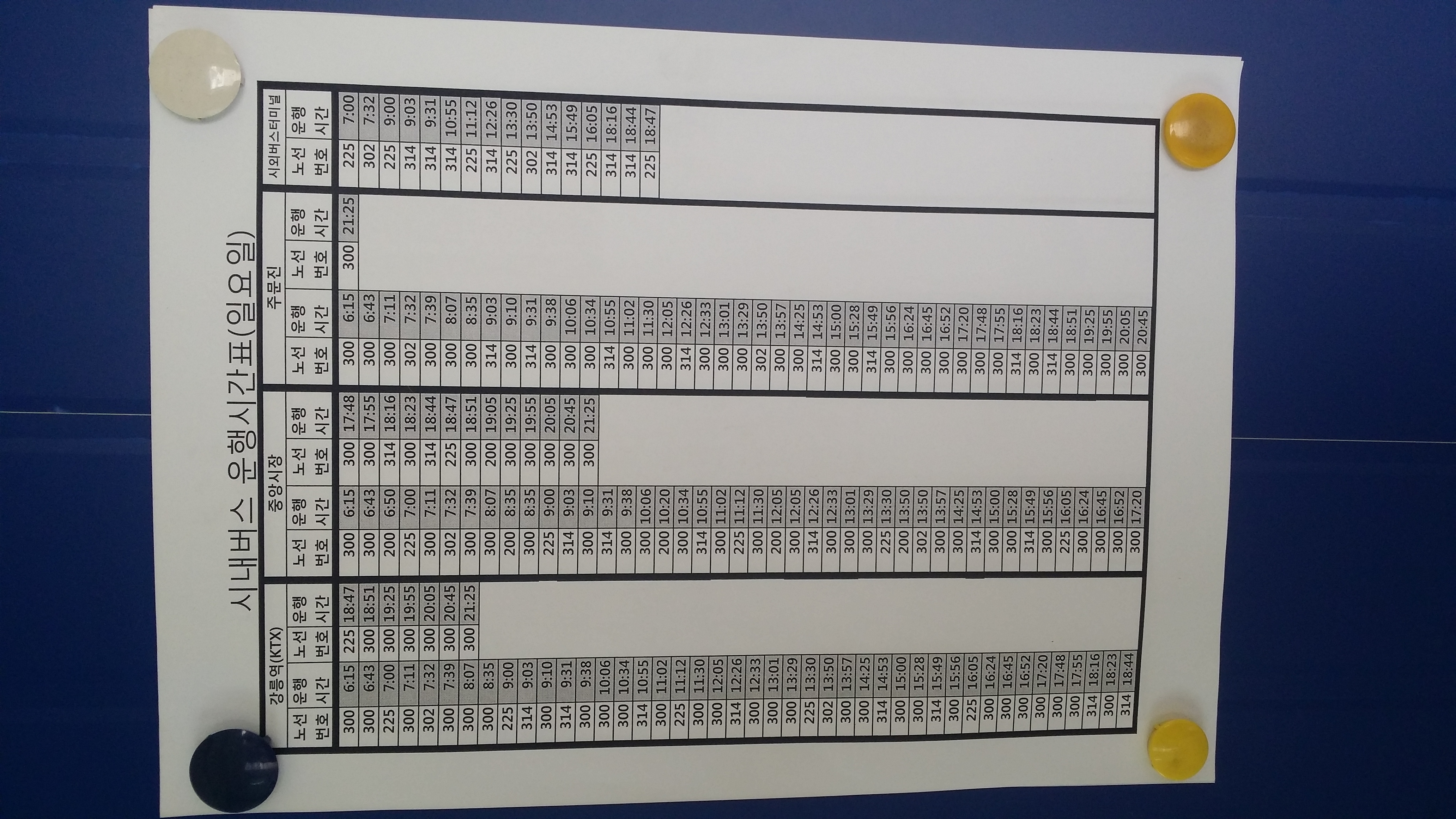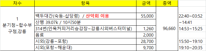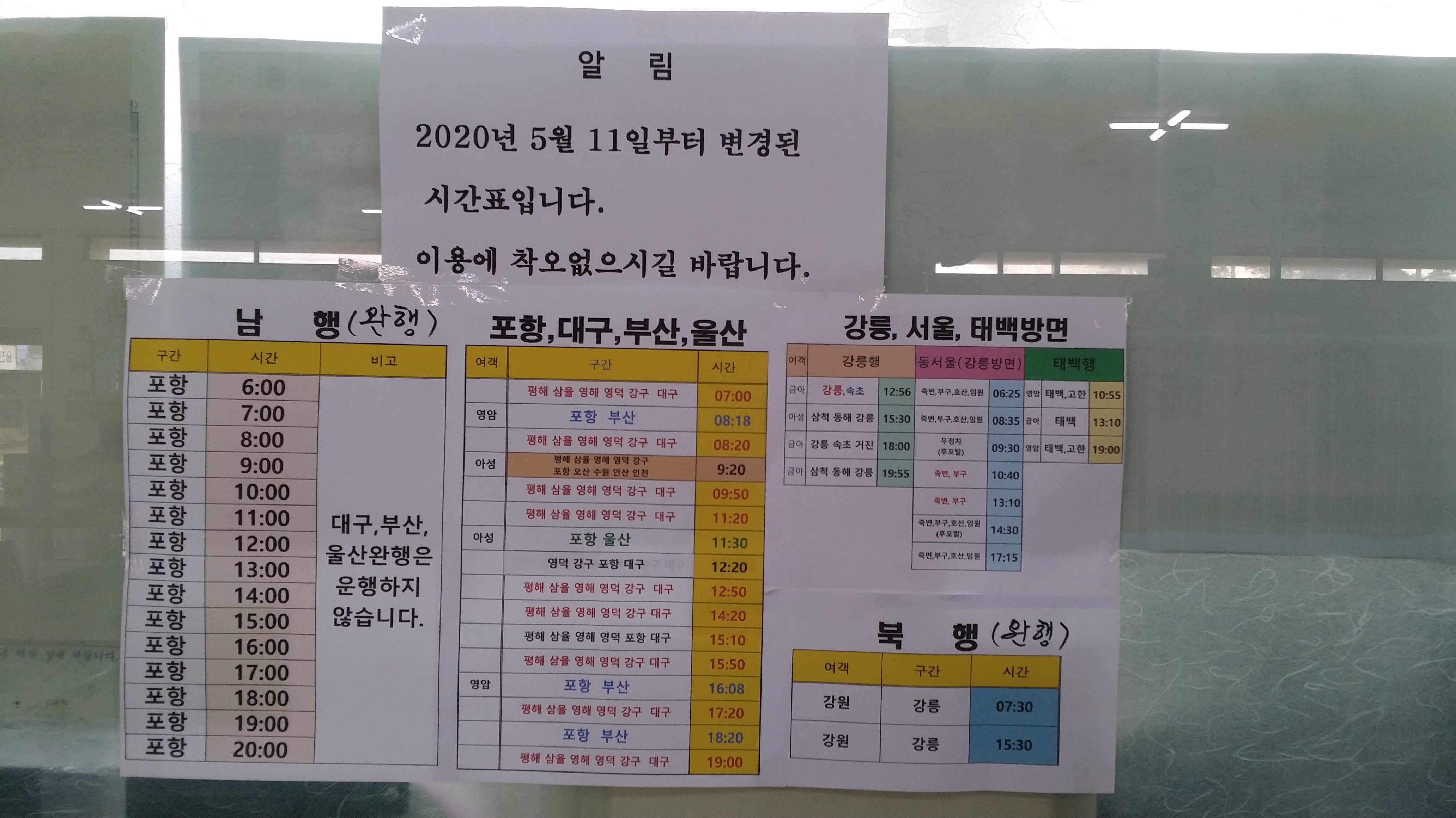 09:23 우측으로 삼각점(813.6봉)이 있어 왔더니 웬 매봉산?(813.6봉에서) 지나온 마루금(813.6봉에서) 구정면 남강릉 IC09:50 송이막09:52 601.6봉09:59 송이를 재배하고 있기는 있는건지10:09 552봉10:22 603.5봉(△)매봉산10:35 송이막 .10:45 난대식물원 갈림길 / 합수부까지 거의 도로10:50 샘물쉼터 갈림길10:53 301.7봉10:56 샘물쉼터 갈림길11:00 등로주의 / 좌측으로11:10 개인사유지11:14 동해고속도로모심기 직전보리밭11:44~11:56 고속철도 / 햇빛도 피하고 바람도 불어 밥먹기에 안성마춤강원도 이미지에 안맞게 넓은 분지다12:09 자조와리 정류소12:13 강릉바우길 15구간 안내문12:30 해파랑길12:34 78.8봉12:39 장현저수지 갈림길12:44 보리사12:46 7번 국도위12:51 강릉전축박물관 까페12:59 독갑재13:06 강릉 동은 고택13:11 마을슈퍼13:25 36.3봉13:42 도로변에 18.7봉(△) 삼각점이 있다13:45 덕봉사13:59 33.1봉14:18 병산배수장14:21 강릉 남대천&섬석천 합수점14:41 시간적 여유가 있어 버스를 타고 이동한다314번(14:52~15:25)을 타고 시외버스터미널에 하차하여15시50분 강릉을 출발 17시16분 울진에 도착 휴식하고 17시30분 포항으로 떠난다. 강원에서 부산가는 버스가 포항에서 한템포 쉬고 어떤땐 포항에서 종료하고 부산가는 버스로 대체 승차권을 교부하는데 버스 회사가 안맞으면 1시간을 기다려야 하는 웃기는 사태가 발생하여(경험) 포항까지만 끊었는데 이차가 포항에서 19시20분(19시15분경 도착예정)에 부산으로 출발하라는 배정을 받고 똥줄나게 달리며 기사님의 불만스러운 멘트들이 발사 된다. 덕분에 19시10분 해운대가는 버스를 바로 탈수있는 행운이...울진시외버스 시간표 / 아마 울진출발 시간만 기재된것 같다. 강릉, 태백에서 경유하는 버스 시간은 생략되었다. 이노선은 여유 좌석이 있어야만 승차 가능하다. 따라서 차량이 터미널내 진입해봐야 안다. 18년12월 쇠치지맥때 태백에서 오는차가 여유 좌석이 없어 못탄적 있다