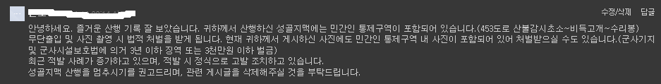 2020년 5월 평소 산행에 도움 받는 산바래님 블로그가 갑자기 폐쇄 되었다 지리산 국립공원에서 비탐방 산행에 대하여 추적, 계도 한다는 언론 보도와 연관이 있을까 하는 추측과 아쉬움으로 지내다 몇주후 다시 오픈되어 기쁜 마음에 훝어보다 성골지맥 1구간이 삭제된걸 발견했다. 당시 제주 해군 기지에 민간인 무단 침입 사건등 일련의 군기강 해이로 언론에 입방아 오르더니 453도로 산불감시초소 ~ 비득재 ~ 수리봉 구간은 민간인 출입금지 구역으로 산행 후기 및 군사 시설에 대한 사진을 게재할시 처벌 될수 있다는 경고로 모두들 산행 후기가 삭제 되었다.