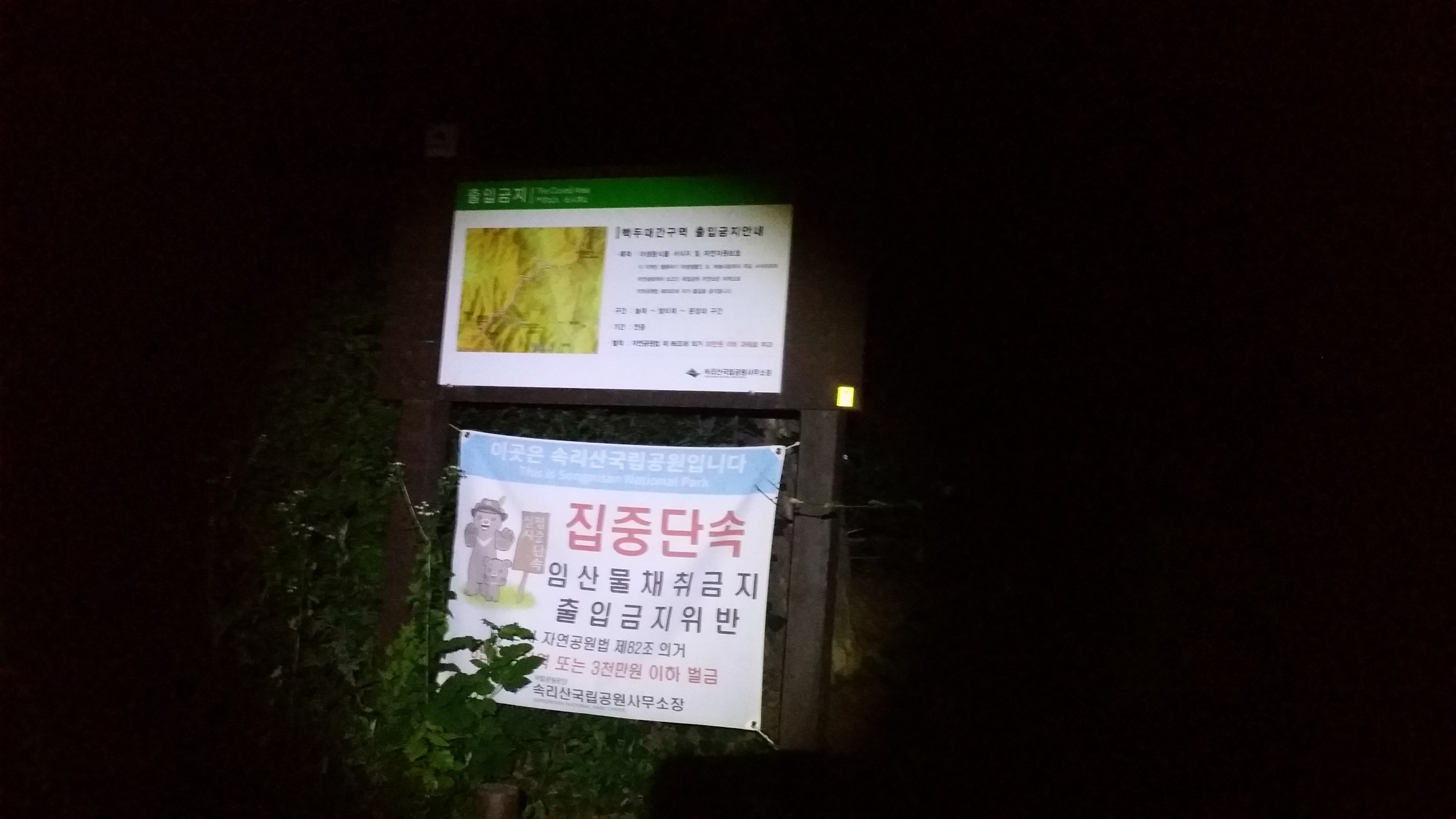 03시07분 정면에 센스형 무인카메라가 있다. 우측 샛길로 접어들어 10m 우회하다 정상등로를 만나 다시 우측으로 진행하여야 하는데, 이번 구간엔 무인카메라가 3대나 있다. 빠세대장이 속리산구간은 단속이 심해 밤티재, 문장대에서 단속된 사례가 있다며 제일 조심하여야할 1호 였는데, 내가 저놈을 찍는다고 후레쉬를 비춰서 일까 센스형이라 우회 구간이 근접해서일까 잠자는 사자를 깨웠다. 여기서 당황 했는지 우회하여 우측으로 진행해야 하는데 좌측, 카메라앞으로 선두가 움직인다. 카메라는 바쁘다, 쉴새없이 경고한다. 선두가 알바를 눈치채고 다시 카메라 앞으로 되돌아 나온다 초반부터 개판되었다. 찜찜은 했지만 설마 이른 새벽 밤티재에 국공이 단속하겠냐는 나름 위안을 갖고 진행한다