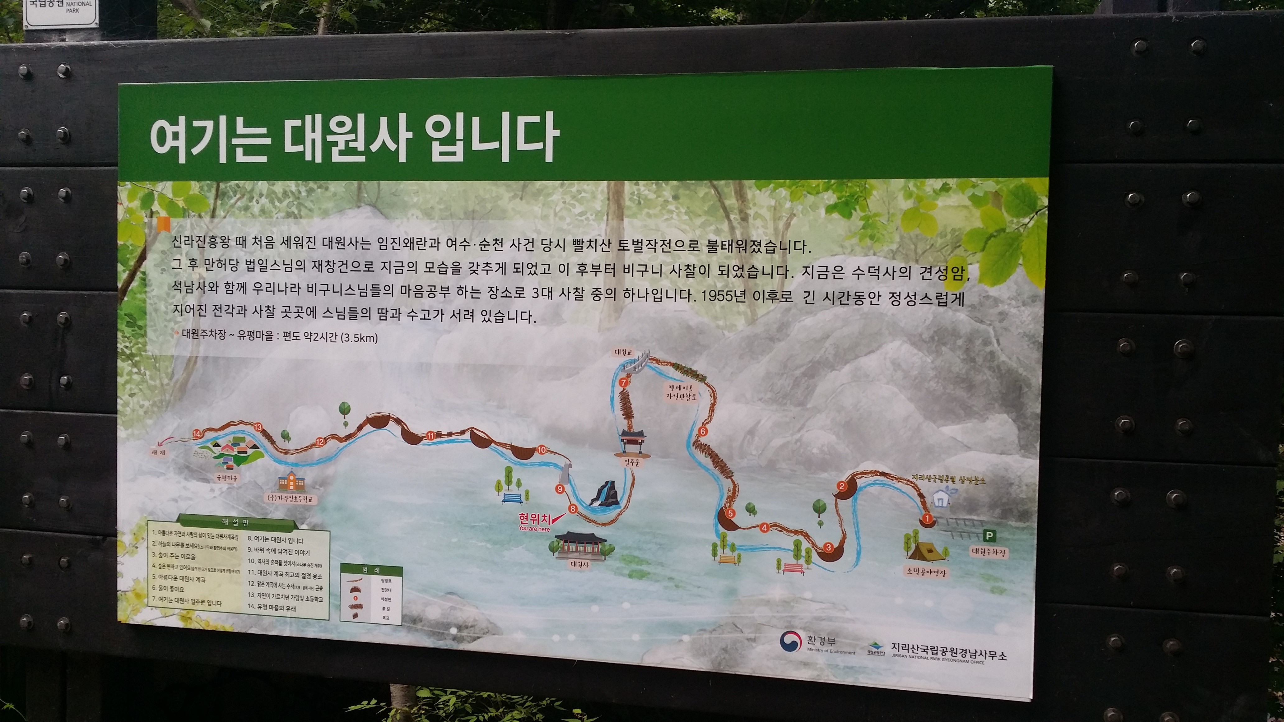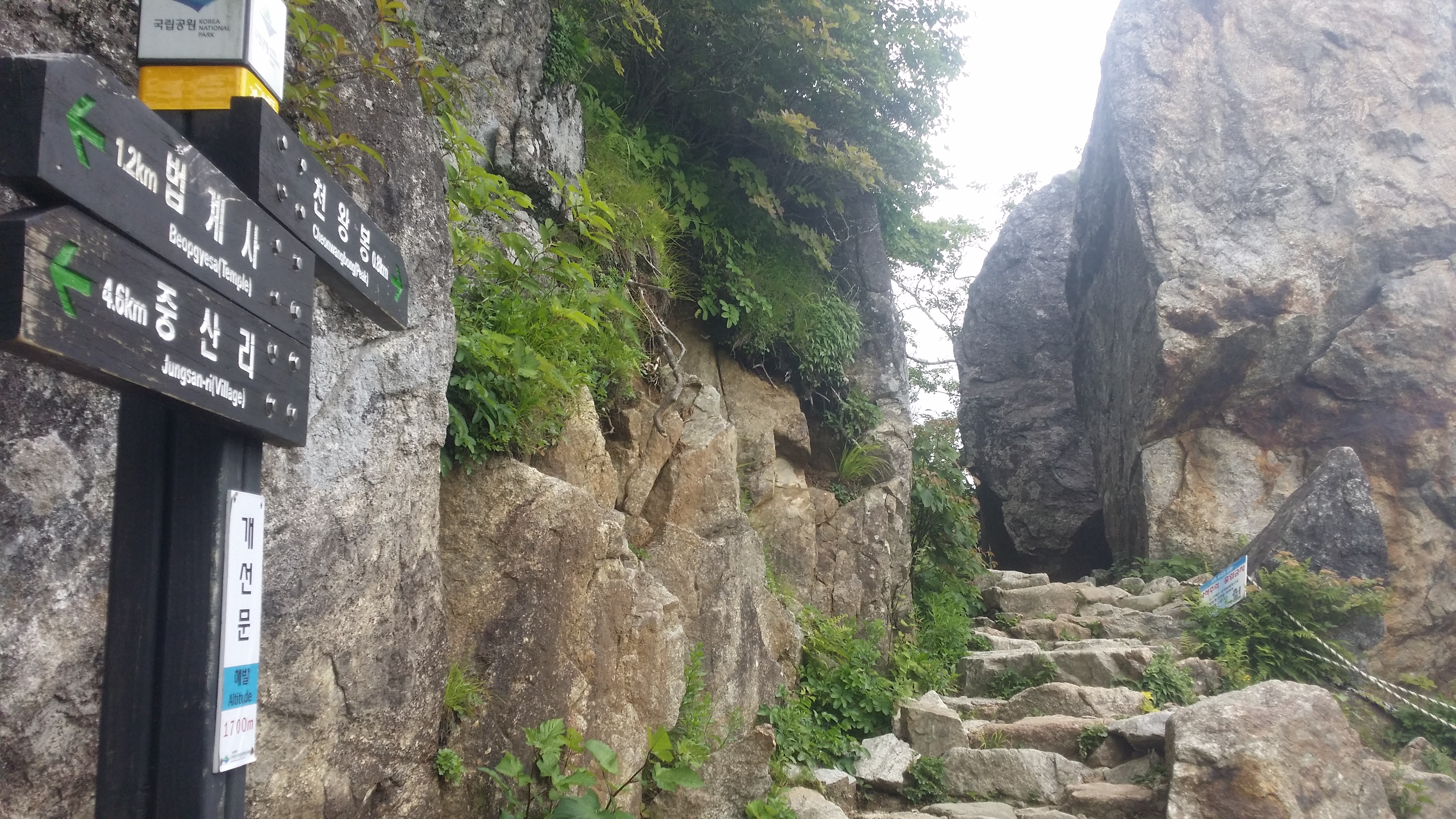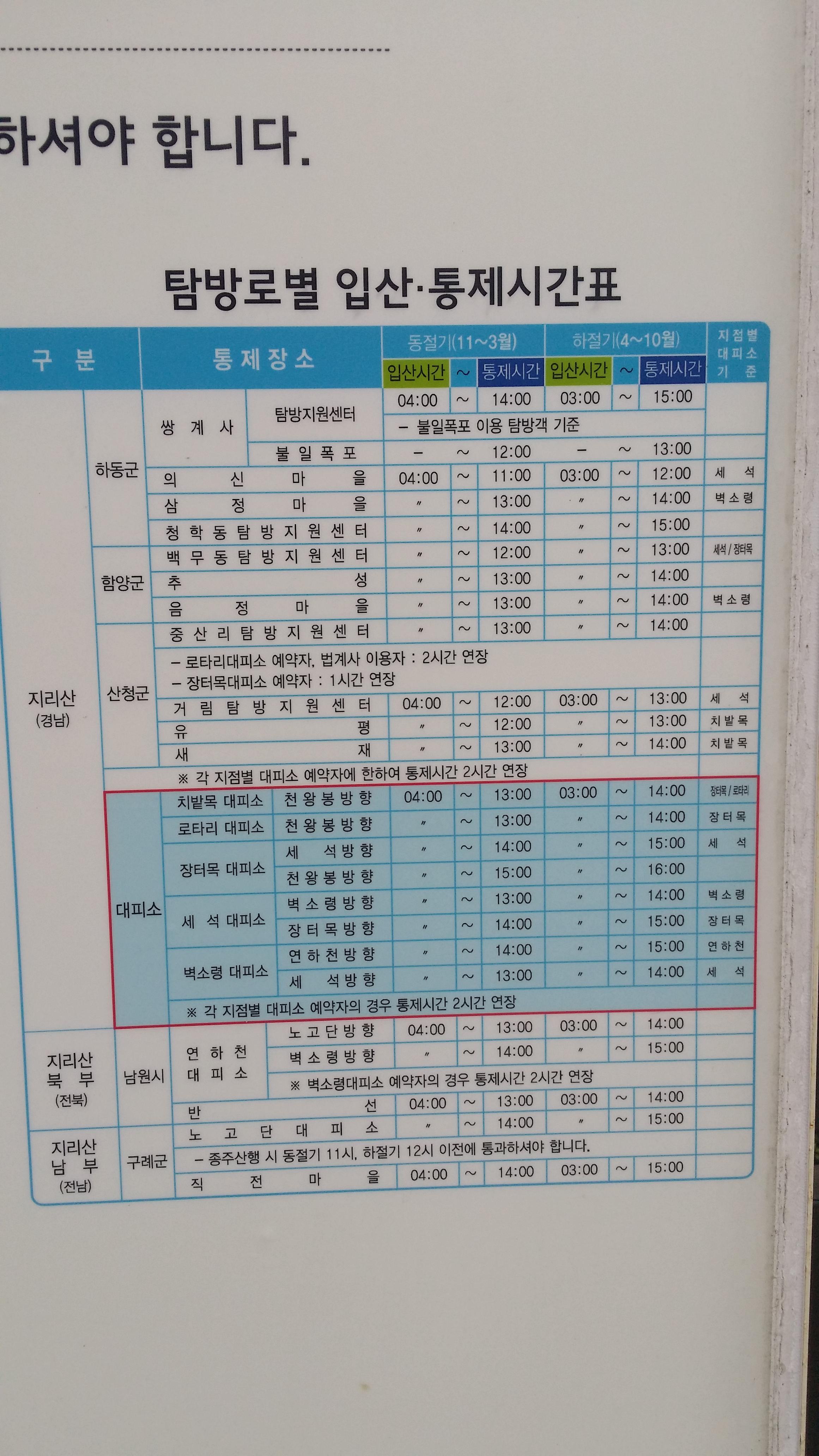 탐방지원센터에서 출발하는것과 순두류에서 출발하는것과는 약 0.9Km 차이가 있어 20분 격차를 극복, 대원사주차장에서 막차를 탈수 있다는 희망이 보인다. 길 조 타10:15 생태탐방로 입구10:22 출렁다리10:26 출렁다리10:46 광덕사교11:03 로타리 대피소/ 예상보다 30분 세이브헉 전방에 공단직원이 사진을 찍으며 오르다 보니 천왕봉까지 따라간다11:05 샘 / 천왕봉 오름길을 가볍게 하기 위해 천왕샘에서 물을 보충 하기로 하고 목만 축이고 간다11:06 법계사 일주문선답자 산행기를 보니 대포카메라가 필요 없을것 같았는데, 아쉽다11:43 개선문12:10 천왕샘을 뻔히보고 아무 생각없이 그냥 지나쳐 버렸다. 다행히 날씨가 좋아 여기까지 물 한모금도 안마시고 왔으니 날머리까지 걱정이 안된다. 천왕봉 아래 포토죤에서 사진을 찍으며 관리공단 직원의 이동경로를 주시하니 장터목 대피소로 이동한다