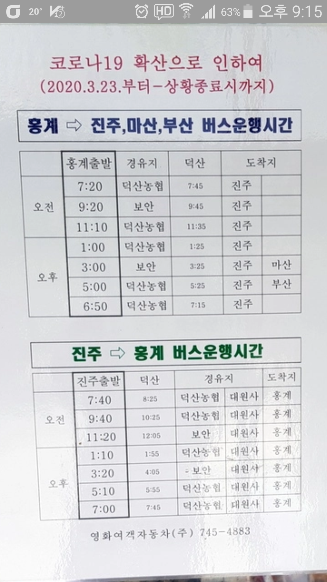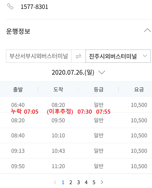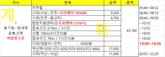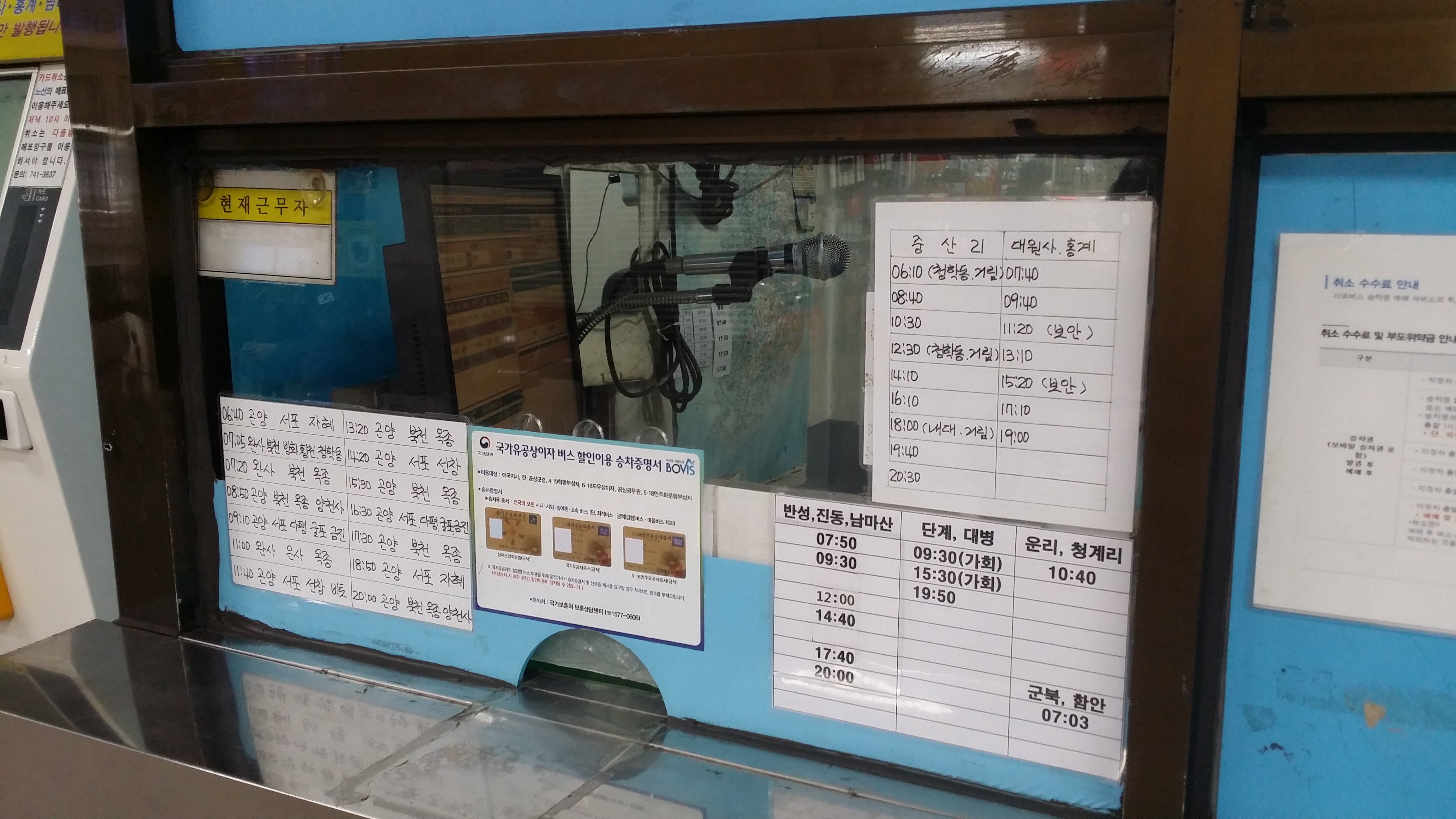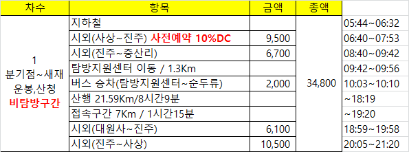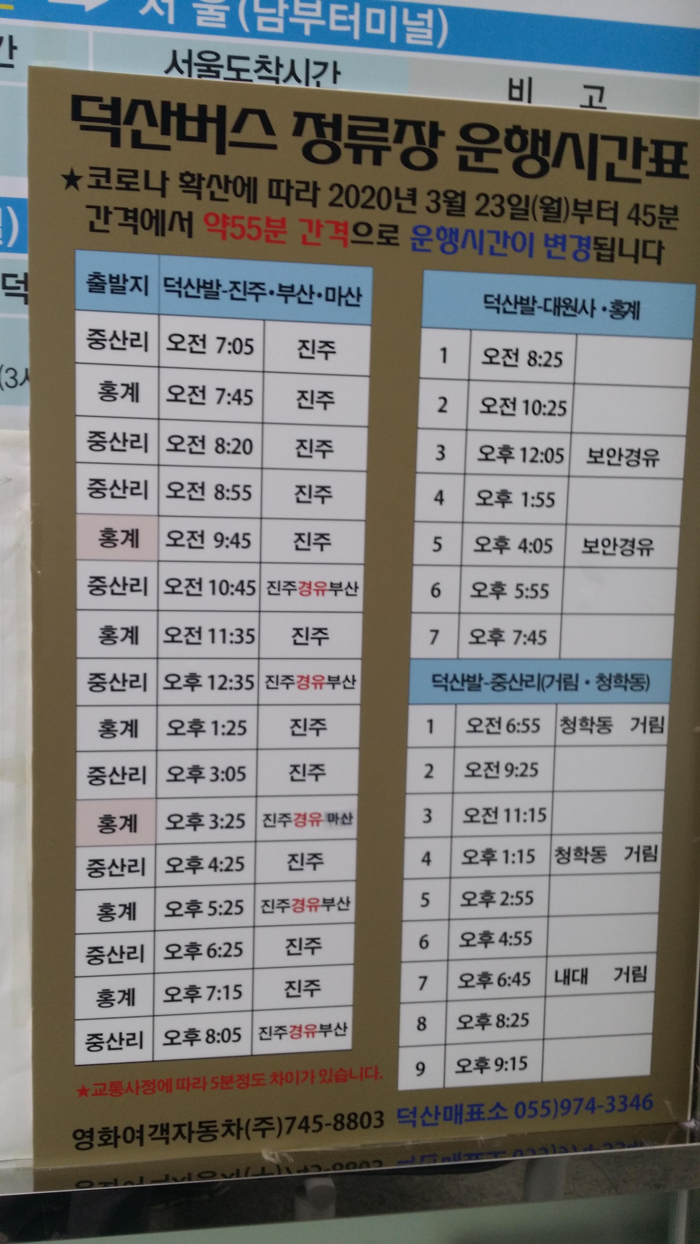 코로나19로 인하여 버스 시간이 많이 단축되어 혼자서 산행하기가 힘들어졌다. 동 시간표는 버스타고에 올라온 시간표로 6시40분~08시20분 사이 배차시간은 현장발매로 전산에 안올린것 같다. 7시5분은 창구 아가씨를 통해 확인된 사항이고 7시30분, 7시55분차는 본인 추정치로 장담할수 없다.
