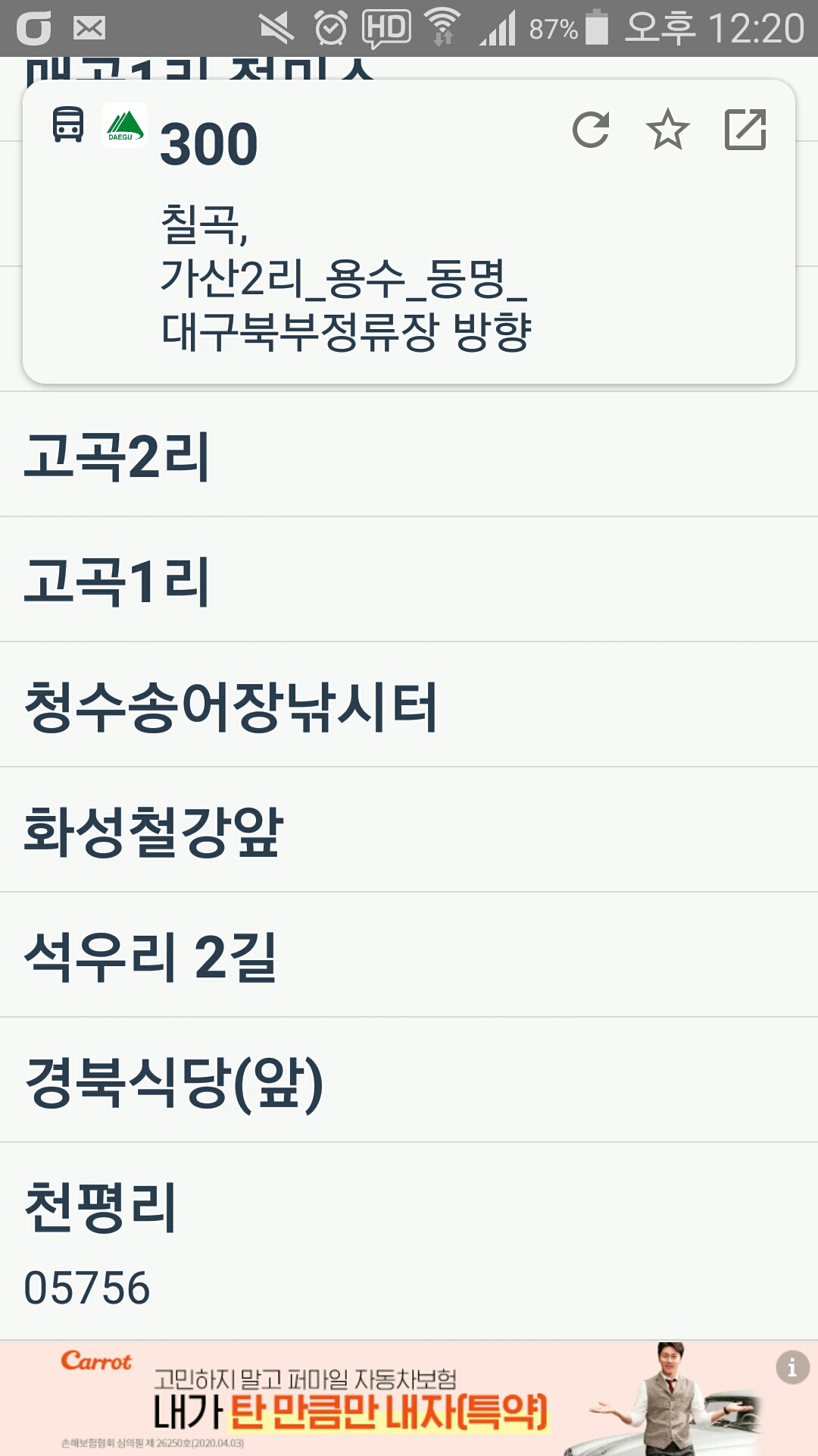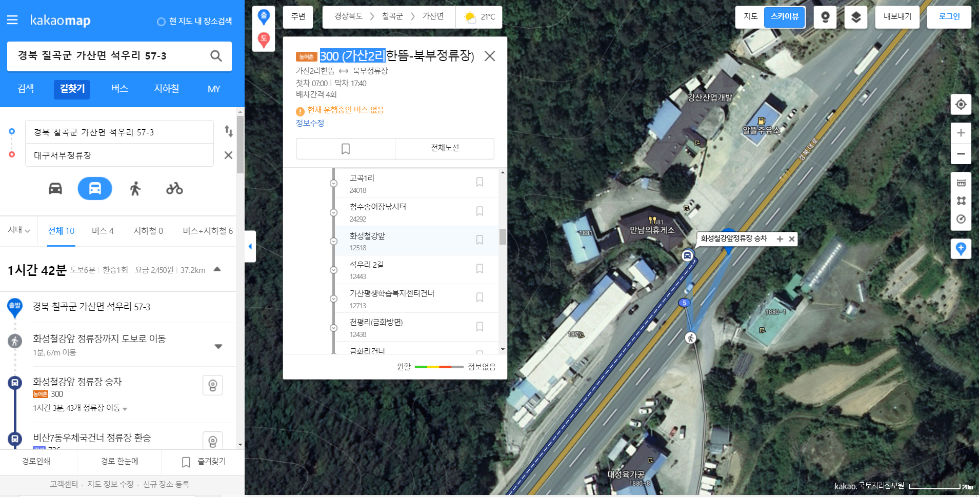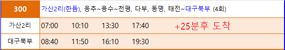 양대 포털사이트 및 전국버스앱엔 화성철강 정류소가 분명 있다(정류장 설치는 안되어 있지만 버스가 정차 가능토록 베이가 설치되어 있다)18시4분 300번 버스가 1차선으로 무섭게 내려 온다. 화성철강앞에서 손을 흔들었다. 이 아찌 늦게 나를 발견 했는지 2차선에 달리는 승용차를 가로질러 급하게 진입하여 세워 준다.만약 300번을 놓치게 되면 800m 전방으로 이동하여 18시45분경 885번 버스를 타고 구미역으로 가면 된다동명면 지나면서부터 traffic jam 발생한다. 18시40분 공단역에서 하차하여 18시45분차 타고 19시13분 동대구역에서 죽으라 달리면(빠른걸음 4분54초 소요) 19시20분 새마을을 탈수가 있는데 깨끗히 포기한다