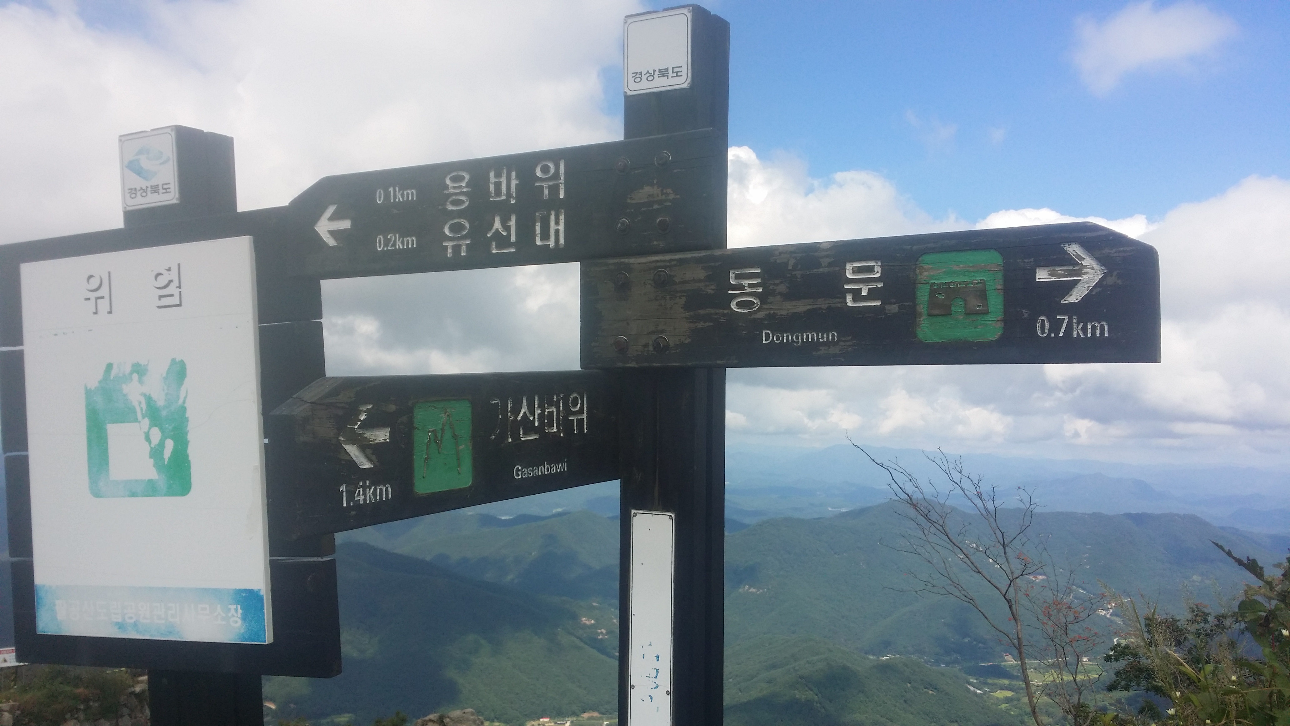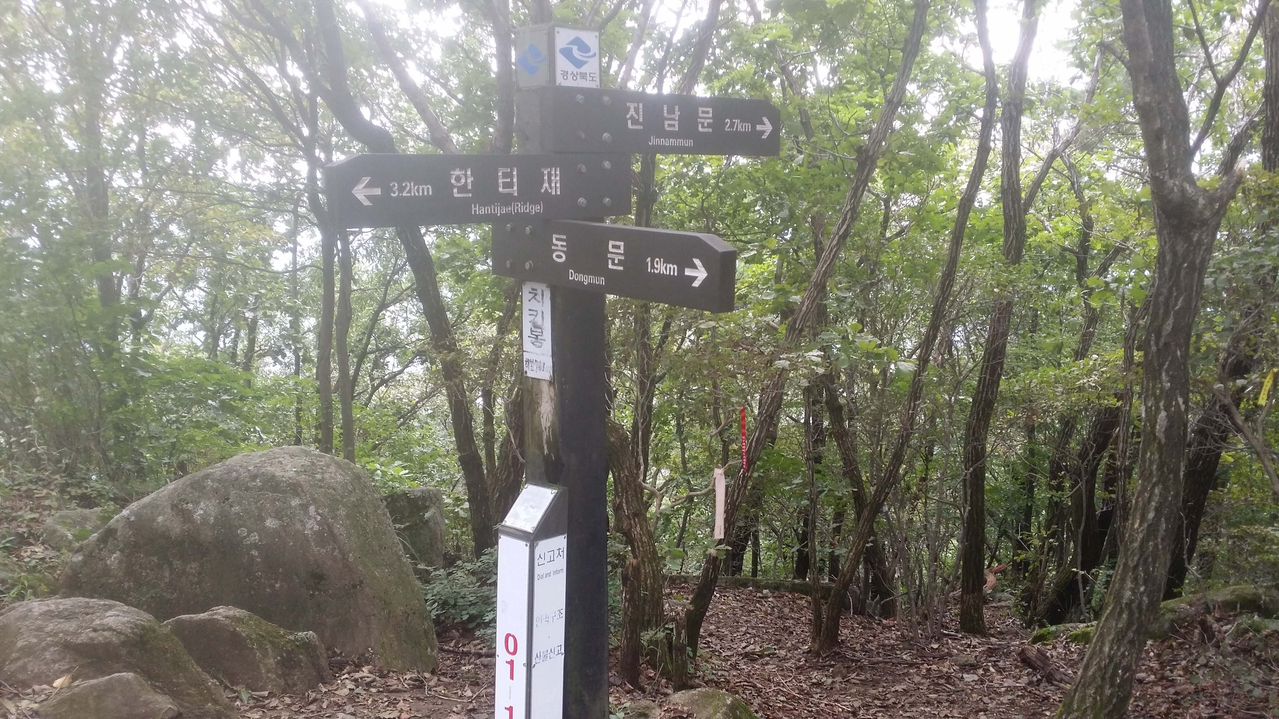 12:01 한티재12:14 783.6봉(△)멀리 가산이 보인다12:24 783.9봉12:43 806.1봉12:54 치키봉(761m)12:58 756.6봉(△) / 예전엔 여기가 치키봉이었는데 위치가 변경 되었다. 날머리 버스 시간이 걱정이 되어 10분이라도 아낄겸 實이에게 주먹밥을 부탁하여 허리색에 넣고 진행하면서 먹는다13:11 전망바위에서13:12 할아버지 할머니바위13:17 752.4봉13:26 동문 갈림길