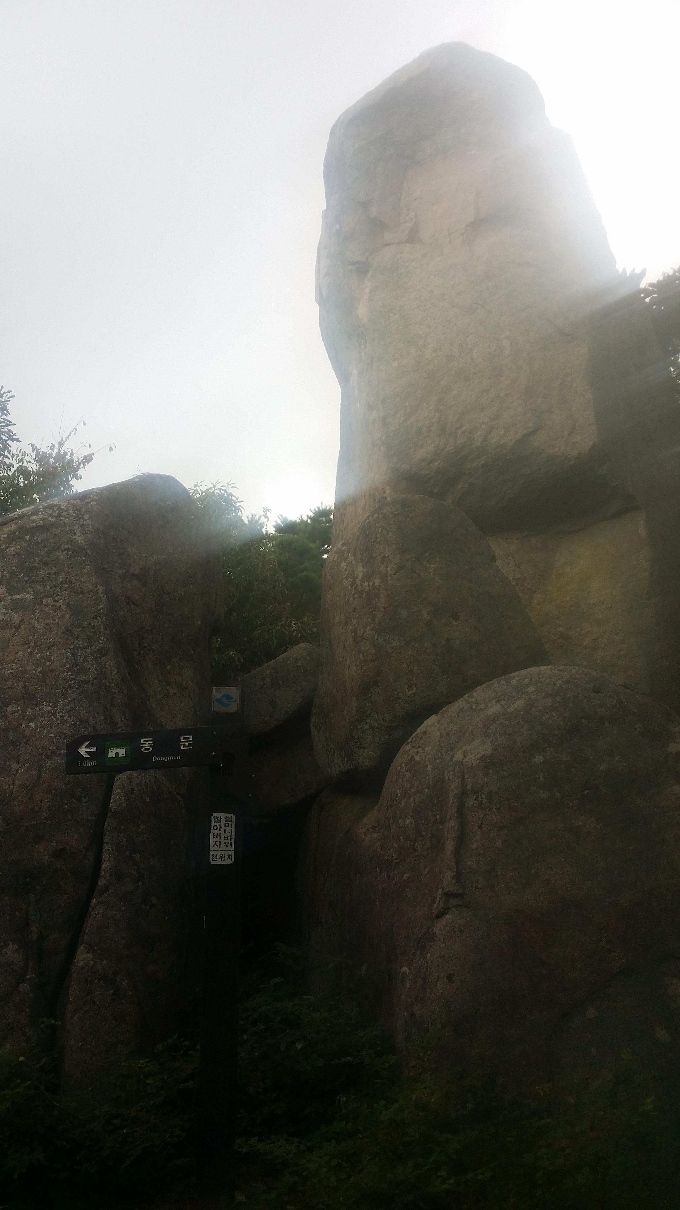 가려는자와 막는자. 가산바위 조금 못비쳐 맥길에 성벽 공사중이다. 일요일임에도 불구하고 공사중으로 현장 출입을 통제한다. 날머리 버스 시간에 쫒겨, 우회길을 생각할 여유도 없고, 생각지도 않은 맥길을 차단하여 망설이다, 금줄을 넘기로 했다. 대신 공사 현장인 성벽길을 버리고 아래 포크레인 진입로로 걷는데, 현장 소장이 다가와 제지를 한다. 못간다고, "미안합니다. 이길을 꼭 가야합니다." 안됩니다. "미안합니다. 가야 합니다. 돌아갈수가 없습니다. 공사에 방해 안되게 조심해서 갈게요." 펜스로 막아 놓아 갈수가 없습니다. "미안 합니다. 꼭 가야 합니다." 너무 합니다. 정말로 너무합니다.~ 맥길이 뭐라고