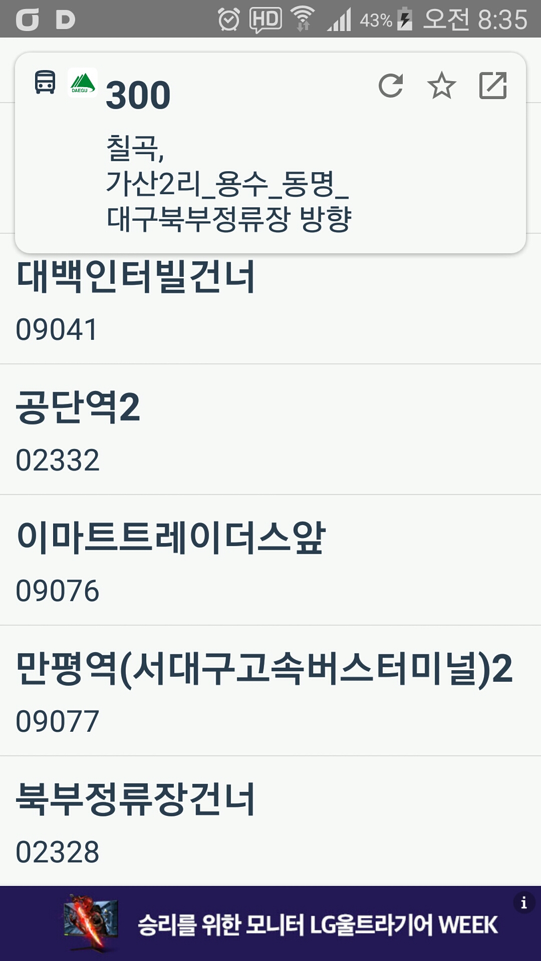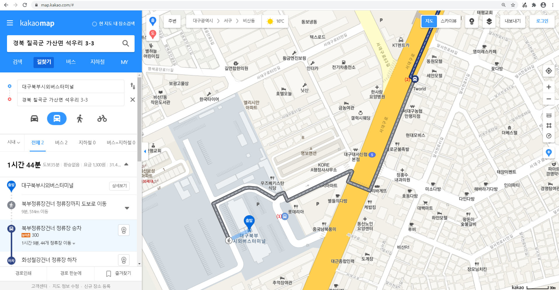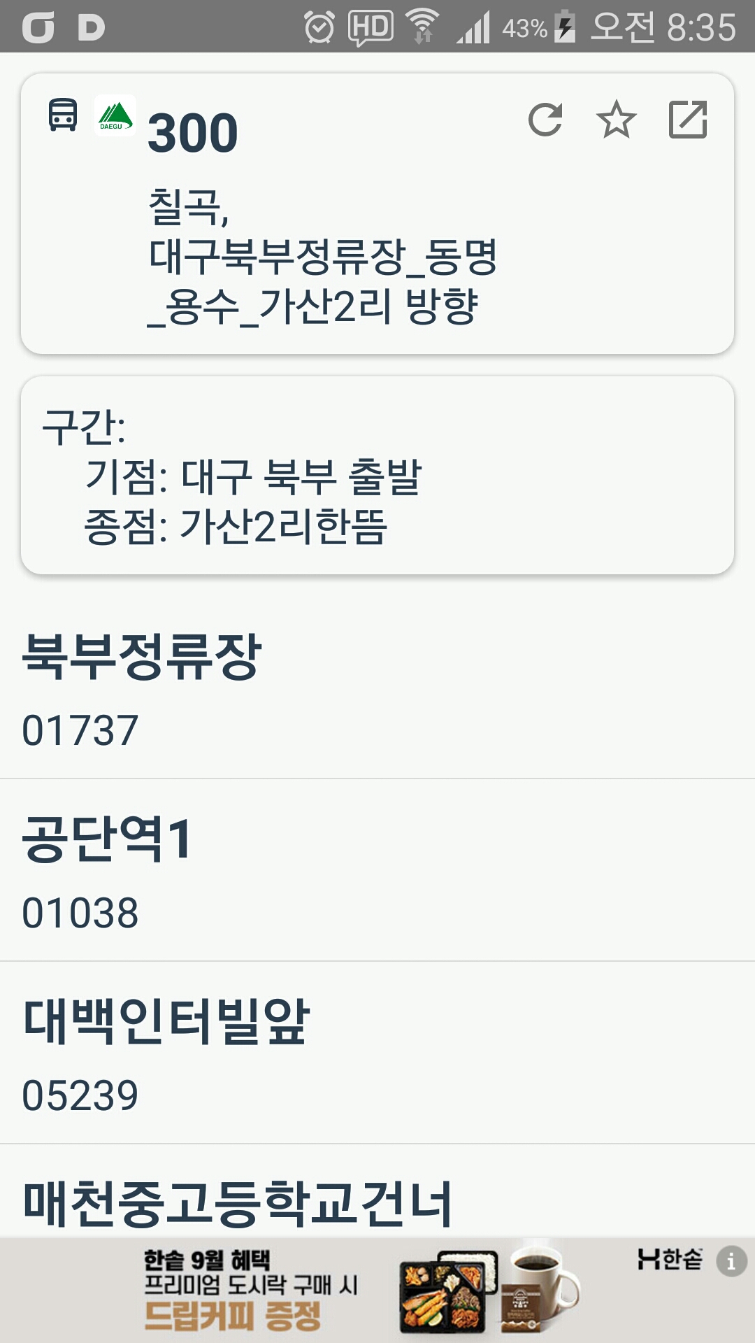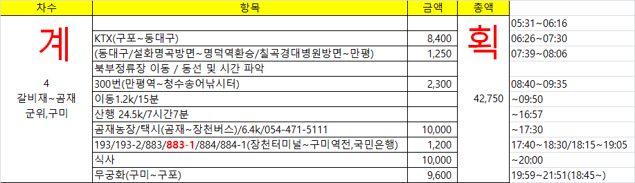 동대구 가는 KTX 비용이 저렴하고 앞으로 진행할 지맥길에 대구 북부정류소를 이용할 기회가 있어 사전답사겸 조금 일찍 출발 할려 했는데, 전날 다시 확인해 보니 이틀전 예약분에 한하여 DC가 되어 포기하고 ITX를 이용한다여유 시간이 있어 만평역에서 북부터미널까지 이동했다(10분 소요)터미널내 300번 승강장이 있을줄 알았는데 없다. 터미널 맞은편 승강장(1)으로 이동하여 알림판을 보니 노선도가 없다. 250번 왜관행은 있는데, 인근 김밥집, 터미널 주차 관리원에게 물어보니 300번 버스의 존재를 모른다. 전국버스앱을 보니 북부정류장건너(세안모텔)에 정류소가 있어 이동하여 노선도를 보니 300번의 존재가 없다. 출발 5분전 불안하여 만평역으로 가기로 한다. 이동하며 내가 가산에서 진행하는 노선도를 봤다는걸 깨달고 북구정류장에서 출발하는 노선도를보니 바로 공단역으로 직행한다. 아 걸어서는 도져히 탈수가 없다. 택시를 탄다. 기사님께 북부정류장에서 공단역으로 빠지는 차로가 있는지 문의하니 있는데 버스가 다니는 노선은 없단다. 공단역에 8시43분경 도착하여 혹 지나 갔는지 걱정 했는데 잠시후 도착한다는 시그럴이 올라 온다.