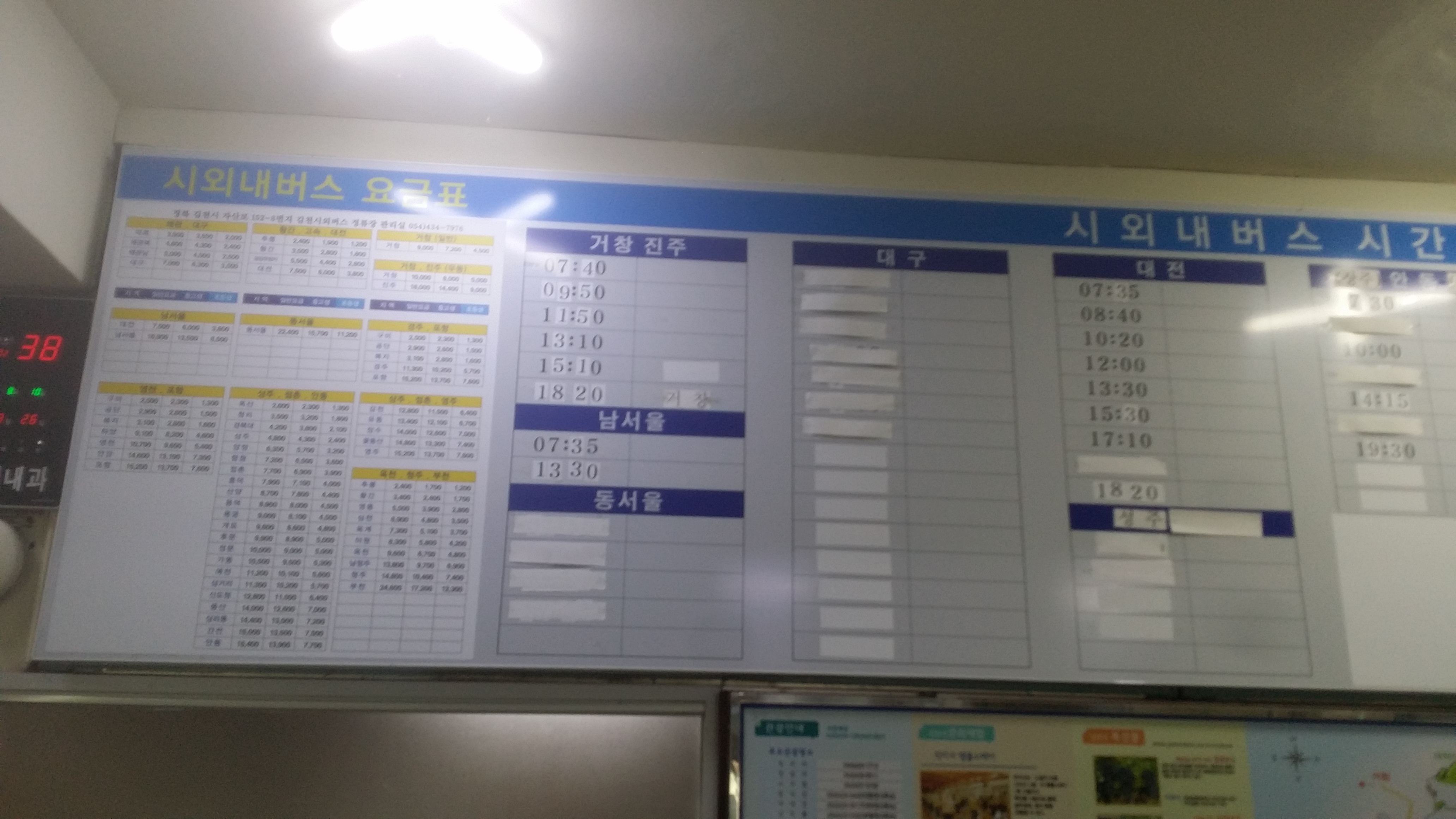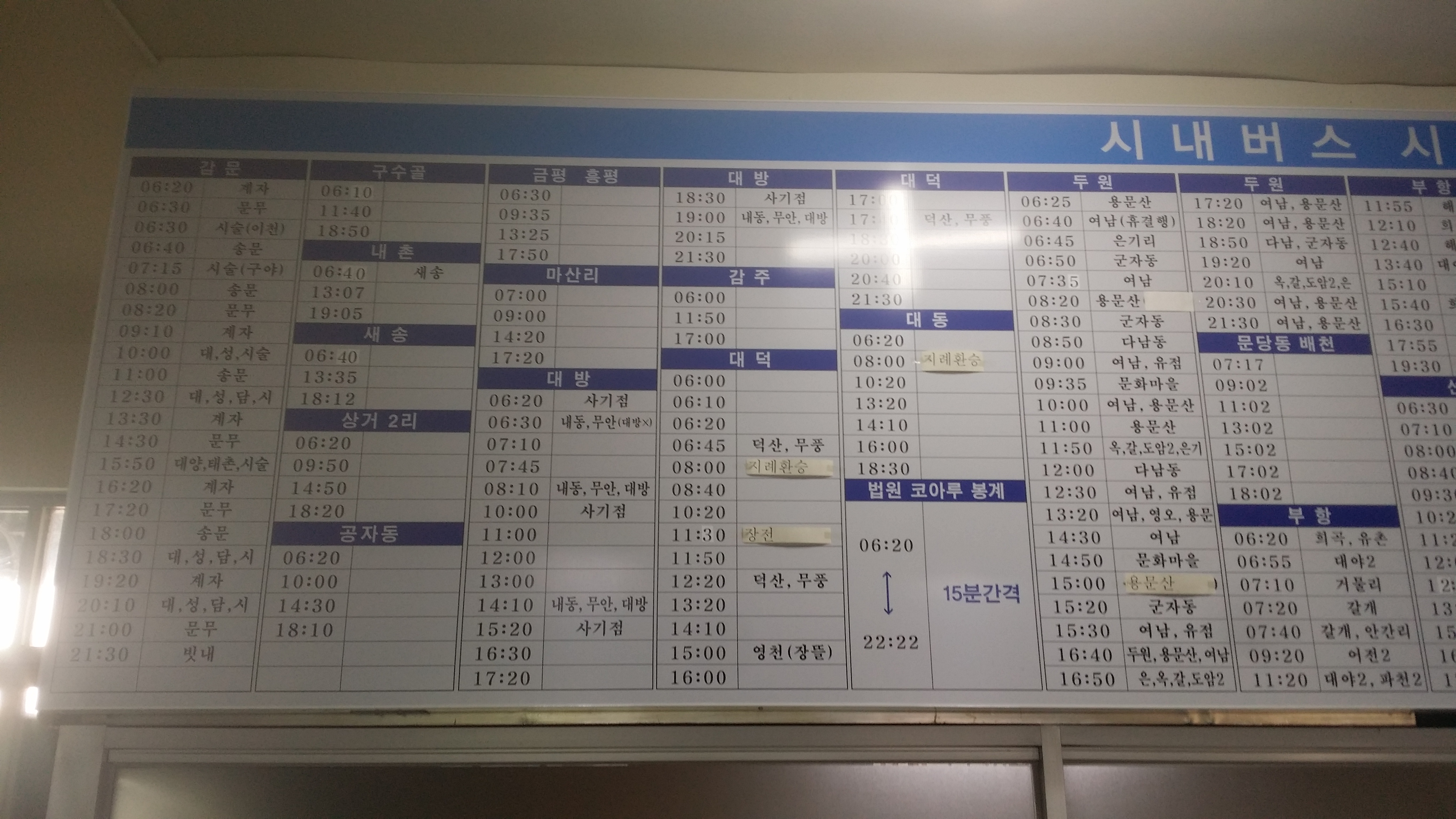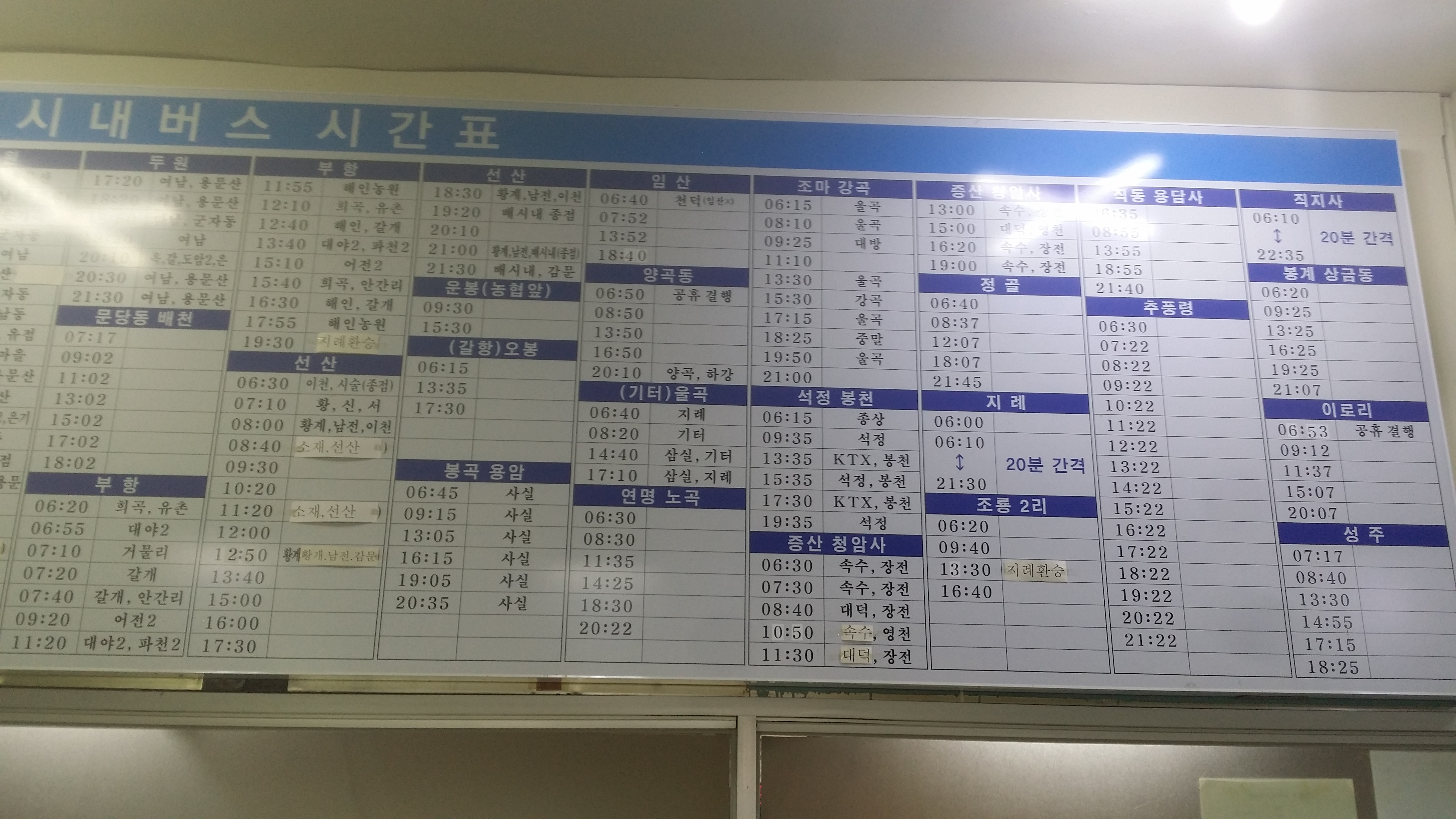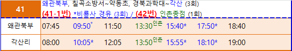 농협앞에서 승차하는 버스 시간표들이다