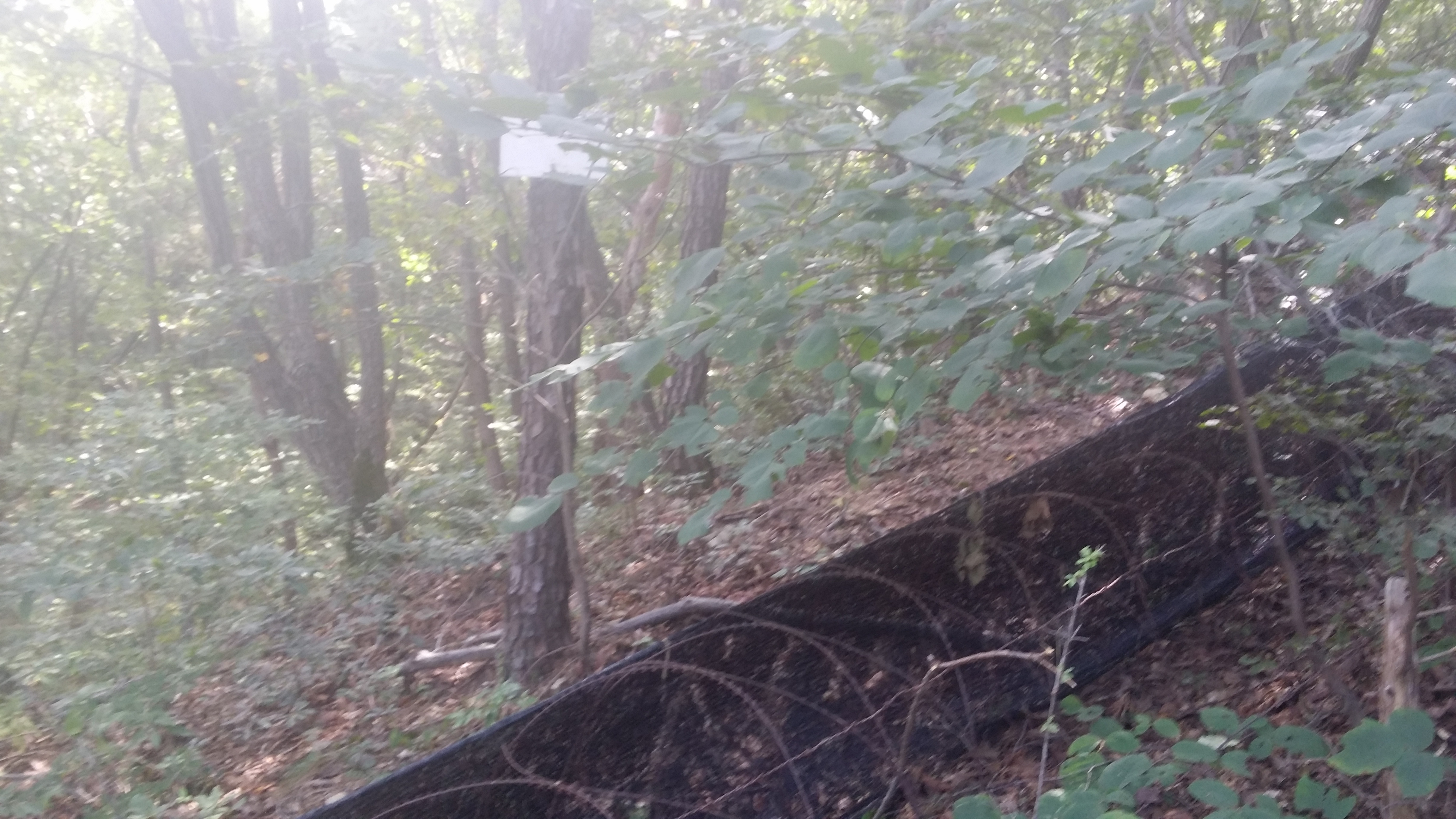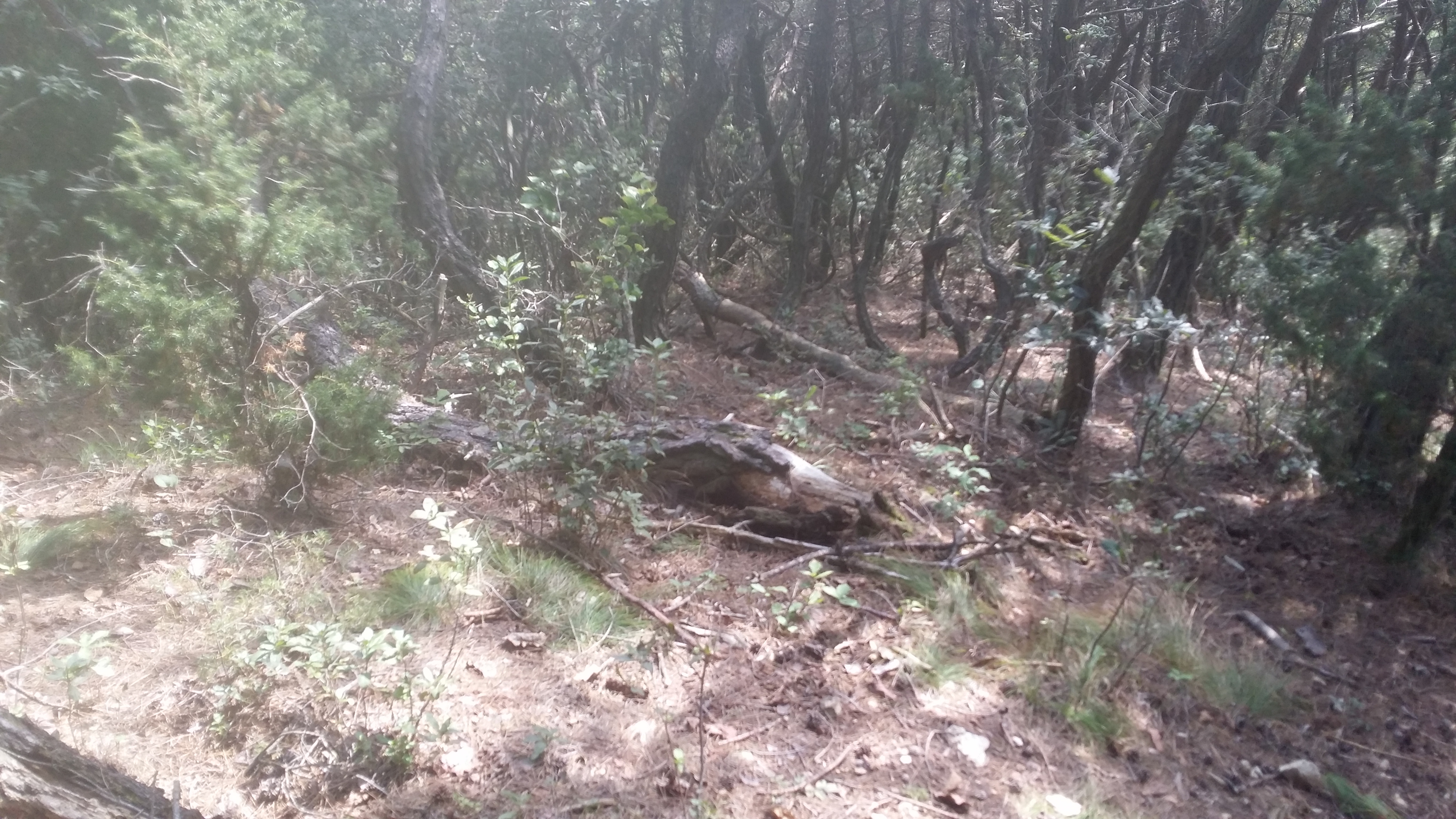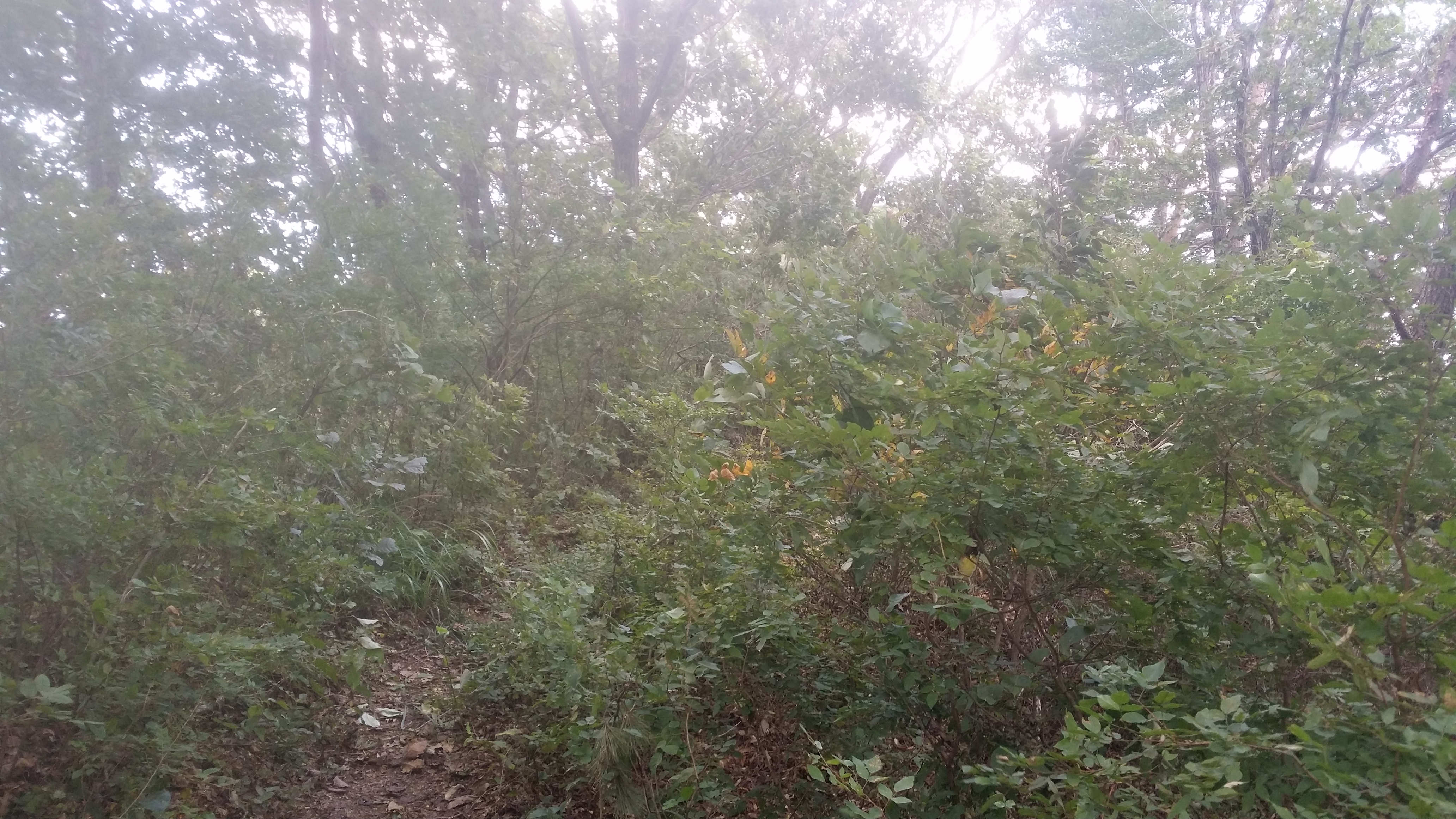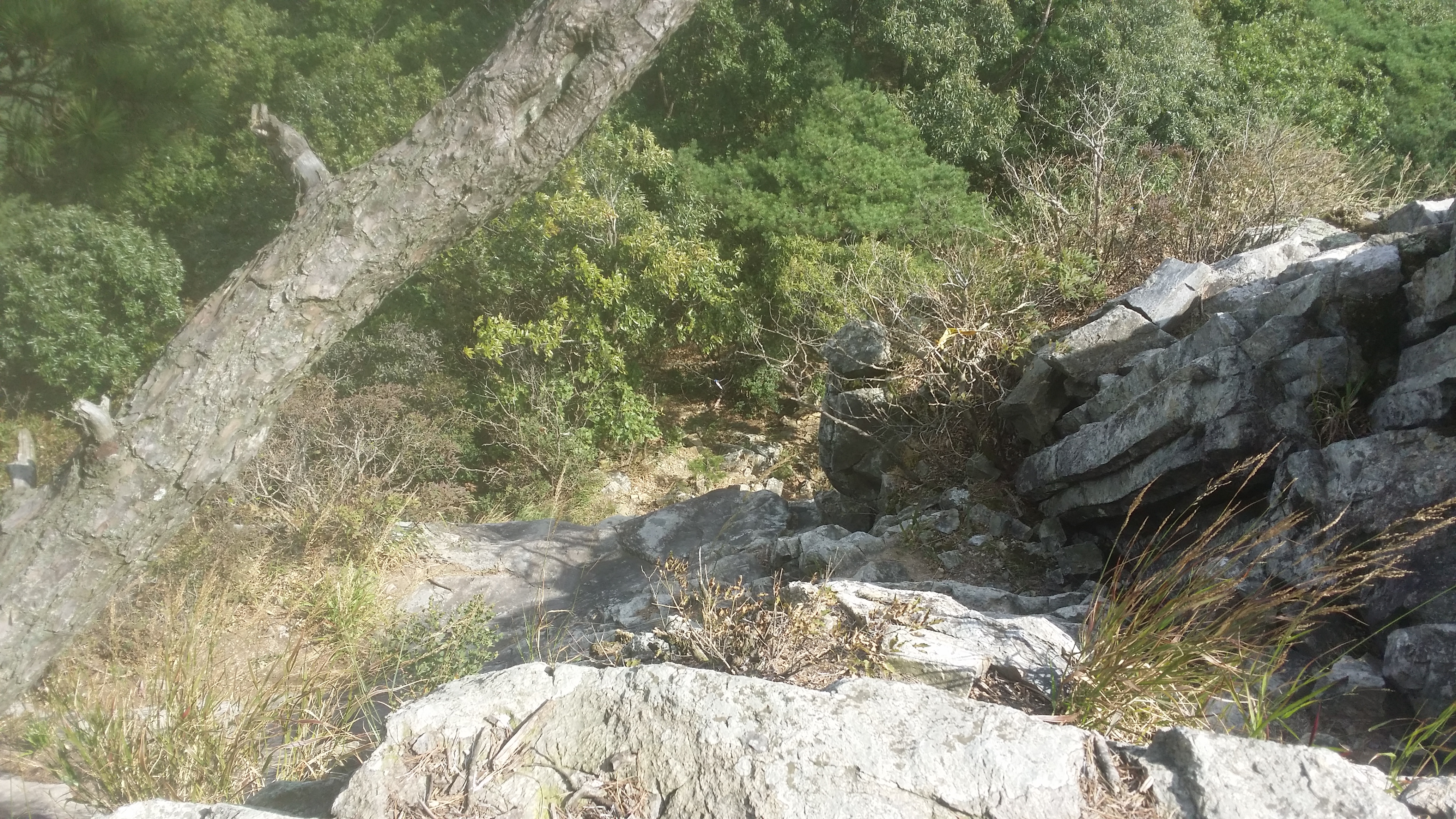 11:47~11:53 등로주의 / 신거리고개 마루금 하산길은 뚜렸한 등로가 없다. 능선에서 주로 좌측으로 우회하는것 같고, 우측으로 우회 등로도 있다. 좌측 우회등로(시그럴 多)를 지나 우측 우회등로로 내려서다 동지점에서 좌측으로 진입하여야 하는데 들어서면 능선따라 시그럴 및 등로가 보인다. 따라가면 안된다. 등로가 없는 직선방향을 바라보면 나뭇가지 사이로 파란색 지붕이 보일텐데 이놈을 따라 내려서면 된다. 급경사를 내려서면 그져사 희미한 등로가 나타난다
