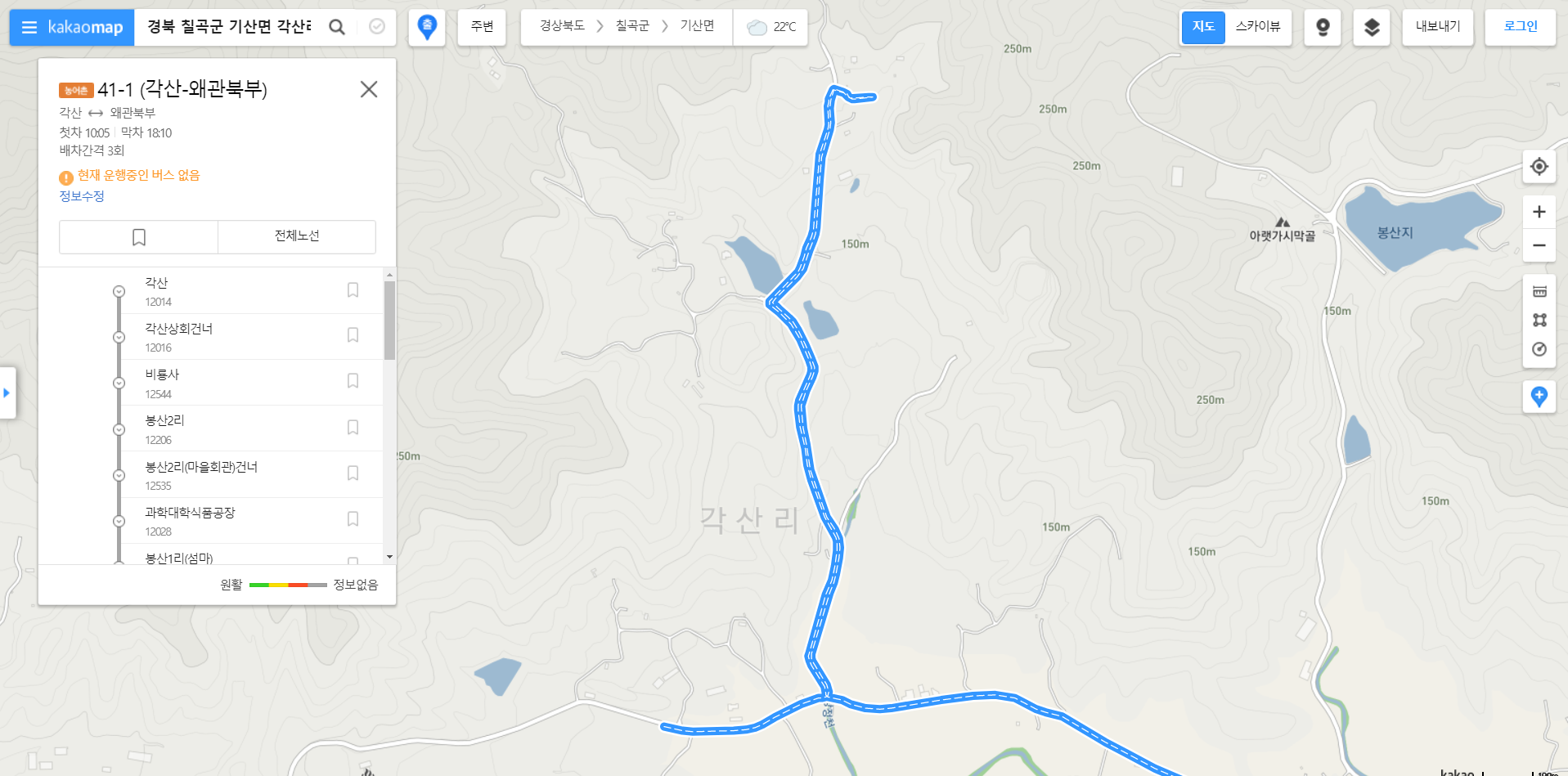 18시10분에 출발한다는데 18시7분 도착하여 바로 왜관으로 출발한다 포기하기엔 이르다 41-1번은 비룡사를 경유하기에 400m 이동하여 삼거리에서 종점 출발후 7분쯤 비룡사에서 내려오는 버스를 잡으면 된다